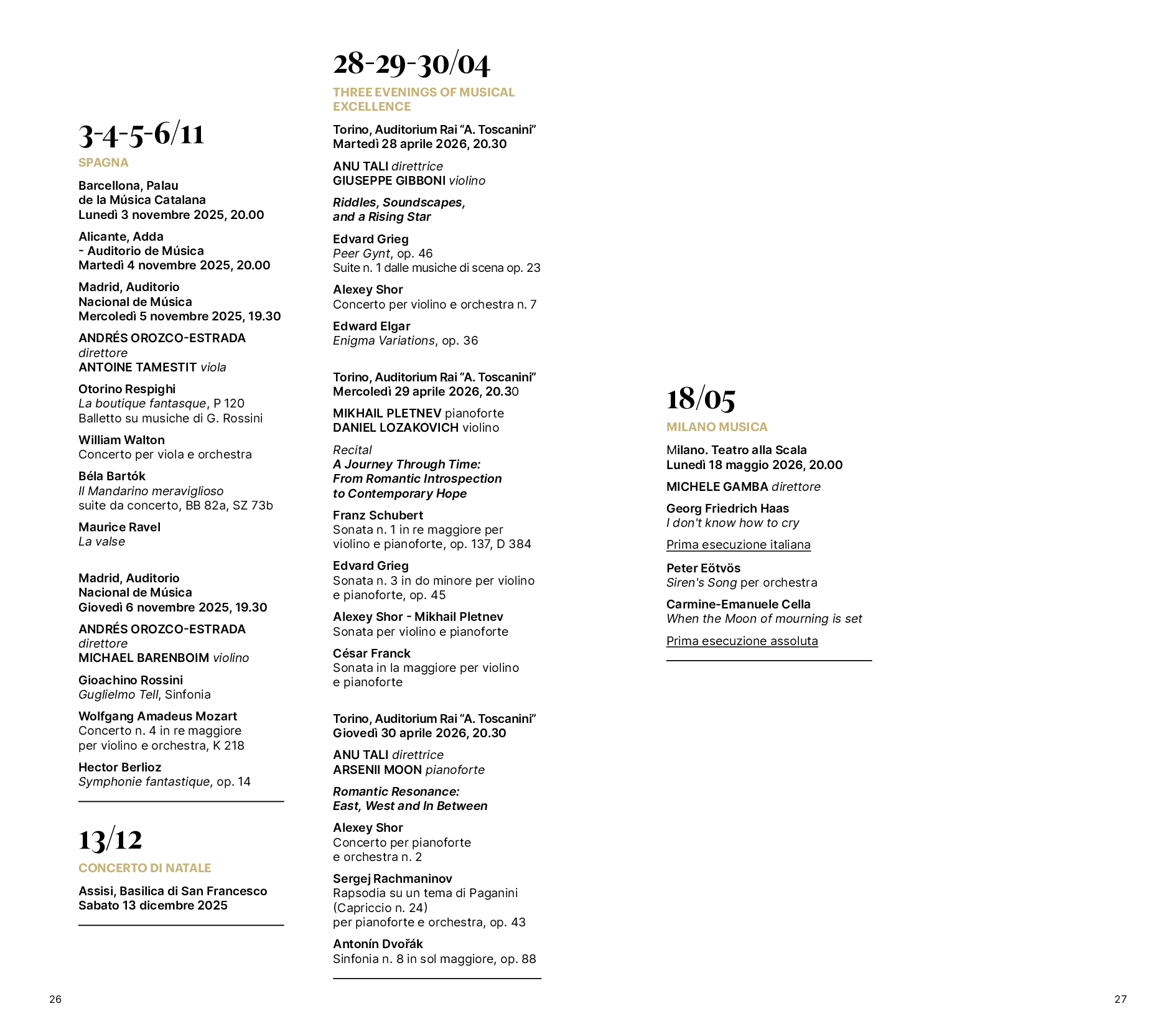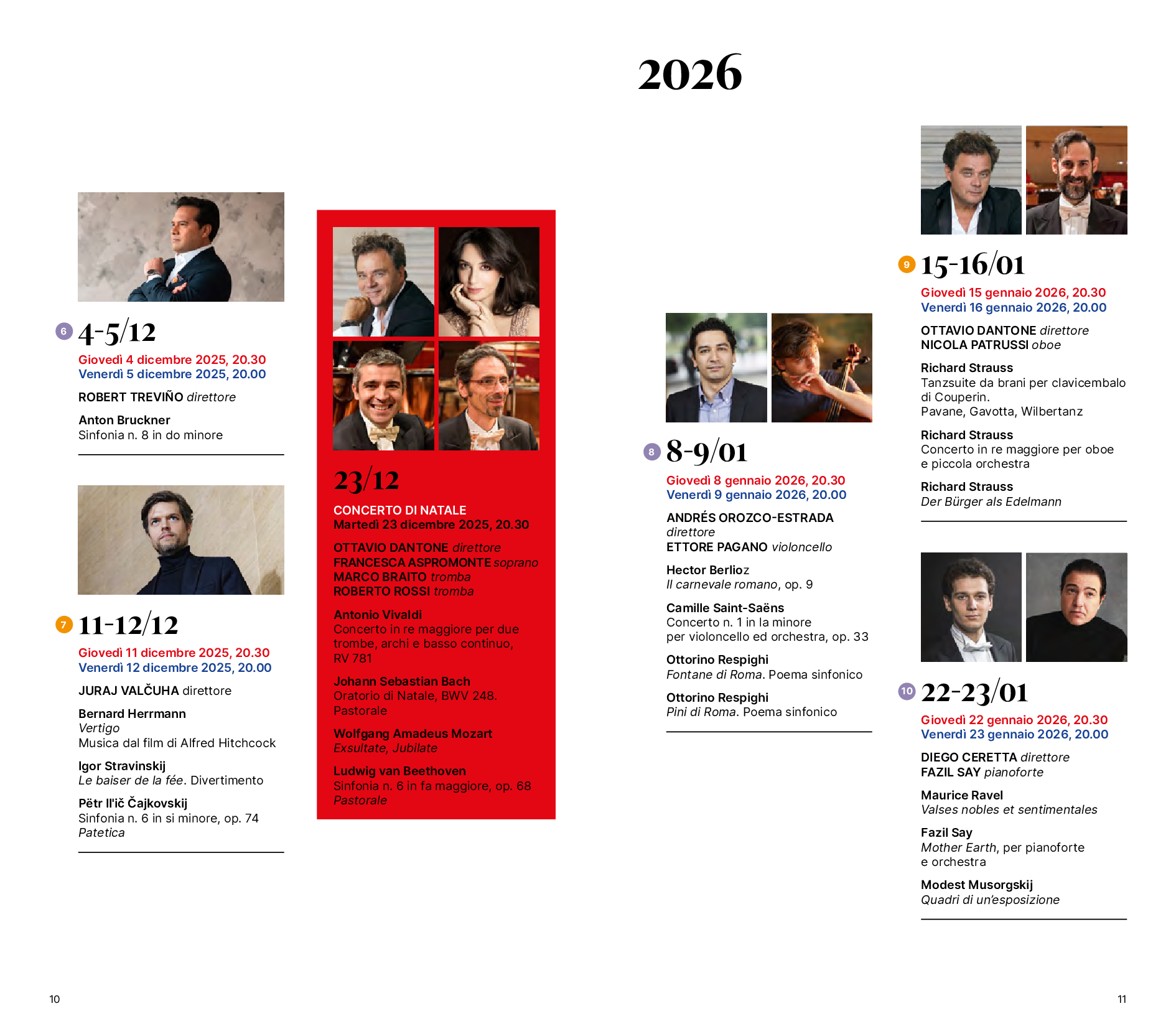 La stagione 2025/2026 segna altri importanti ritorni. Il 13 e il 14 novembre sale sul podio Alpesh Chauhan, insieme alla violinista Simone Lamsma; l’11 e il 12 dicembre è invece la volta di Juraj Valčuha, già Direttore principale della compagine dal 2009 al 2016, che accanto a musiche di Stravinskij e Čajkovskij propone una suite da Vertigo, film di Alfred Hitchcock con musiche di Bernard Herrmann. Ma a tornare alla guida della compagine Rai sono anche: Michele Mariotti, il 12 e il 13 febbraio, con un pianista del calibro di Kirill Gerstein impegnato nella Rapsodia su un tema di Paganini di Rachmaninov; Hannu Lintu, il 26 e il 27 marzo, affiancato dall’emergente talento del violino, al suo debutto con l’OSN Rai, Andrea Cicalese; Han-Na Chang, il 21 e 22 maggio, con Pablo Ferrández solista. I Concerti di Carnevale (17 febbraio) e di Pasqua (3 aprile) segnano invece il ritorno rispettivamente di John Axelrod e del giovane Giuseppe Mengoli, vincitore nel 2023 del Concorso Mahler dell’Orchestra Sinfonica di Bamberg e che con l’OSN Rai ha debuttato la scorsa stagione. Axelrod dirige i Carmina Burana di Orff, mentre Mengoli interpreta la Settima Sinfonia di Beethoven e lo Stabat Mater di Vivaldi. In quest’ultimo è impegnato come solista il controtenore Carlo Vistoli, che ha da poco inciso il capolavoro barocco e che debutta con l’OSN Rai.