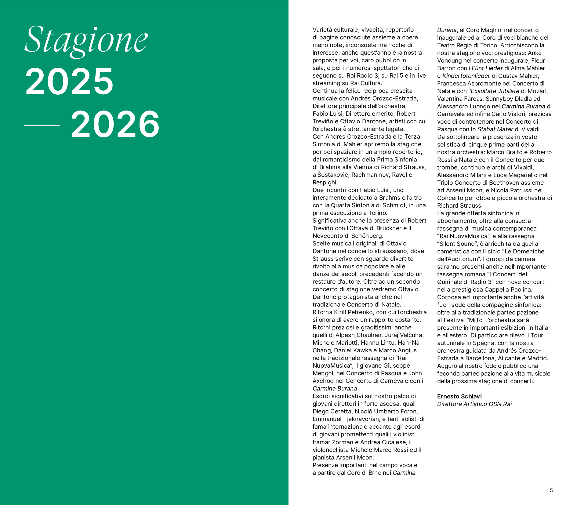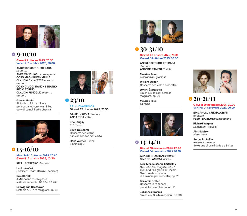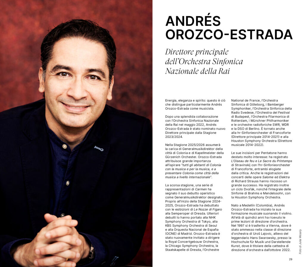 L’inaugurazione della stagione, giovedì 9 e venerdì 10 ottobre, è affidata al Direttore principale Andrés Orozco-Estrada, che in questa occasione propone la Sinfonia n. 3 di Mahler, imponente pagina del repertorio sinfonico del primo Novecento concepita dallo stesso autore come una cosmogonia in musica. Celebrativa della natura e dell’innalzamento della dimensione umana a quella spirituale, raggiunge l’apice con l’intervento di un coro femminile e delle voci bianche. A dar voce al Lied del quarto movimento il mezzosoprano Anke Vondung, interprete di rilievo del repertorio tedesco e al suo debutto con l’OSN Rai. Entrambe le serate sono in programma all’Auditorium Rai di Torino, come tutto il resto della stagione. Il concerto del 9 ottobre è proposto da Rai Cultura in diretta in prima serata su Rai5 oltre che su Radio3 e in streaming. Dopo la serata inaugurale, Orozco-Estrada tornerà sul podio in altre cinque occasioni, per un totale di sei presenze in stagione. A fine ottobre dirigerà la Sinfonia n. 9 di Šostakovič, affiancandola a due virtuosistiche pagine di Ravel (Alborada del gracioso e La valse) e al Concerto per viola e orchestra di William Walton con solista Antoine Tamestit. A gennaio proporrà, assieme a brani di Berlioz e Respighi, anche il Concerto n. 1 per violoncello e orchestra di Camille Saint-Saëns, che vedrà come solista il giovane Ettore Pagano, classe 2003 e recentemente insignito del prestigioso Premio Abbiati. A febbraio sarà invece la volta della Sinfonia n.1 di Brahms e del Concerto K 467 di Mozart con il pianista Mao Fujita. Ad aprile interpreterà la Sinfonia n. 2 di Rachmaninov e il Concerto in mi minore per violoncello e orchestra di Edward Elgar con la violoncellista Julia Hagen, che suona per la prima volta con la compagine Rai. A maggio, infine, dirigerà la prima esecuzione assoluta di Cratere di Leonardo Marino e il Concerto K 482 di Mozart, con Emanuel Ax al pianoforte.