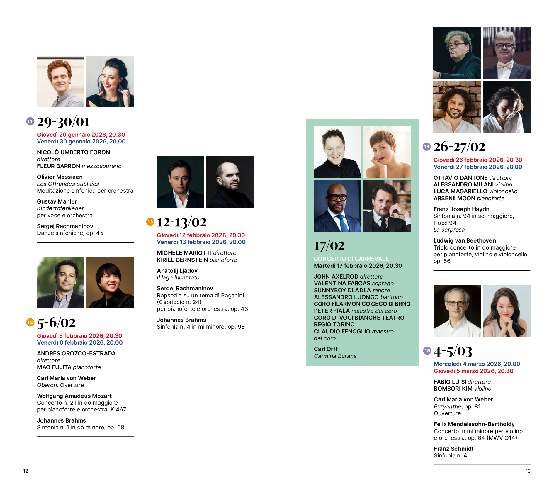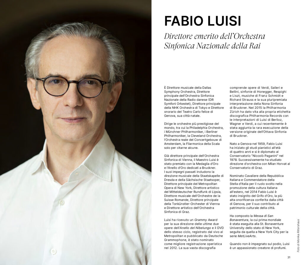 Il Direttore emerito Fabio Luisi sale sul podio in due occasioni. Il 4 e il 5 marzo propone il Concerto in mi minore per violino e orchestra di Mendelssohn con la violinista Bomsori Kim – al suo debutto con la compagine Rai – e la Sinfonia n. 4 di Franz Schmidt, compositore austriaco di cui Luisi è tra i più rinomati interpreti e il cui ciclo sinfonico ha inciso integralmente. Il 4 e il 5 giugno dirige invece l’ultimo concerto del cartellone, interamente dedicato a Brahms, del quale esegue la Sinfonia n. 2 e il Concerto per pianoforte e orchestra n. 2 insieme alla grande pianista Beatrice Rana.