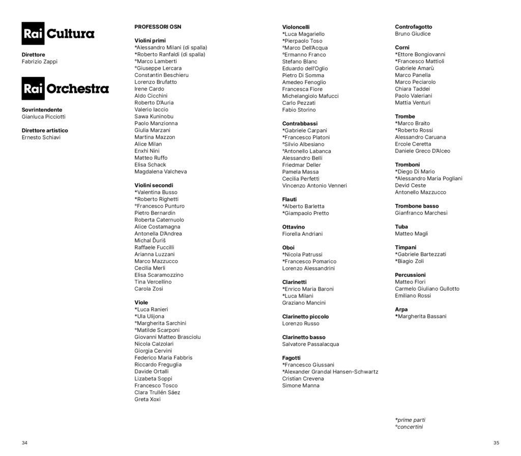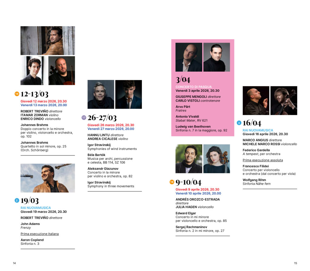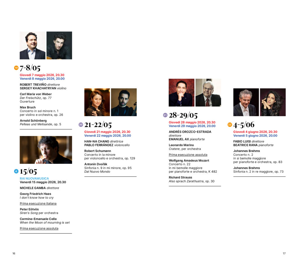 L’inaugurazione con la Terza Sinfonia di Mahler proposta dal Direttore principale Andrés Orozco-Estrada, che sale sul podio in altre cinque occasioni. Il ritorno di Kirill Petrenko. Il Direttore emerito Fabio Luisi, Robert Treviño e Ottavio Dantone. Bacchette di prestigio come quelle di Juraj Valčuha, Michele Mariotti, Alpesh Chauhan e Hannu Lintu. Tre giovani direttori in ascesa al loro debutto sul podio Rai: Diego Ceretta, Emmanuel Tjeknavorian e Nicolò Umberto Foron. Solisti di richiamo come Beatrice Rana, Kirill Gerstein, Emanuel Ax, Fazil Say, Antoine Tamestit, Sergey Khachatryan, Pablo Ferrández e Mao Fujita, cui si aggiungono le voci di Carlo Vistoli, Francesca Aspromonte e Anke Vondung. L’integrale delle quattro sinfonie di Brahms, ciascuna affidata a una diversa bacchetta, tre prime esecuzioni assolute, la prima italiana di Frenzy di John Adams e l’originale accostamento di lieder di Gustav Mahler e di sua moglie Alma interpretati dal mezzosoprano Fleur Barron.