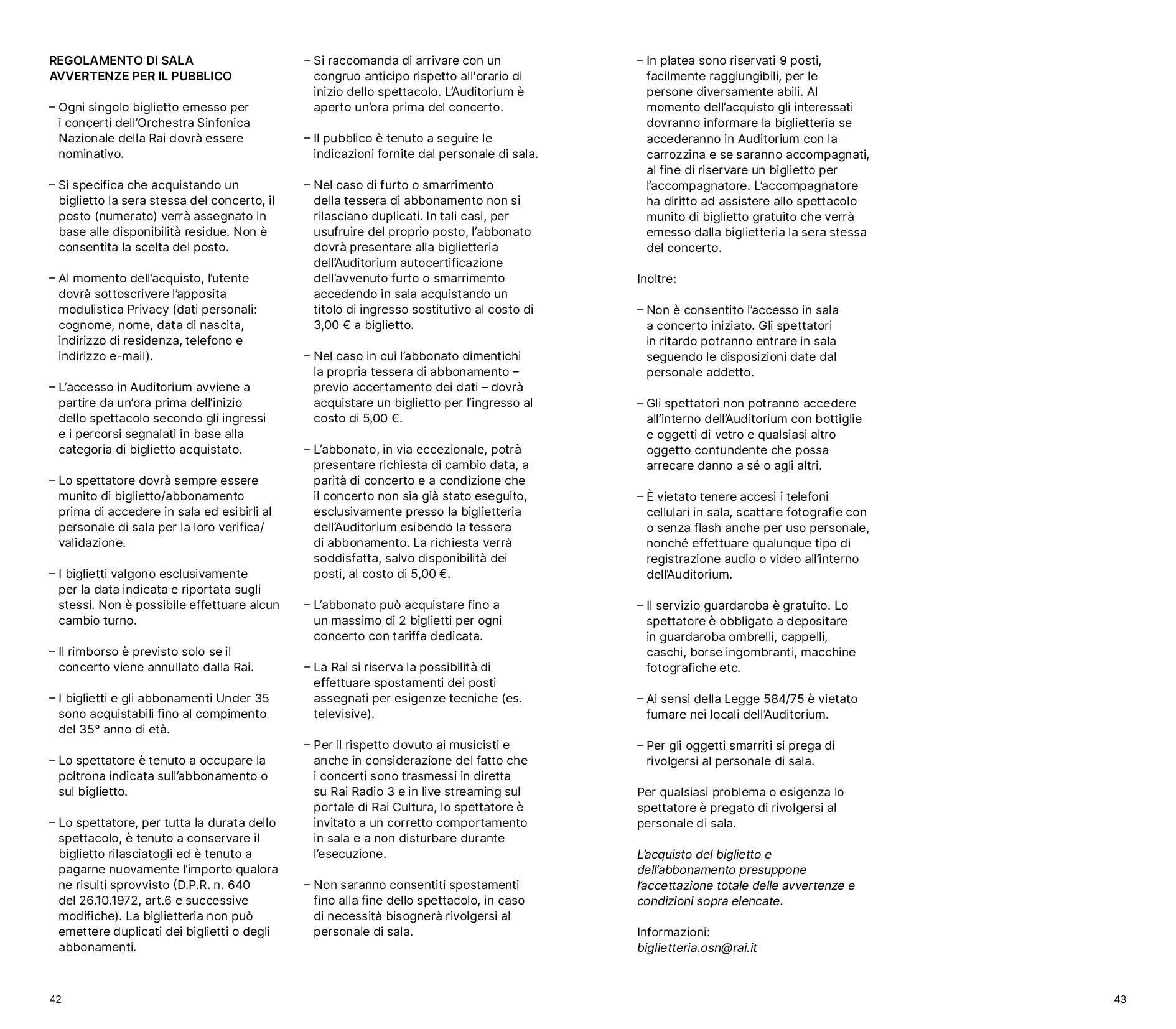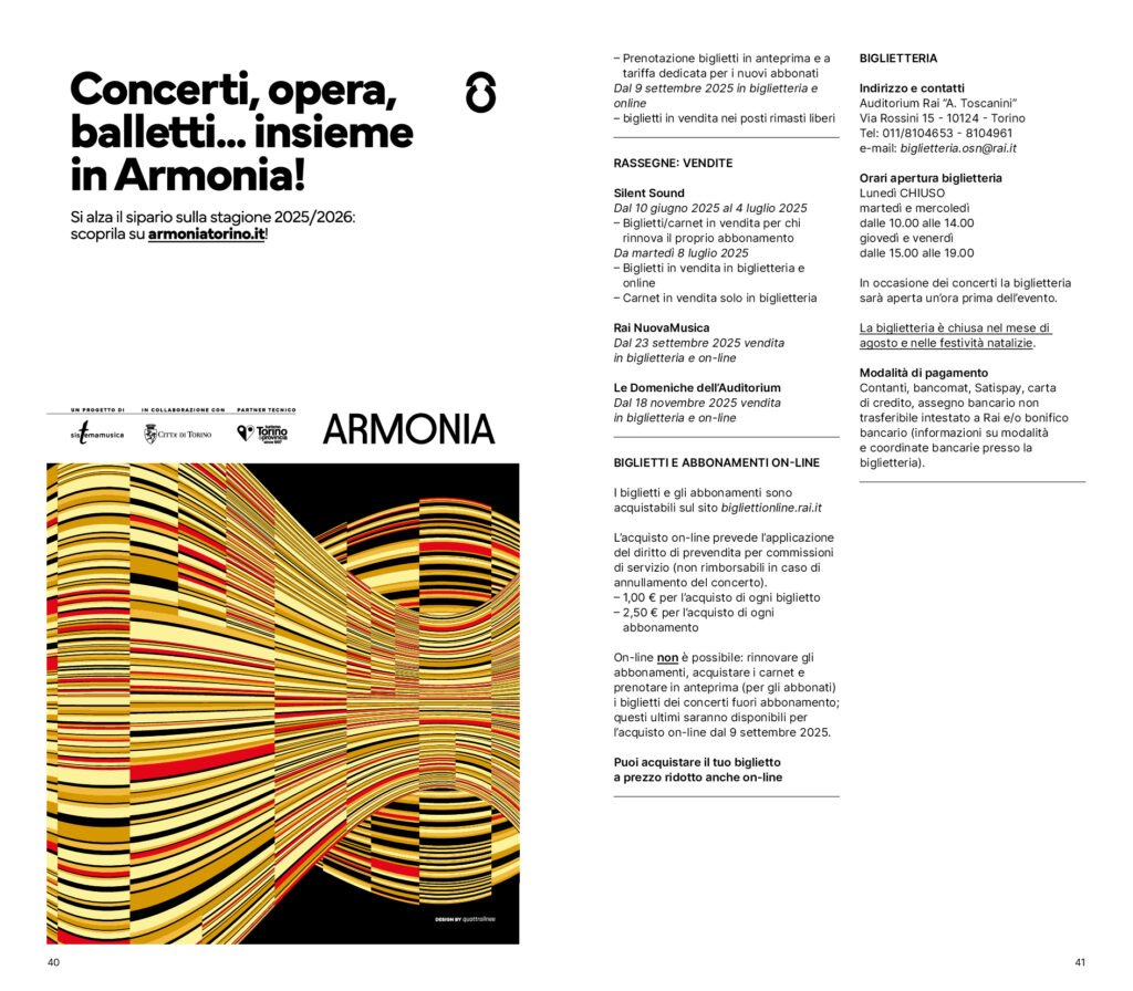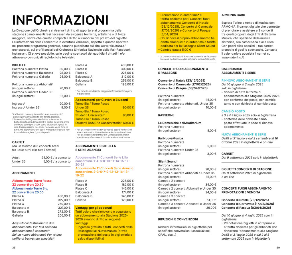 Gli abbonamenti alla “Stagione Sinfonica 2025/2026” sono in vendita presso la biglietteria dell’Auditorium Rai dal 10 giugno e online dall’8 luglio. I carnet – acquistabili solo in biglietteria – e i biglietti per i singoli concerti (biglietteria e online) sono in vendita a partire dal 9 settembre. Formule particolarmente vantaggiose sono proposte in caso di rinnovo dell’abbonamento, oltre che per i minori di trentacinque anni e per gli studenti.