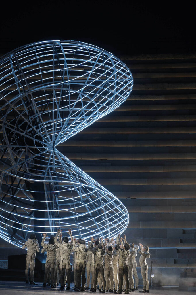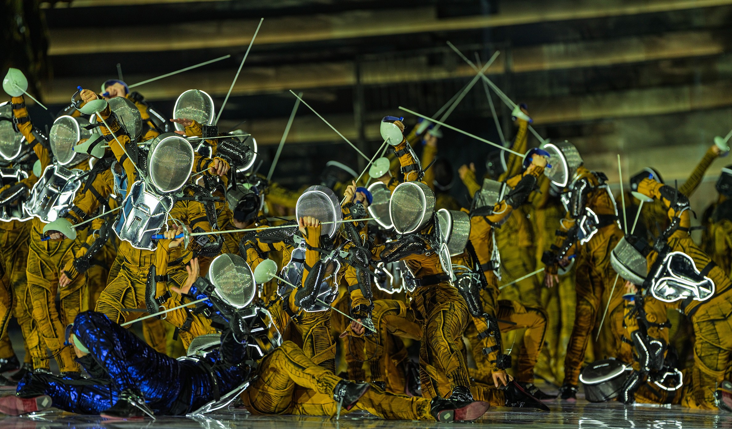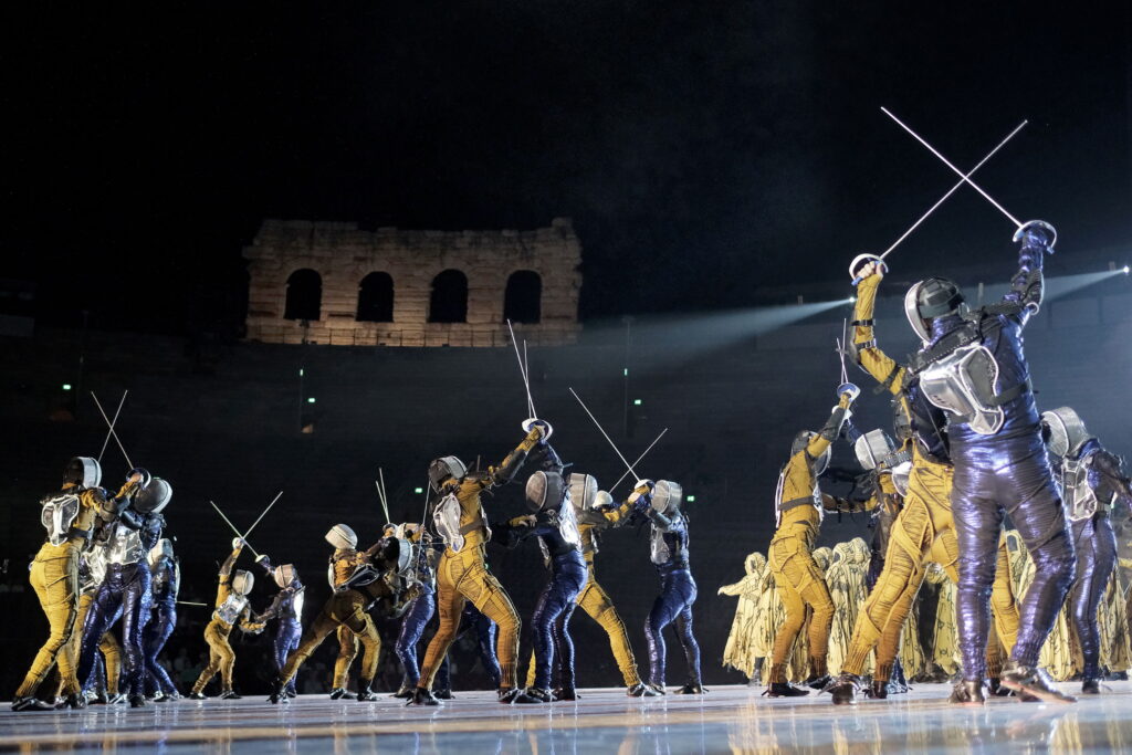 In scena la contrapposizione tra ragione e fede, tra tecnologia e filosofia. Due valori apparentemente distinti, due dimensioni rappresentate da altrettante semisfere, imponenti installazioni tecnologiche che ruotano per ricongiungersi nel finale. Come l’uomo che prima separa e divide, e poi ricostruisce, riunisce sperando di ritrovare l’armonia. Ad incombere, una grande clessidra, simbolo del Tempo e memento di ‘Vanitas’, pronta a rompersi e a liberare la vita dallo scorrere del tempo, dalla mortalità. E un’esplosione ‘atomica’ che, a 80 anni da Hiroshima e Nagasaki, è allo stesso tempo un monito e una riflessione sull’istinto autodistruttivo dell’uomo. Ma che ricorda anche quella esplosione generativa che diede vita all’Umanità, il Big Bang. Un connubio tra arti e discipline. Tra cui la scherma, sorprendente protagonista delle coreografie firmate da Poda e alla quale si stanno allenando più di 200 artisti.