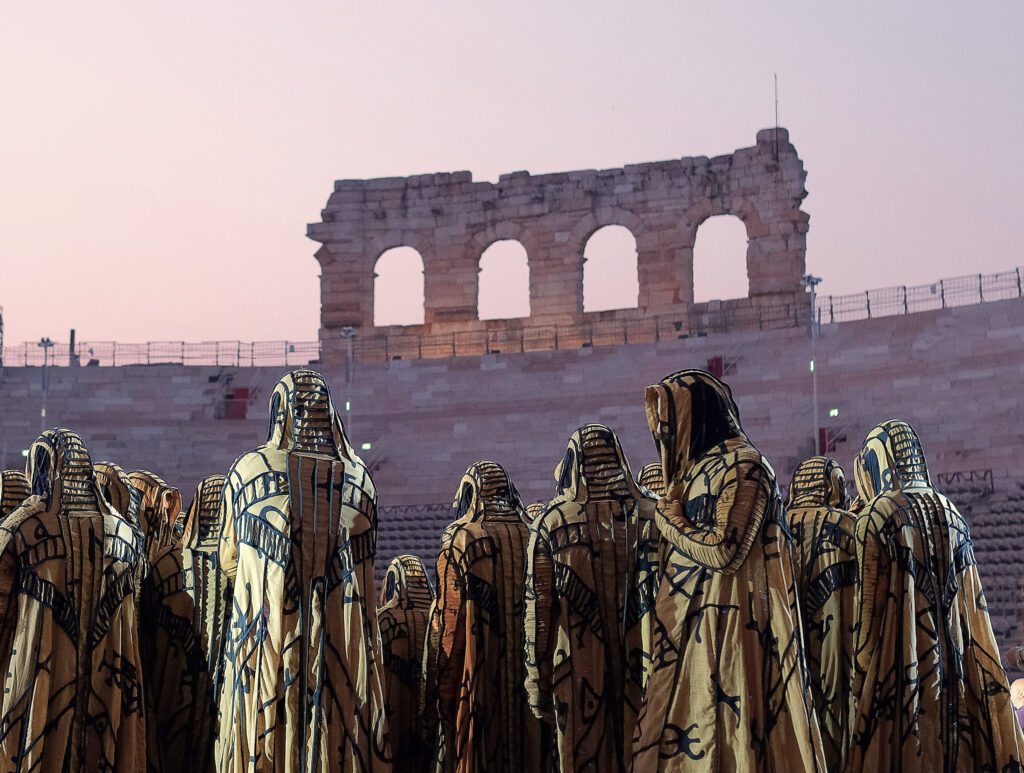 Venerdì 13 giugno si alza il sipario sul 102° Arena di Verona Opera Festival: Nabucco di Verdi, intenso affresco corale di ispirazione biblica, diventato “colonna sonora” del Risorgimento italiano, rivive in una produzione tutta nuova firmata in ogni aspetto dal visionario Stefano Poda. L’opera diventa un viaggio senza tempo dal conflitto alla riconciliazione, dalla superbia alla speranza, tra umanesimo e tecnologia: i popoli in conflitto di Nabucco sono tutti gli uomini, tutti i popoli, di ieri, di oggi, e forse di domani, che scoprono sé stessi attraverso la separazione, violenta e dolorosa ma con la speranza di un nuovo ricongiungimento. Una produzione che è anche una grandissima sfida tecnica per le maestranze areniane e per i numerosi laboratori coinvolti, con inedite soluzioni per i 3.000 costumi e spettacolari effetti scenici. In scena 400 tra artisti, mimi, figuranti, Ballo, impegnati in inedite coreografie di battaglia di scherma, e naturalmente il Coro, vero protagonista dell’opera.