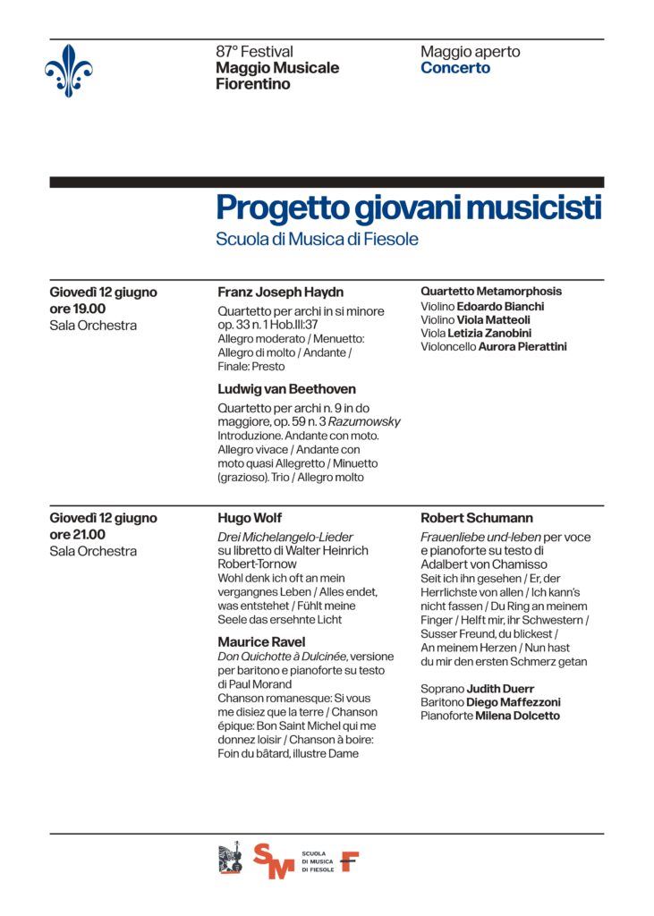 I due spettacoli – in programma in Sala Orchestra – rinnovano la fruttuosa collaborazione fra il Teatro del Maggio e la Scuola di Musica di Fiesole.