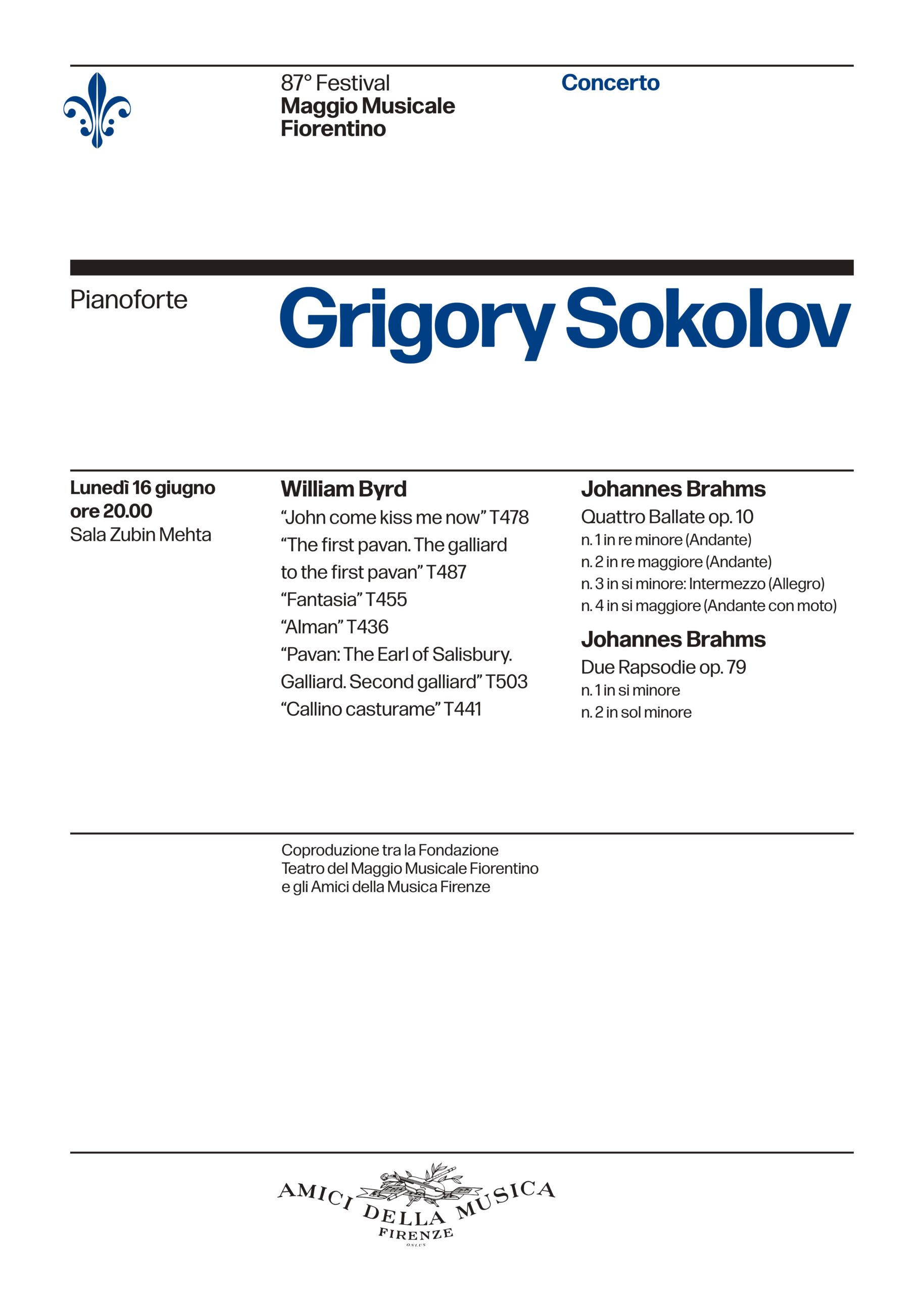 Lunedì 16 giugno 2025 alle ore 20, in Sala Zubin Mehta, torna al Maggio il pianista Grigory Sokolov.
