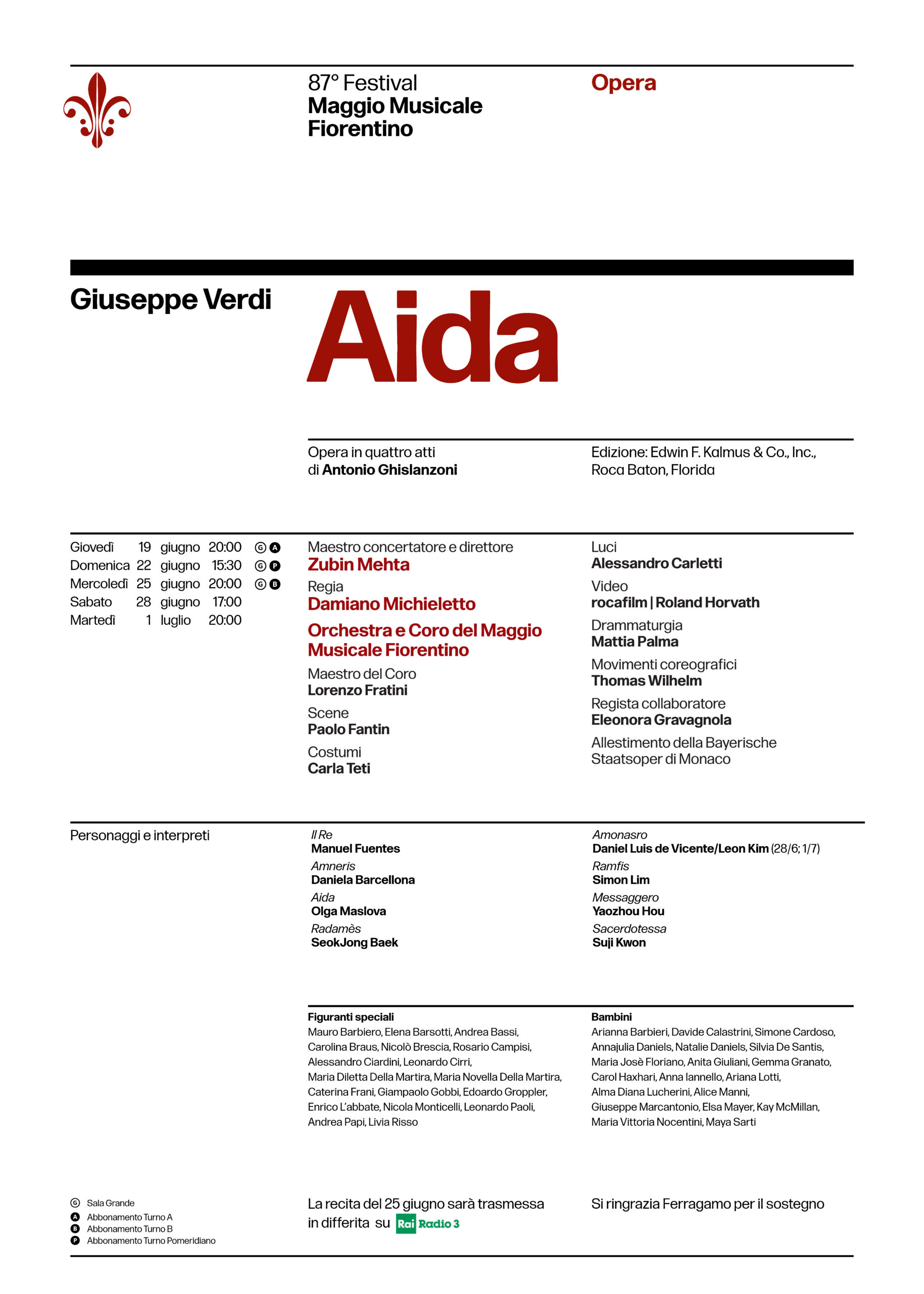 Il maestro Zubin Mehta ha reso Aida una delle colonne portanti del suo repertorio dirigendola a Firenze a più riprese: la prima volta fu in occasione del 32° Maggio Musicale, nel 1969, con la regia di Carlo Maestrini e le scene e i costumi di Enrico d’Assia; la seconda fu durante la Stagione Estiva del 1996 per la regia di Lorenzo Mariani con le scene e costumi di Raffaele Del Savio; più recentemente ha diretto l’allestimento di Aida della primavera del 2011 con la regia di Ferzan Özpetek e le scene di Dante Ferretti. Numerose anche le occasioni in cui il direttore emerito del Maggio ha portato l’opera in tournée insieme all’Orchestra e al Coro del Maggio, come in Giappone nel settembre del 1996 e, nel marzo del 2016, al Čajkovskij Concert Hall di Mosca.