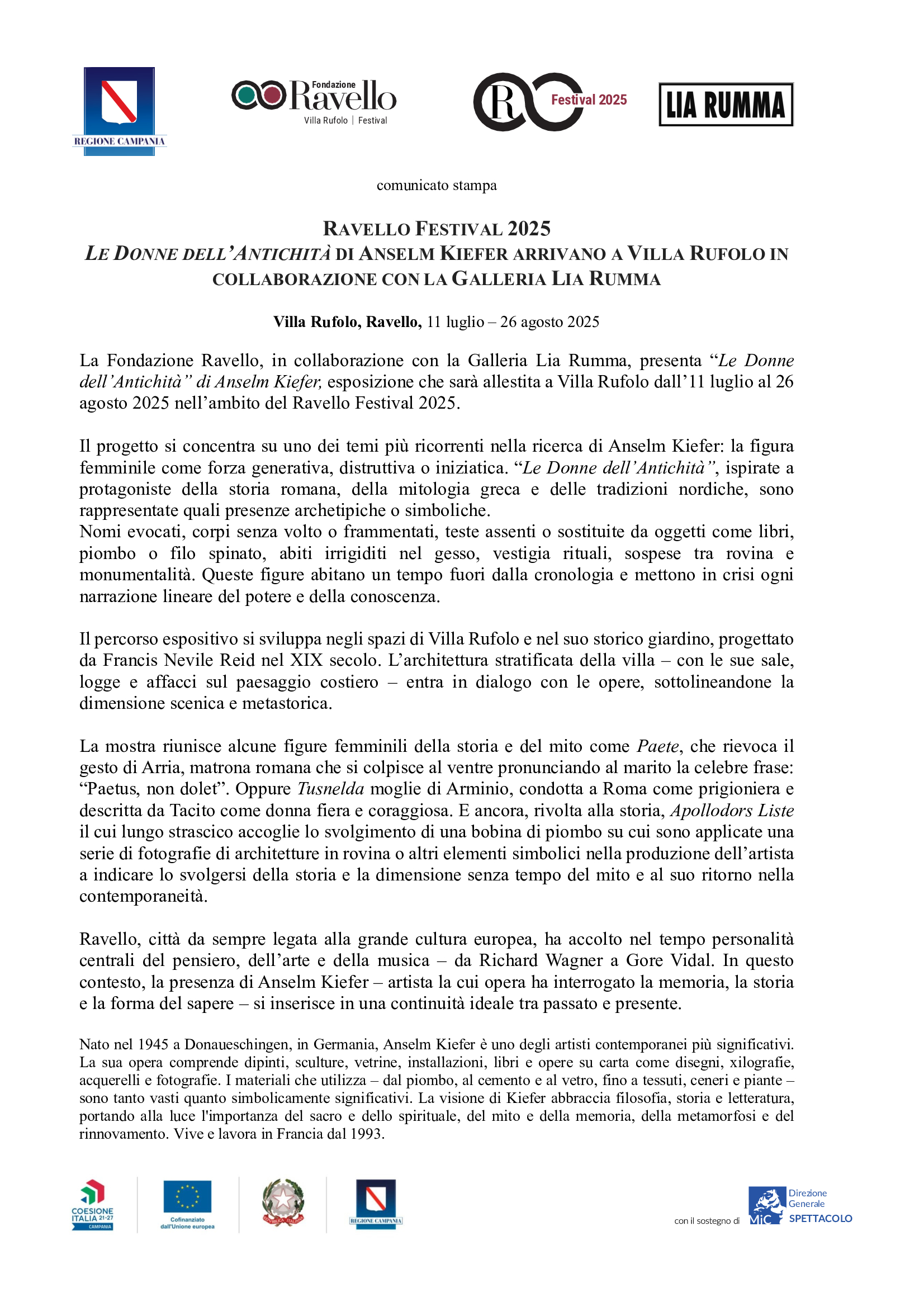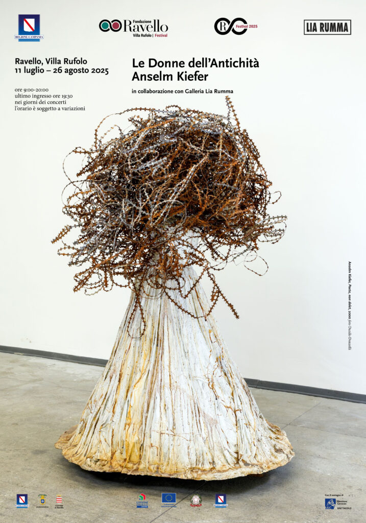 La Fondazione Ravello, in collaborazione con la Galleria Lia Rumma, presenta “Le Donne dell’Antichità” di Anselm Kiefer, esposizione che sarà allestita a Villa Rufolo dall’11 luglio al 26 agosto 2025 nell’ambito del Ravello Festival 2025.