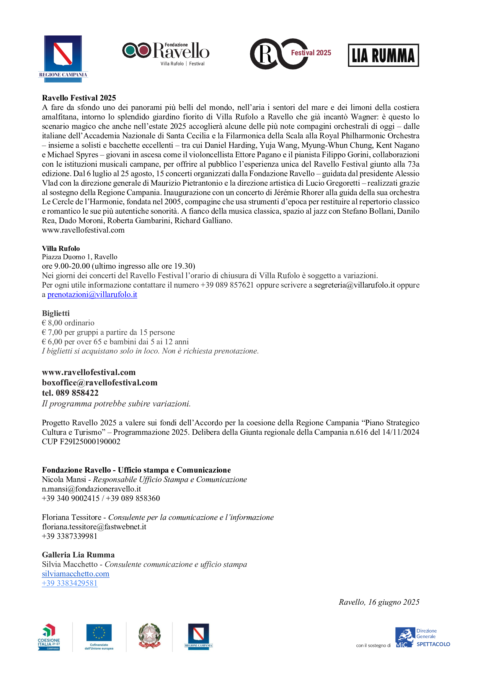 A fare da sfondo uno dei panorami più belli del mondo, nell’aria i sentori del mare e dei limoni della costiera amalfitana, intorno lo splendido giardino fiorito di Villa Rufolo a Ravello che già incantò Wagner: è questo lo scenario magico che anche nell’estate 2025 accoglierà alcune delle più note compagini orchestrali di oggi – dalle italiane dell’Accademia Nazionale di Santa Cecilia e la Filarmonica della Scala alla Royal Philharmonic Orchestra – insieme a solisti e bacchette eccellenti – tra cui Daniel Harding, Yuja Wang, Myung-Whun Chung, Kent Nagano e Michael Spyres – giovani in ascesa come il violoncellista Ettore Pagano e il pianista Filippo Gorini, collaborazioni con le istituzioni musicali campane, per offrire al pubblico l’esperienza unica del Ravello Festival giunto alla 73a edizione. Dal 6 luglio al 25 agosto, 15 concerti organizzati dalla Fondazione Ravello – guidata dal presidente Alessio Vlad con la direzione generale di Maurizio Pietrantonio e la direzione artistica di Lucio Gregoretti – realizzati grazie al sostegno della Regione Campania. Inaugurazione con un concerto di Jérémie Rhorer alla guida della sua orchestra Le Cercle de l’Harmonie, fondata nel 2005, compagine che usa strumenti d’epoca per restituire al repertorio classico e romantico le sue più autentiche sonorità. A fianco della musica classica, spazio al jazz con Stefano Bollani, Danilo Rea, Dado Moroni, Roberta Gambarini, Richard Galliano.