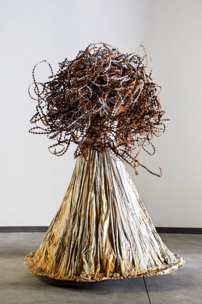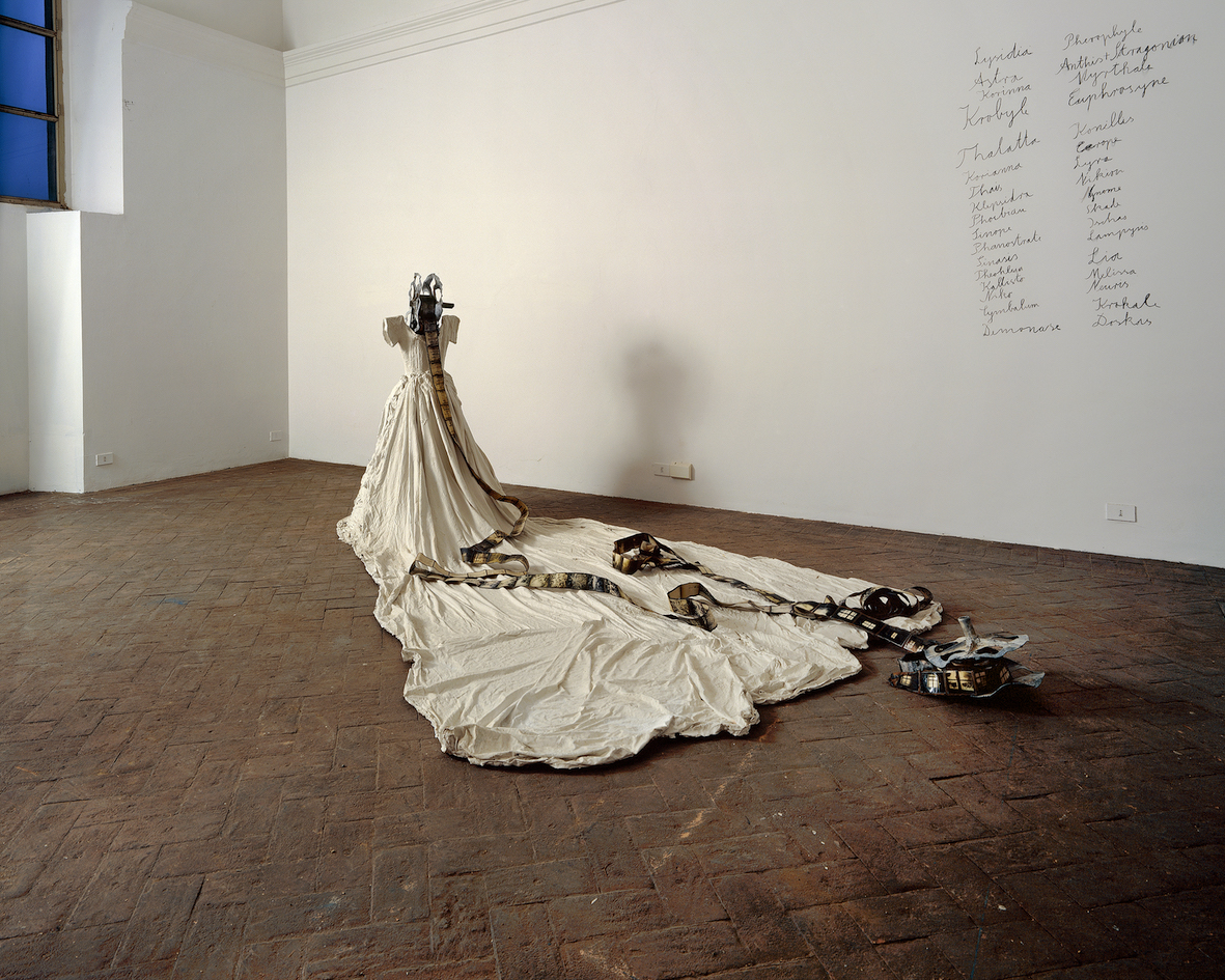 La mostra riunisce alcune figure femminili della storia e del mito come Paete, che rievoca il gesto di Arria, matrona romana che si colpisce al ventre pronunciando al marito la celebre frase: “Paetus, non dolet”. Oppure Tusnelda moglie di Arminio, condotta a Roma come prigioniera e descritta da Tacito come donna fiera e coraggiosa. E ancora, rivolta alla storia, Apollodors Liste il cui lungo strascico accoglie lo svolgimento di una bobina di piombo su cui sono applicate una serie di fotografie di architetture in rovina o altri elementi simbolici nella produzione dell’artista a indicare lo svolgersi della storia e la dimensione senza tempo del mito e al suo ritorno nella contemporaneità.