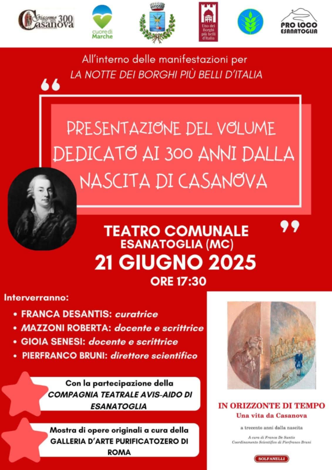 Si presenta in anteprima a Esanotoglia Macerata il 21 giugno Un volume a più voci per Solfanelli Editore di Pierfranco Bruni* Si inizia con le presentazioni ufficiali il volume dedicato a Giacomo Casanova. Il nostro Casanova non è un libertino. È un rivoluzionario tout court ed è un seduttore che si è perso nel tempo e ha ritrovato l’amore nella solitudine e nella memoria. Non l’ha cercato, ma ha vissuto.” Pierfranco Bruni Un libro che rilegge il seduttore in un Orizzonte di tempo per Solfanelli editore. Con il contributo di diversi studiosi, a cura di Franca De Santis. Una vita da Casanova? Il tempo corre lungo le pareti dell’esistenza. Una rappresentazione dei giorni che formano un mosaico tra luoghi e viaggi, tra città e amori la cui sensualità è seduzione ricercata e vissuta. Giacomo Casanova è molto di più che un “libertino”. Le sue avventure, tra la fine dell’Ottocento e i primissimi del Novecento, ci mostrano un personaggio.