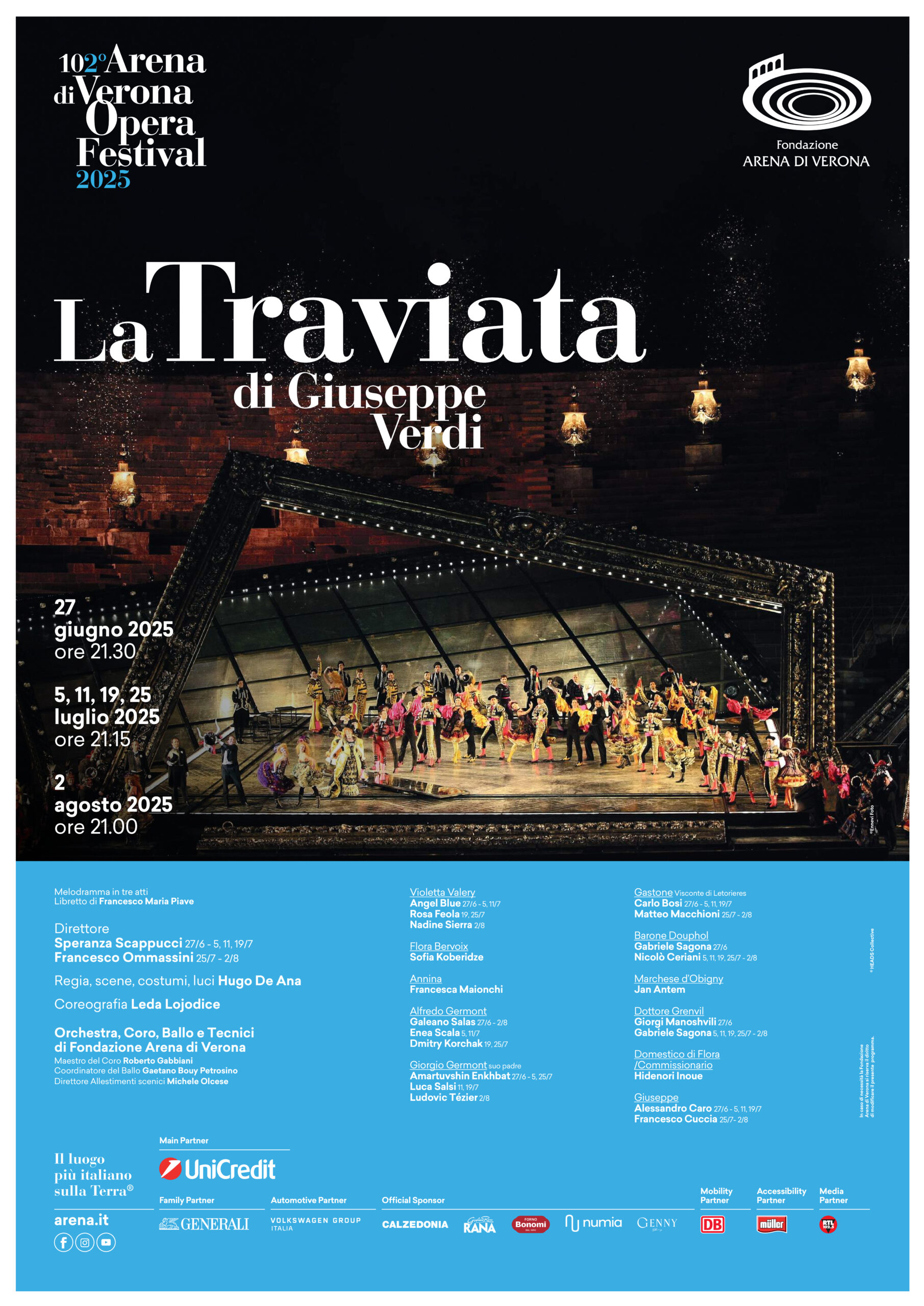 L’Arena di Verona Opera Festival 2025 conta sul sostegno di numerosi sponsor, in primis UniCredit, che vanta una longevità di collaborazione di oltre 25 anni, e poi Calzedonia, Pastificio Rana, Volkswagen Group Italia, DB Bahn, Forno Bonomi, Numia, RTL 102.5, Genny, che ha firmato le divise del personale adibito all’accoglienza del pubblico, e Müller, che sostiene i progetti di accessibilità dedicati alle persone con disabilità. Tra gli official partner marchi storici quali Veronafiere, Air Dolomiti, A4 Holding, Metinvest, SABA Italia, SDG Group, Sartori di Verona, Palazzo Maffei e Mantova Village. Così come Calvisius Arena Foyer, ManPower Group e Consorzio di Tutela dell’Aceto Balsamico Tradizionale di Modena DOP e Ferroli. Oltre a imprese, privati, ordini professionali che compongono la schiera della Membership 67 Colonne per l’Arena di Verona, fondata da Gianluca Rana dell’omonimo pastificio e da Sandro Veronesi, patron del Gruppo Oniverse, con il Gruppo Editoriale Athesis, media partner.