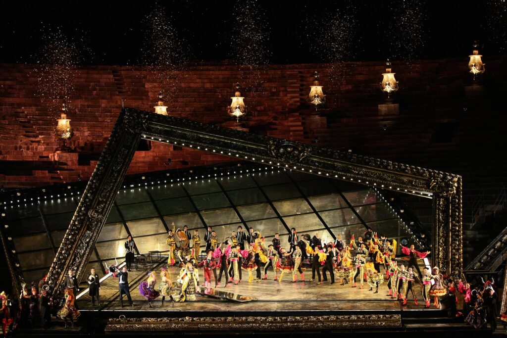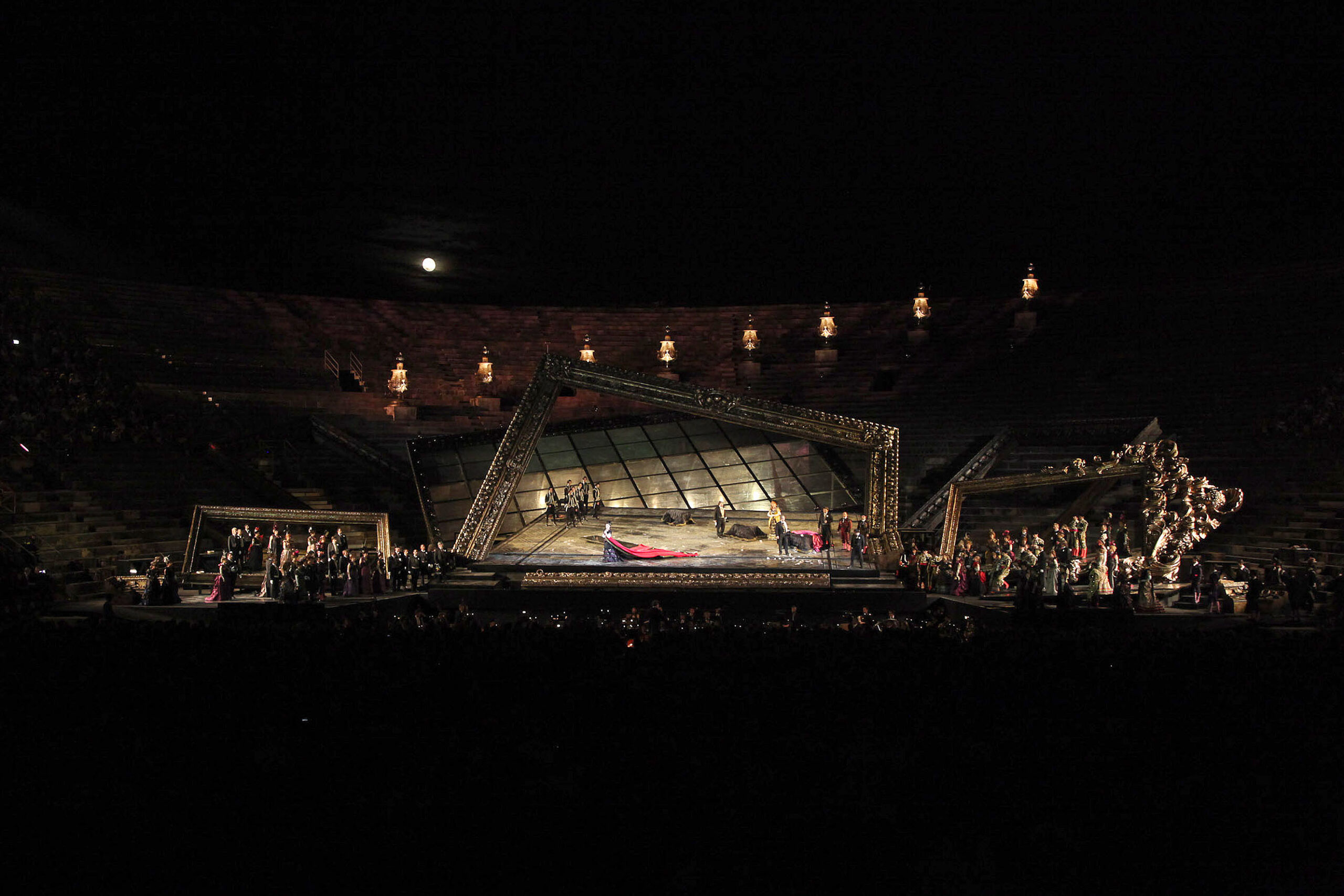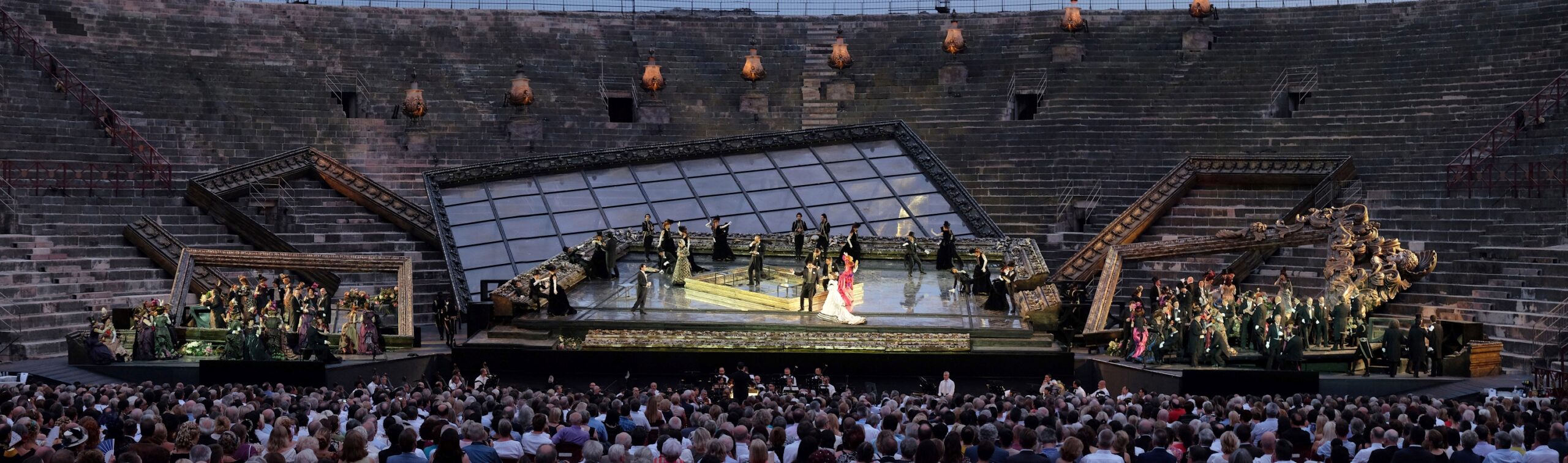 L’opera oggi più rappresentata al mondo destò in realtà grande scandalo già al suo apparire a Venezia nel 1853: la storia d’amore e redenzione di una mantenuta era destinata a suscitare diffidenza e chiamare in causa il pubblico borghese, che si poteva riconoscere nel bel mondo che in scena lusinga e festeggia la protagonista per poi abbandonarla. Qualcosa di simile all’isolamento di Violetta e al giudizio borghese, Verdi lo conobbe a Busseto, dove, da tempo vedovo e già compositore di successo, tentò di iniziare una nuova vita convivendo con Giuseppina Strepponi. A vincere fu il senso di Verdi per il teatro: la storia di Alphonsine Plessis, trasformata in Marguerite da Dumas, sarebbe divenuta immortale con Violetta. Un successo costante, crescente, dall’opera al cinema, al mito. E anche in Arena, dove arrivò tardi (nel 1946) ma da allora collezionando 147 rappresentazioni, quinto titolo più frequente in Anfiteatro. Lo spettacolo di De Ana del 2011 sarebbe tornato nel 2013 e nel 2016, quindi in scena in questo 102° Festival.