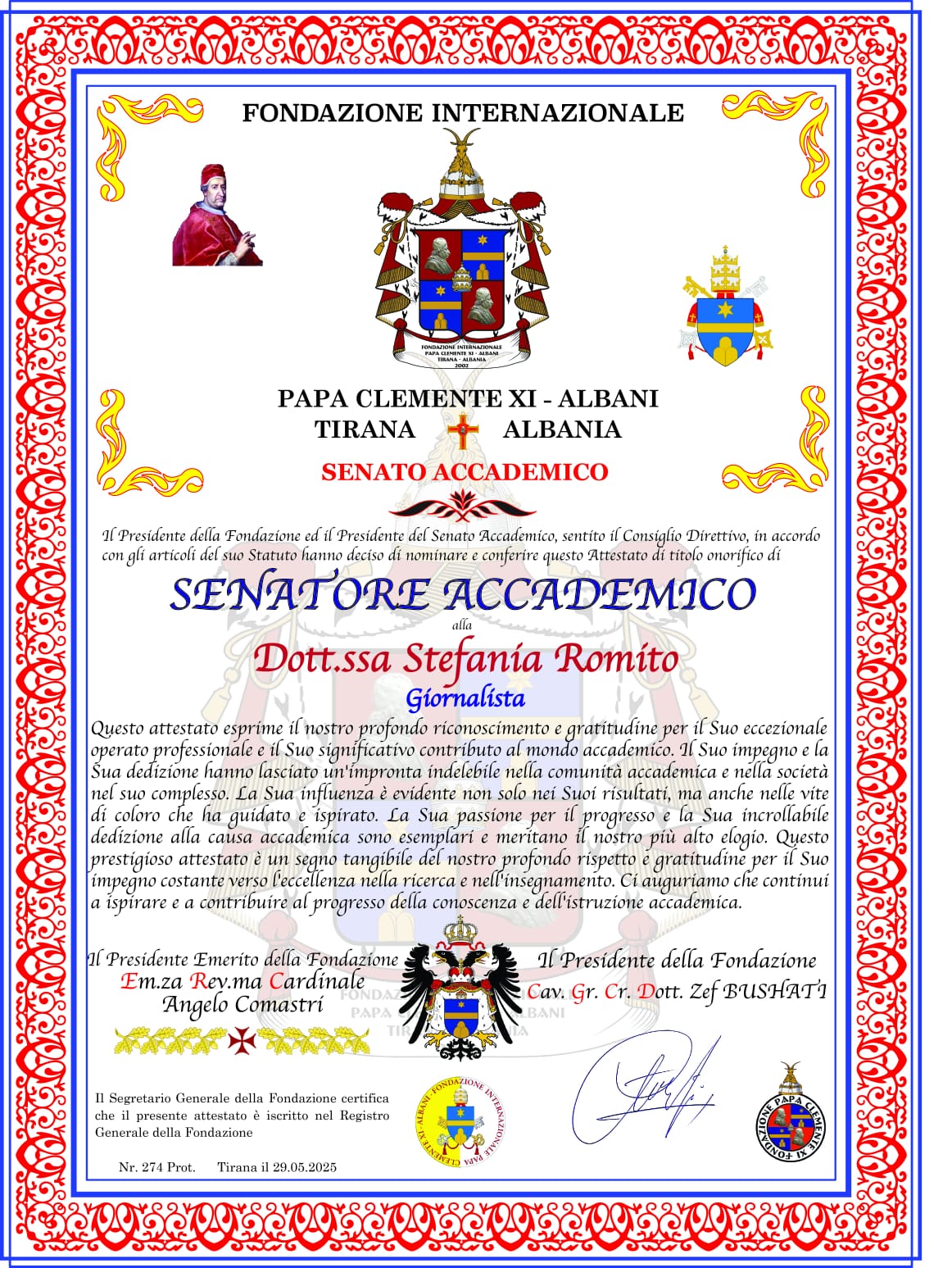 Prestigiosa onorificenza accademica conferita a Stefania Romito dalla Fondazione Internazionale “Papa Clemente XI – Albani” di Tirana