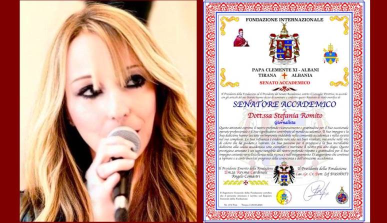 La scrittrice e giornalista italiana Stefania Romito è stata insignita del prestigioso titolo onorifico di «Senatore Accademico» conferito dalla Fondazione Internazionale “Papa Clemente XI – Albani” di Tirana, Albania. Il riconoscimento, assegnato dal Senato Accademico della Fondazione, attesta l’eccellenza del suo operato professionale e il significativo contributo al mondo accademico, culturale e letterario a livello internazionale.