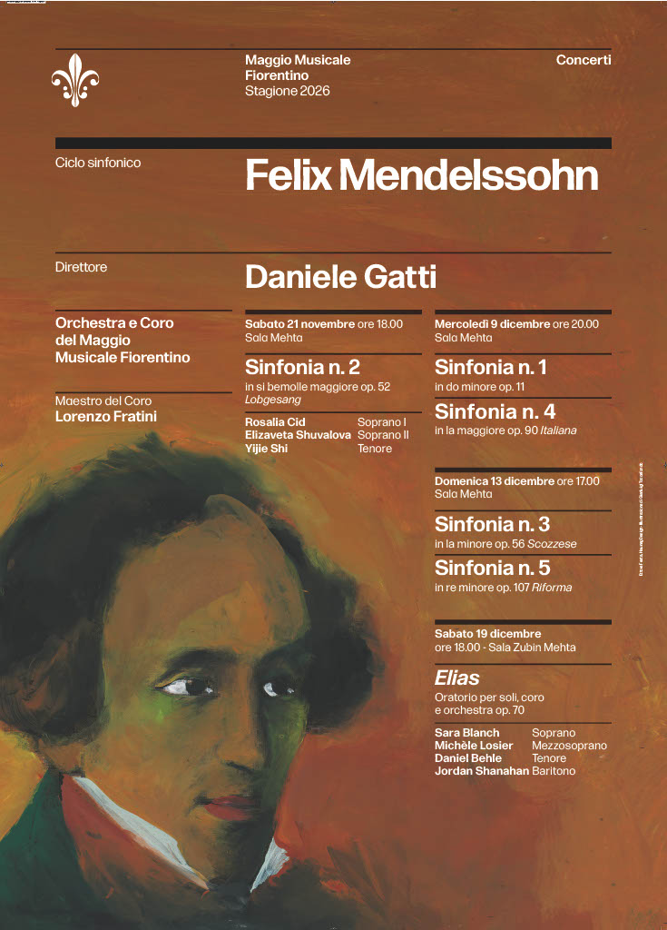 Daniele Gatti, direttore musicale del Maggio a partire dall’aprile 2026 nel corso dell’88esimo Festival proporrà il primo dei due importanti cicli sinfonici che offrirà al pubblico: l’integrale delle nove sinfonie di Ludwig van Beethoven in quattro appuntamenti a partire dal 18 giugno (Sinfonie n.1, 4, 7), il 23 giugno (Sinfonie 5 e 6), 28 giugno (Sinfonie 2 e 3) e 1 luglio (sinfonia 8 e Sinfonia 9 con le voci soliste di Mariangela Sicilia, Eleonora Filipponi, Bernard Richter e Jongmin Park e il Coro diretto da Lorenzo Fratini). Il secondo ciclo è dedicato a Felix Mendelssohn; il primo concerto è in cartellone il 21 novembre con la Sinfonia n.2 Lobgesang (solisti: