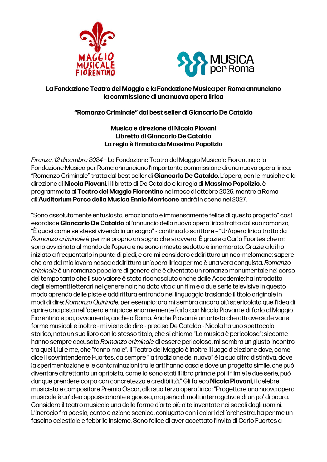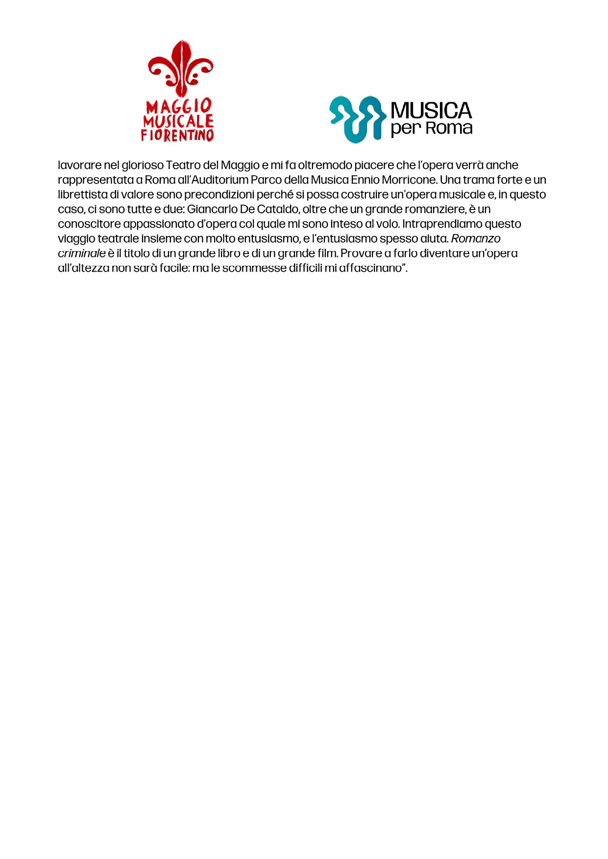 Un ballo in maschera, Simon Boccanegra, Tosca, I racconti di Hoffmann: titoli amati, carichi di tradizione e bellezza ma anche di inquietudini che parlano del presente. Il doppio binomio verista Pagliacci/Cavalleria Rusticana riporta in scena un teatro crudo, passionale, dove ogni gesto è vita o morte. E poi Giulio Cesare di Händel: il barocco come specchio del potere, della seduzione e dell’ambiguità. Ma è nella frattura, e forse nell’azzardo – continua Fuortes – che il cartellone del 2026 trova la sua voce più forte. Con The Death of Klinghoffer di John Adams, titolo di forte impatto politico e civile, l’opera si apre al mondo e alle sue ferite ancora aperte. Wozzeck di Berg scava nella follia, nel disagio, nel linguaggio frammentato del nostro tempo. La voce umana di Poulenc e Il castello di Barbablù di Bartok raccontano, ciascuno a modo suo, il dolore muto e la distanza tra le persone. Il presente entra in scena con forza grazie a Romanzo criminale, nuova commissione del Maggio e di Musica per Roma, dall’omonimo romanzo di Giancarlo De Cataldo, che cura il libretto e con la musica di Nicola Piovani. Una storia italiana, cruda e affascinante, che diventa teatro musicale per la prima volta: un ponte tra il linguaggio del cinema, del noir e la forza evocativa della musica dal vivo.”