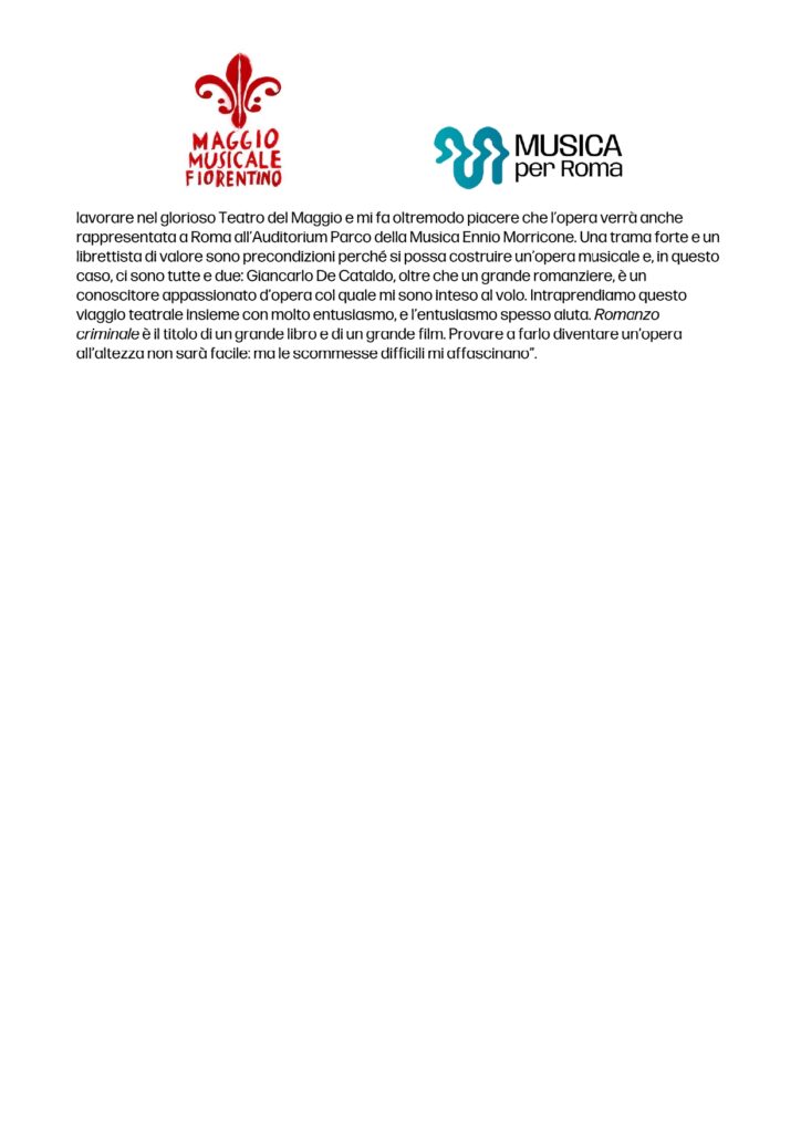 A quest’opera novecentesca – Berg completò Wozzeck nel 1922 – segue in cartellone a partire dal 23 ottobre con tre repliche successive una importante commissione del Teatro del Maggio e di Musica per Roma: Romanzo criminale, tratto dal best seller di Giancarlo de Cataldo. Il romanzo di De Cataldo ha dato vita a un film e a due serie televisive, ora approda su un palcoscenico lirico. La partitura è composta da Nicola Piovani che dirigerà anche l’opera, il libretto è di Giancarlo De Cataldo, la regia è di Massimo Popolizio (che nel film era uno degli attori e che impersonava il Terribile), le scene sono di Margherita Palli, i costumi di