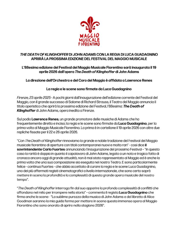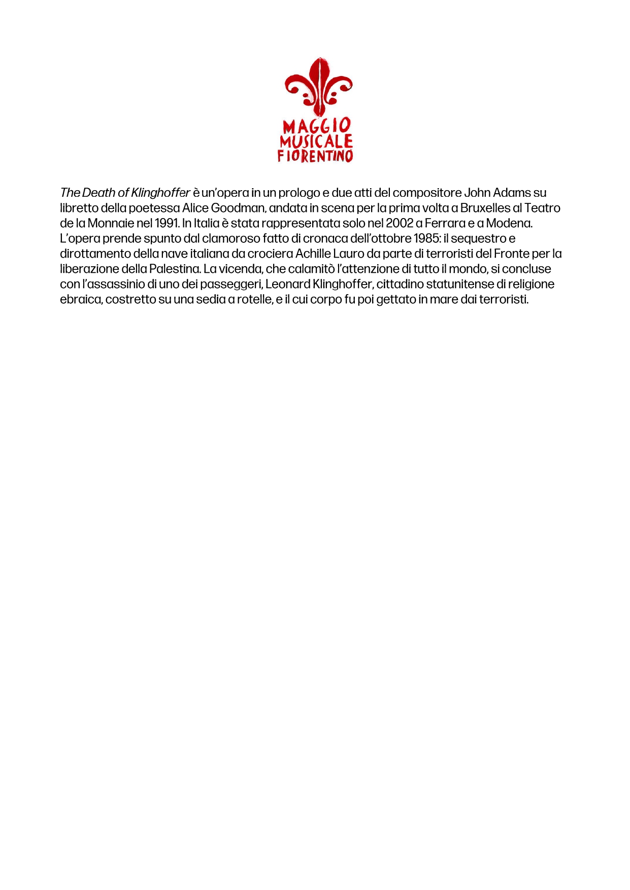 Il Festival del Maggio Musicale Fiorentino che giunge alla sua 88esima edizione, si apre domenica 19 aprile con un titolo che rinnova la grande e nobile tradizione del Festival di inaugurazioni con opere contemporanee nuove e molto rare: The Death of Klinghoffer