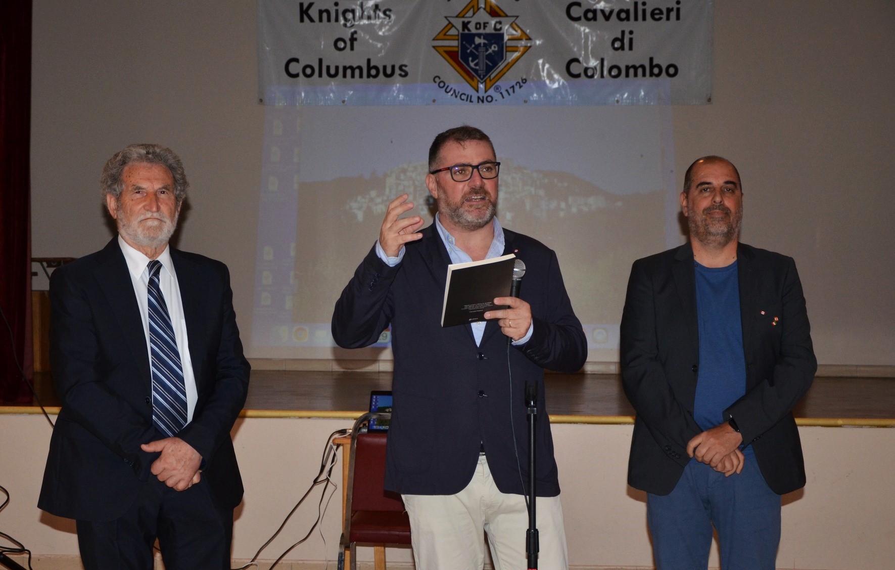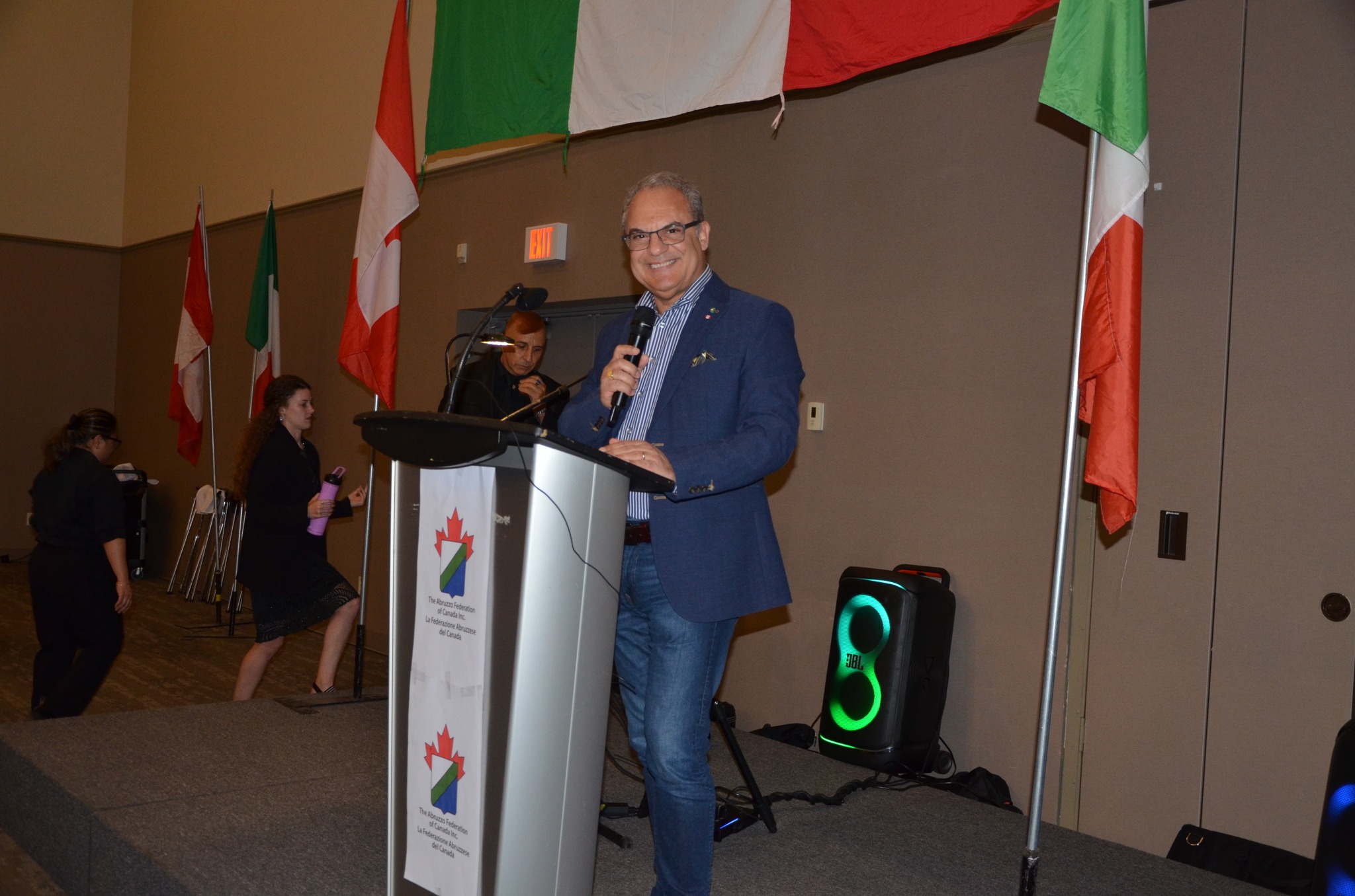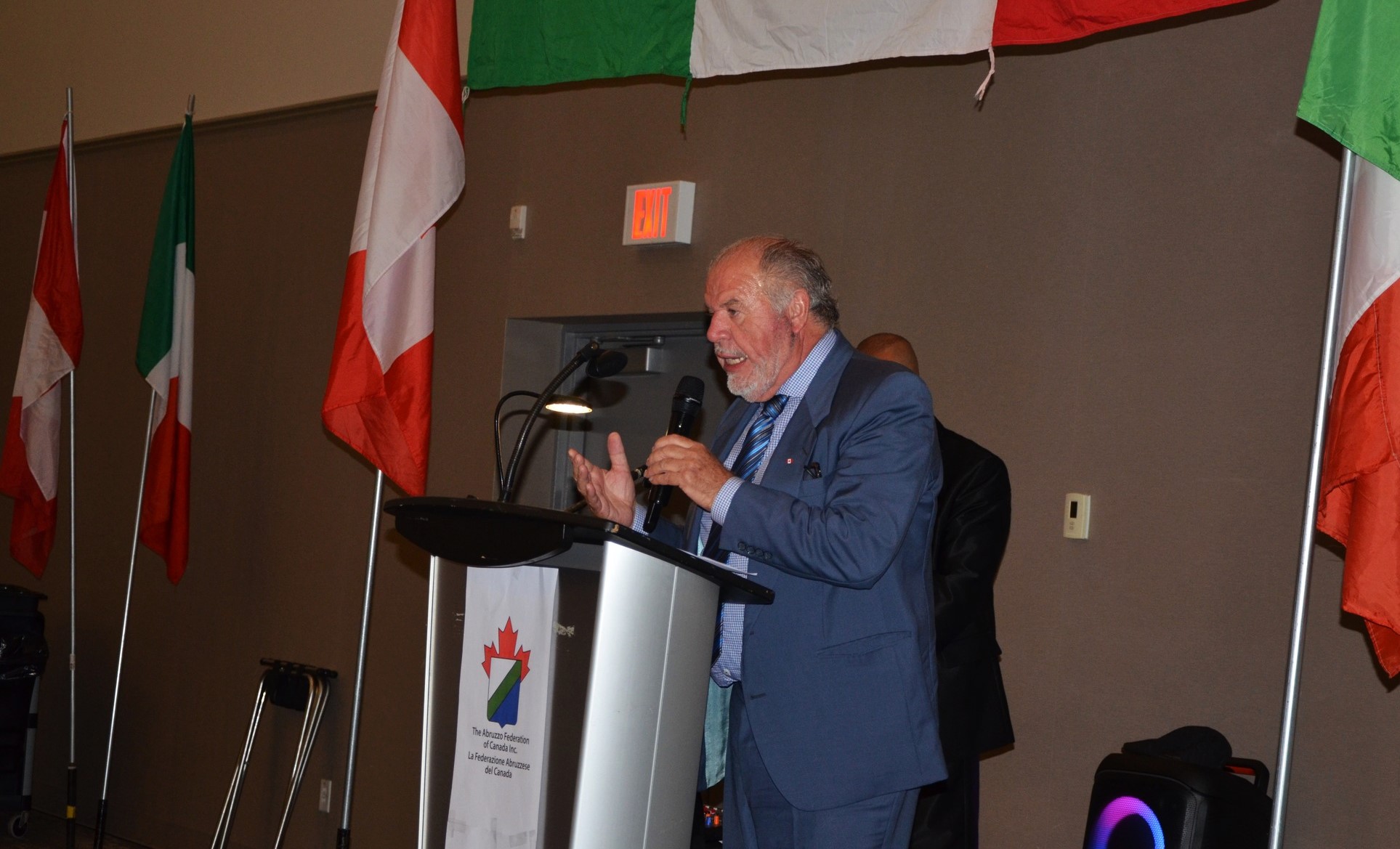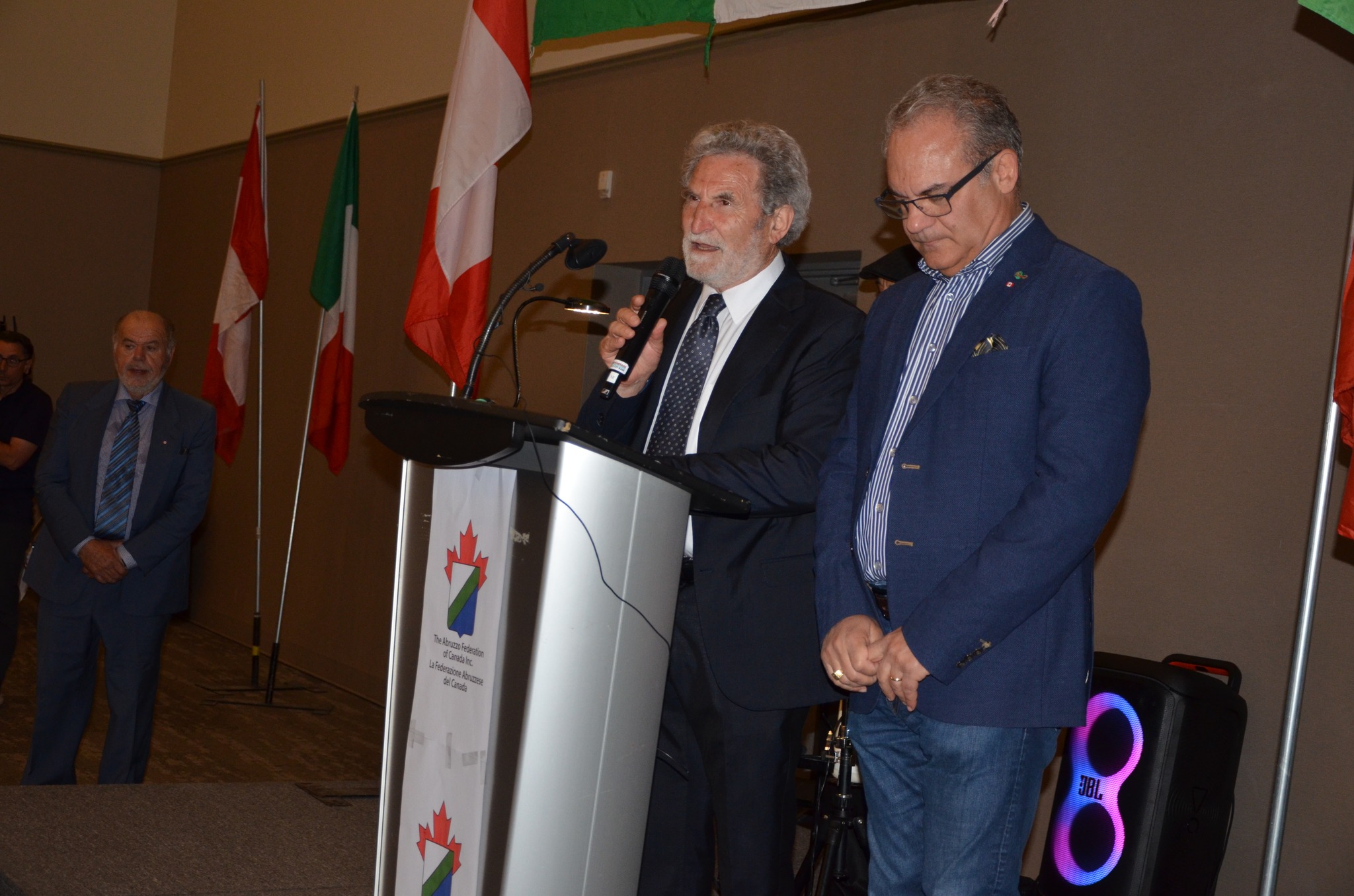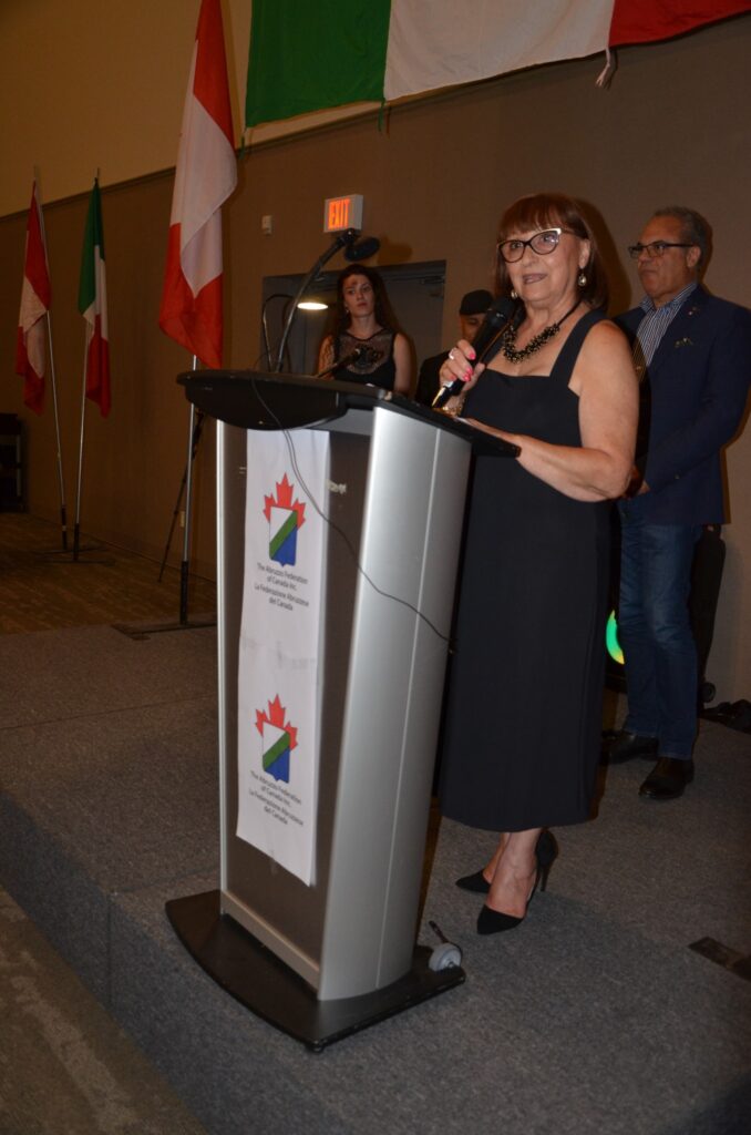 Gran maestro di cerimonia è Francesco Di Candia, il direttore di CHIN Radio, sempre chiamato a questi eventi ufficiali per la brillantezza e la qualità della sua conduzione. In pochi tratti egli illustra il programma della serata, cita nell’ordine gli Ospiti e le Autorità presenti, legge il caloroso messaggio del sindaco di Ottawa, Mark Sutcliffe, e inizia a dare la parola per gli interventi. Doverosamente prima a portare ai presenti il saluto della Federazione Abruzzese in Canada è la presidente Bevilacqua, manifestazione che vuole celebrare le radici, ringraziando gli ospiti venuti dall’Abruzzo. Percepibile è la sua emozione per questo evento atteso dalla comunità. Segue l’intervento di Sandra Aiello, che porta il cordiale saluto dell’Ambasciatore d’Italia, Alessandro Cattaneo. Quindi il saluto del sindaco di Pretoro, Diego Giangiulli, che illustrando il progetto “La valigia di cartone” sottolinea come si è arrivati a realizzare il libro “Radici”, anche nell’edizione in lingua inglese “Roots”, un volume che tende a riannodare la memoria della comunità pretorese, fuori e dentro l’Italia. È stata un’esperienza significativa, documentata dal volume arricchito dal contributo dell’antropologo Gilles Bibeau, dalla prefazione di Goffredo Palmerini e dalla postfazione di Antonio Bini. Segue l’intervento del sindaco, Mario Santovito, fresco di recente elezione a primo cittadino di Rapino, nella sua sobrietà non privo di commozione nel conoscere una comunità rapinese a Ottawa così numerosa e così fortemente integrata, con storie d’emigrazione di significativo valore che onorano la terra d’origine. Del pari intenso l’intervento di Arturo Scopino, sindaco di Montelapiano, uno dei comuni più piccoli d’Italia con i suoi 67 abitanti, tuttavia molto attento al fenomeno migratorio, alla valorizzazione del magnifico borgo e alle relazioni con i propri concittadini emigrati. Qui a Ottawa Montelapiano vanta un personaggio di punta, l’imprenditore Tony Mariani, presidente di Villa Marconi.