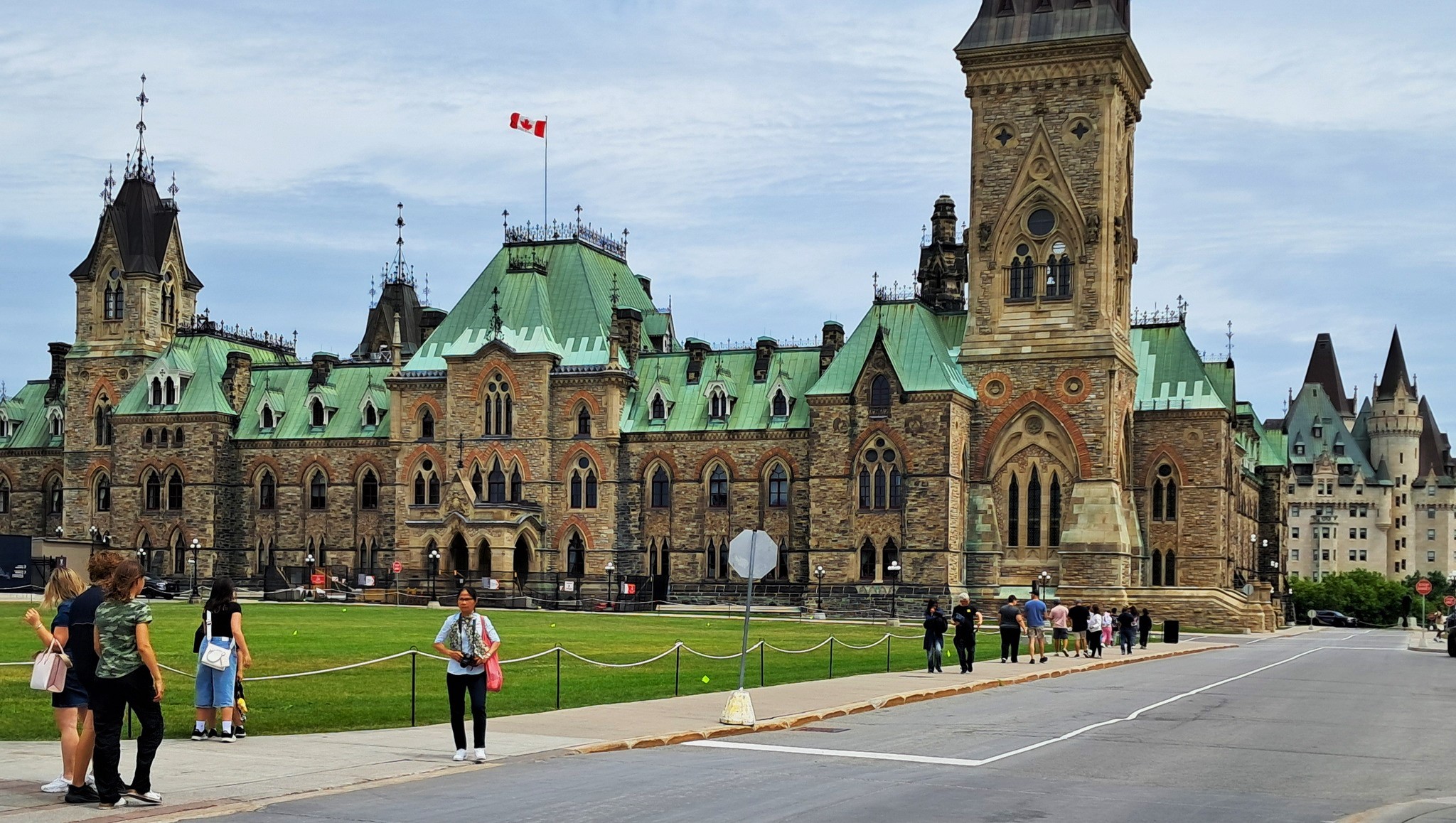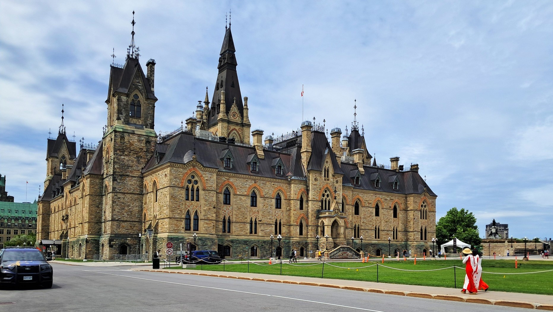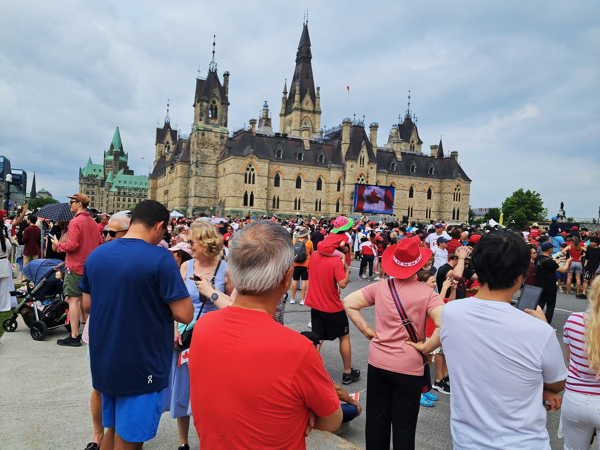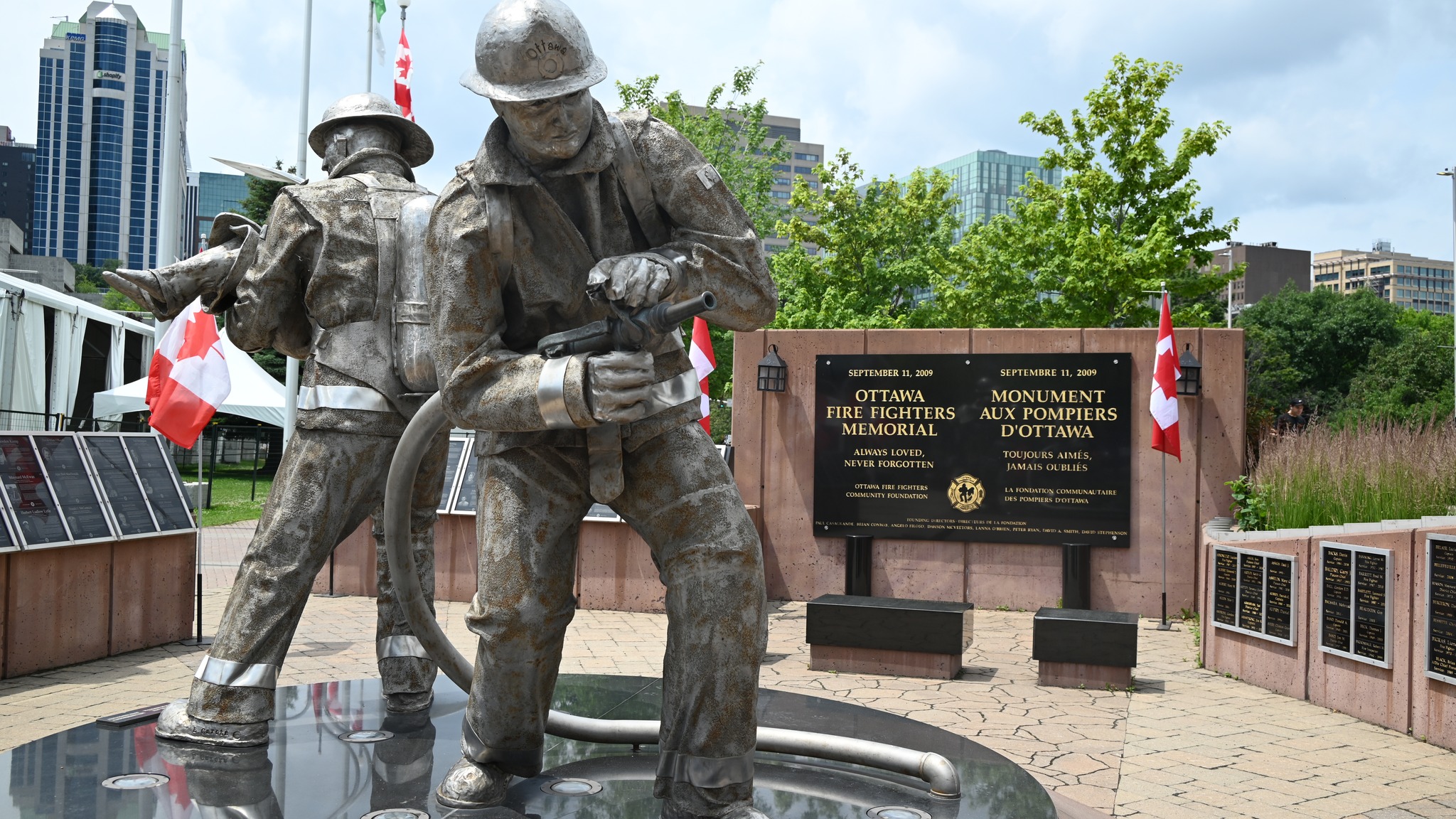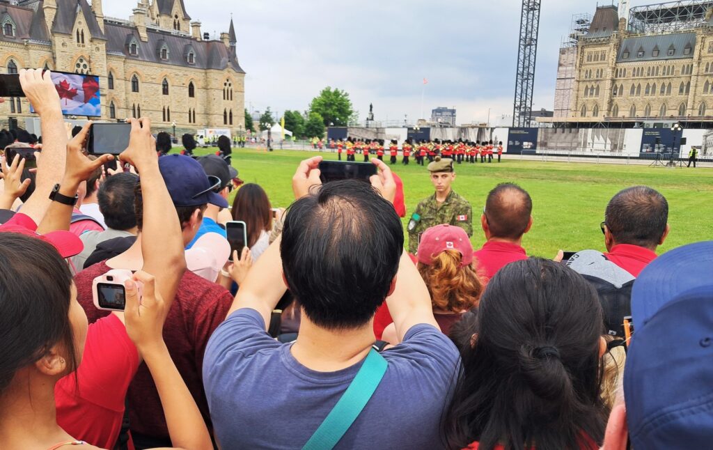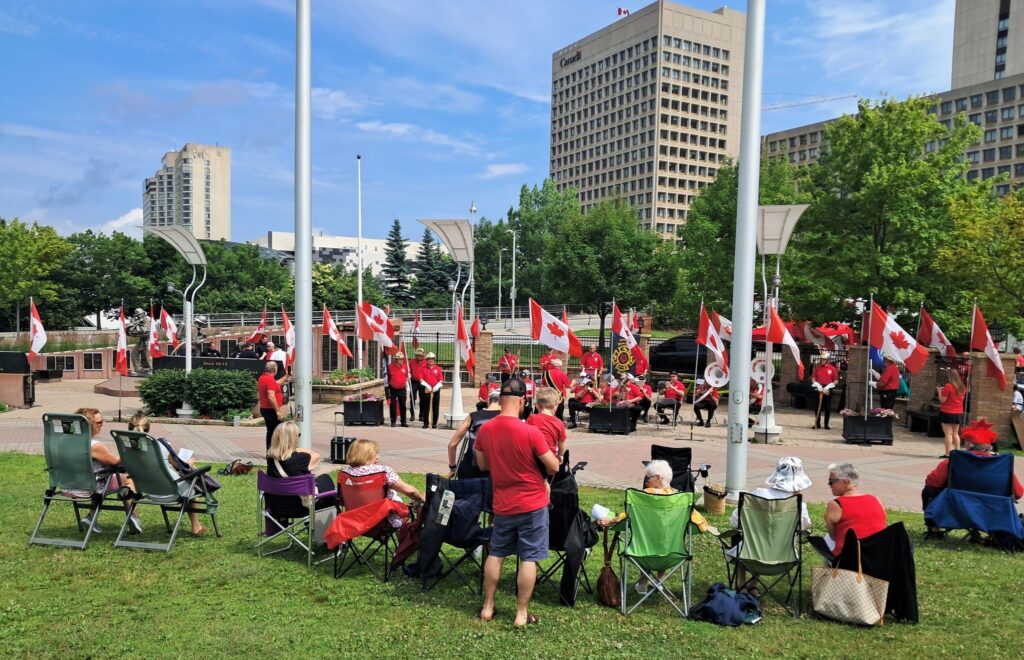 Martedì è il Canada Day, festa nazionale che ricorda il 1° luglio 1867, data d’approvazione del British North America Act, quando alcuni territori della dominazione inglese si unirono per costituire il primo nucleo della Confederazione del Canada. In questo giorno speciale tutto si colora di rosso in ogni angolo del Paese, il colore della bandiera e della foglia d’acero che sul bianco vi campeggia. Si fa festa ovunque, specialmente nella capitale già da alcuni giorni imbandierata. Con Nello Scipioni andiamo in centro di prima mattina. Già sul grande agorà davanti al Palazzo del Parlamento c’è un mare di gente, persone e famiglie intere, in attesa delle 10, ora del cambio della guardia delle Giubbe Rosse. Uno spettacolo con una sua particolare suggestione. Osservo che ogni angolo della città è vissuto in allegria, anche con artisti di strada che danno spettacolo. La giornata invita, il cielo è terso, senza neanche un lacerto di nuvole.Il sole splende. Ammiro e annoto mentalmente ogni cosa. Mi emoziona vedere come i Canadesi vivono la loro festa nazionale, la cui intensità sul piano civile e politico è cresciuta all’esponente dopo le insolenti sparate del Presidente Trump, che qui ormai il solo menzionarlo provoca l’orticaria. Torniamo davanti al Comune di Ottawa, dove c’è il Monumento ai Pompieri caduti in servizio. La Banda dei Pompieri dà un concerto. Angelo Filoso con la sua équipe, di buon mattino, ha imbandierato il luogo ed approntato la postazione microfonica. È lui stesso che presenta il concerto, anticipando i brani musicali che la banda ha in programma. Ce lo gustiamo il concerto, con Nello, Angelo e Josie Alonzi, amica carissima arrivata da Toronto, originaria di Roccamorice. A mezzogiorno l’esecuzione dell’inno nazionale canadese, mentre la squadriglia acrobatica dell’aviazione militare fa i suoi volteggi in cielo, Intanto i Pompieri, finito il concerto, approntano un picnic per loro stessi e per il pubblico.