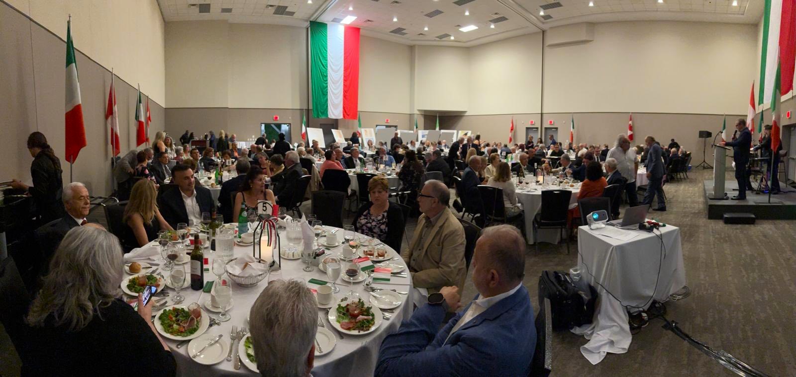 Va al podio Angelo Filoso per un breve intervento di saluto e per consegnare agli Ospiti intervenuti il distintivo “Semper meminerimus” in memoria degli Italiani ingiustamente internati nei campi di detenzione in Canada, dal 1940 al 1945, sospettati di simpatie verso il regime fascista. Per tale fatto – una vera ferita per la comunità italiana – nel 2021 il Primo Ministro Justin Trudeau in Parlamento ha porto le scuse del Paese agli Italiani. Angelo Filoso, con Ariella Dal Farra Hastetter e Francesca L’Orfano, è autore del volume “Ricordi per un Memoriale”, testimonianze di internati italo-canadesi di Ottawa durante la Seconda Guerra mondiale, pubblicato nel 2011. Il libro documenta la storia degli internamenti nei campi di Petawawa e Hard Gagetown, e riporta la testimonianza di cinque italiani di Ottawa che subirono l’ingiusto internamento. Chi scrive, nel 2024, ha curato l’edizione italiana del libro, promossa da Angelo Filoso, che ha soprattutto il merito d’aver realizzato nel 2011, in Piazza Dante ad Ottawa, il Muro commemorativo, una grande lastra di granito rosso che riporta i nomi dei 5 italiani internati a Petawawa e di 6 italiani di Ottawa, arruolati nell’esercito canadese, morti in combattimento. Filoso ha quindi consegnato agli Ospiti una Medaglia dell’Italian Canadian Community Centre. Conclusa la parte ufficiale segue festosa la conviviale, mentre gli autori del volume “Radici” provvedono al firma-copie. La serata di sabato 28 giugno, nello stesso luogo, si celebra l’incontro conviviale con la comunità rapinese di Ottawa. Lorenzo Micucci, presidente dell’Associazione Rapinesi, è l’anfitrione della serata che vede protagonisti il sindaco di Rapino Mario Santovito e il consigliere comunale Adriano Pasquale. Oltre 180 le persone che riempiono la sala, concittadini che si ritrovano in un convivio denso di memoria e di emozioni.