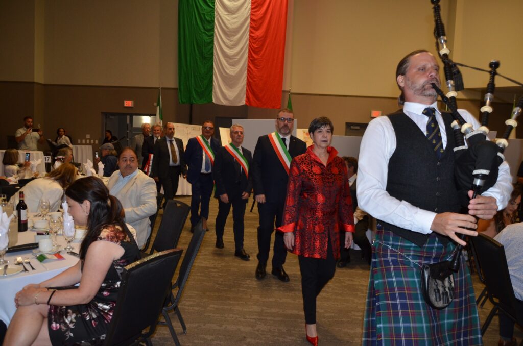 Alle 16 all’Ottawa Conference Event Centre è già un gran movimento di persone, che vanno ai tavoli assegnati dalla certosina curatela di Olimpia Bevilacqua, presidente della Federazione Abruzzese che ha organizzato l’incontro. All’evento partecipano circa 200 persone. OMNI Television, emittente nazionale canadese, raccoglie anche una mia dichiarazione sulla missione dei sindaci abruzzesi ad Ottawa, scopi e prospettive. Molte persone s’interessano ai pannelli della Mostra, assai evocativi per chi ha sperimentato direttamente una storia d’emigrazione. I pretoresi vi riconoscono parenti e amici, se non addirittura familiari, nei passaporti e documenti esposti. Alle 16:30 inizia la parte ufficiale dell’evento, cui seguirà la conviviale. Angelo Filoso ha preparato un colpo di teatro. Fa entrare gli Ospiti giunti dall’Abruzzo al suono d’una cornamusa, suonatore in rigoroso kilt scozzese seguito da Sandra Aiello, dirigente della Cancelleria Consolare in rappresentanza dell’Ambasciata d’Italia a Ottawa, e nell’ordine i sindaci di Pretoro, Diego Giangiulli, di Rapino, Mario Santovito, di Montelapiano, Arturo Scopino, in fascia tricolore, poi l’assessore alla Cultura di Pretoro, Fabrizio Fanciulli, poi io che qui scrivo, munito da Filoso di fascia tricolore – per i miei trascorsi di vicesindaco dell’Aquila – che però ho correttamente evitato d’indossare portandola su un braccio, infine Paul Casagrande, direttore della Banda dei Pompieri di Ottawa.