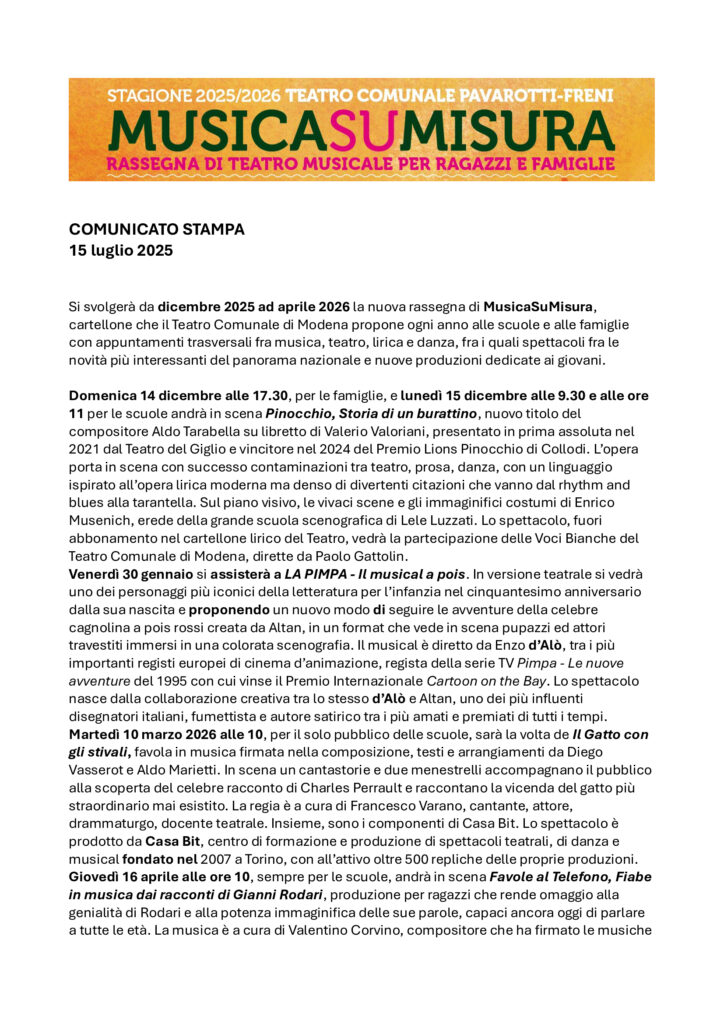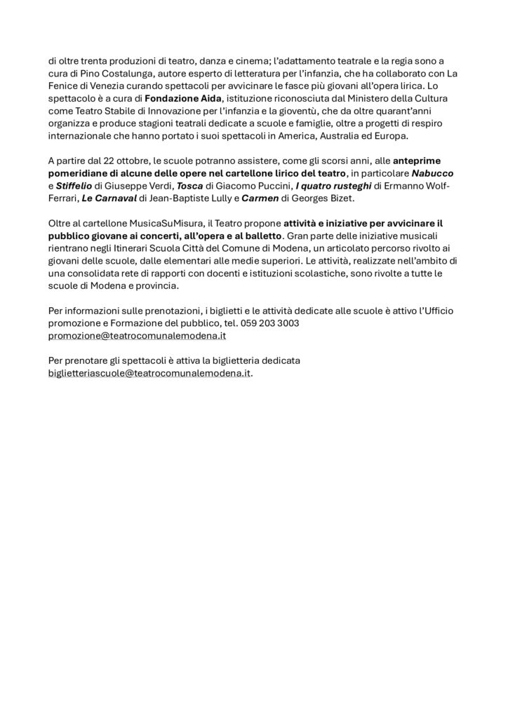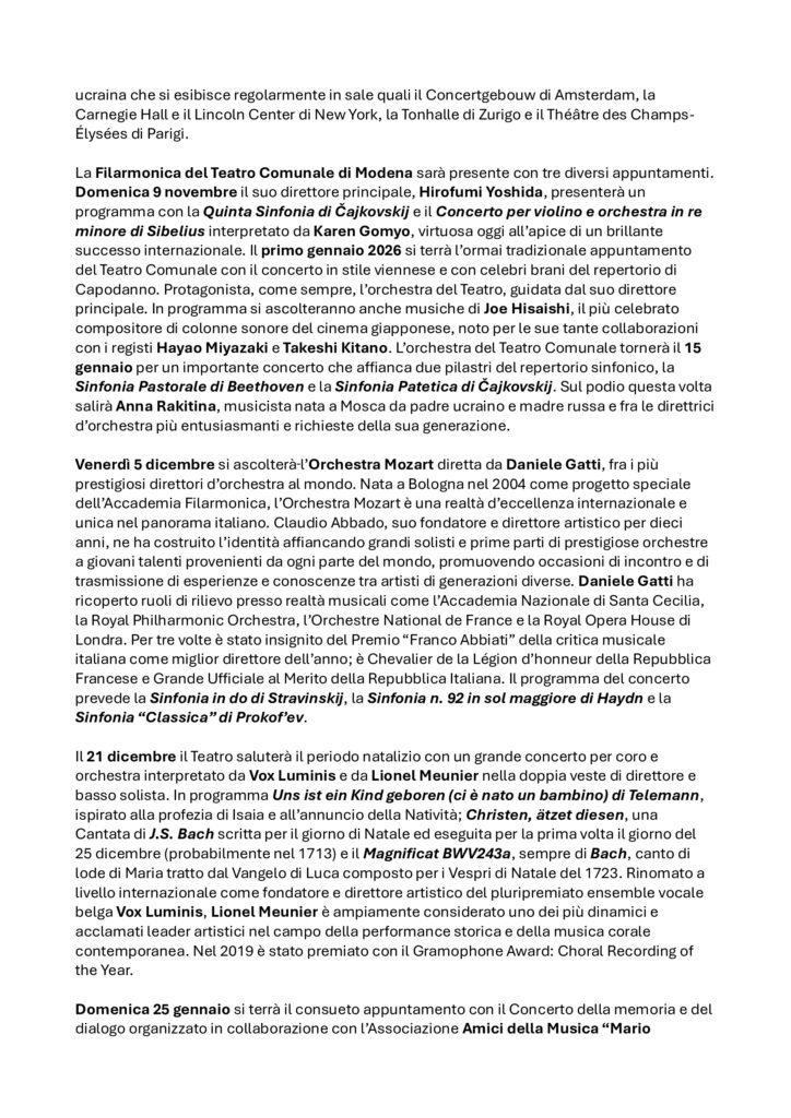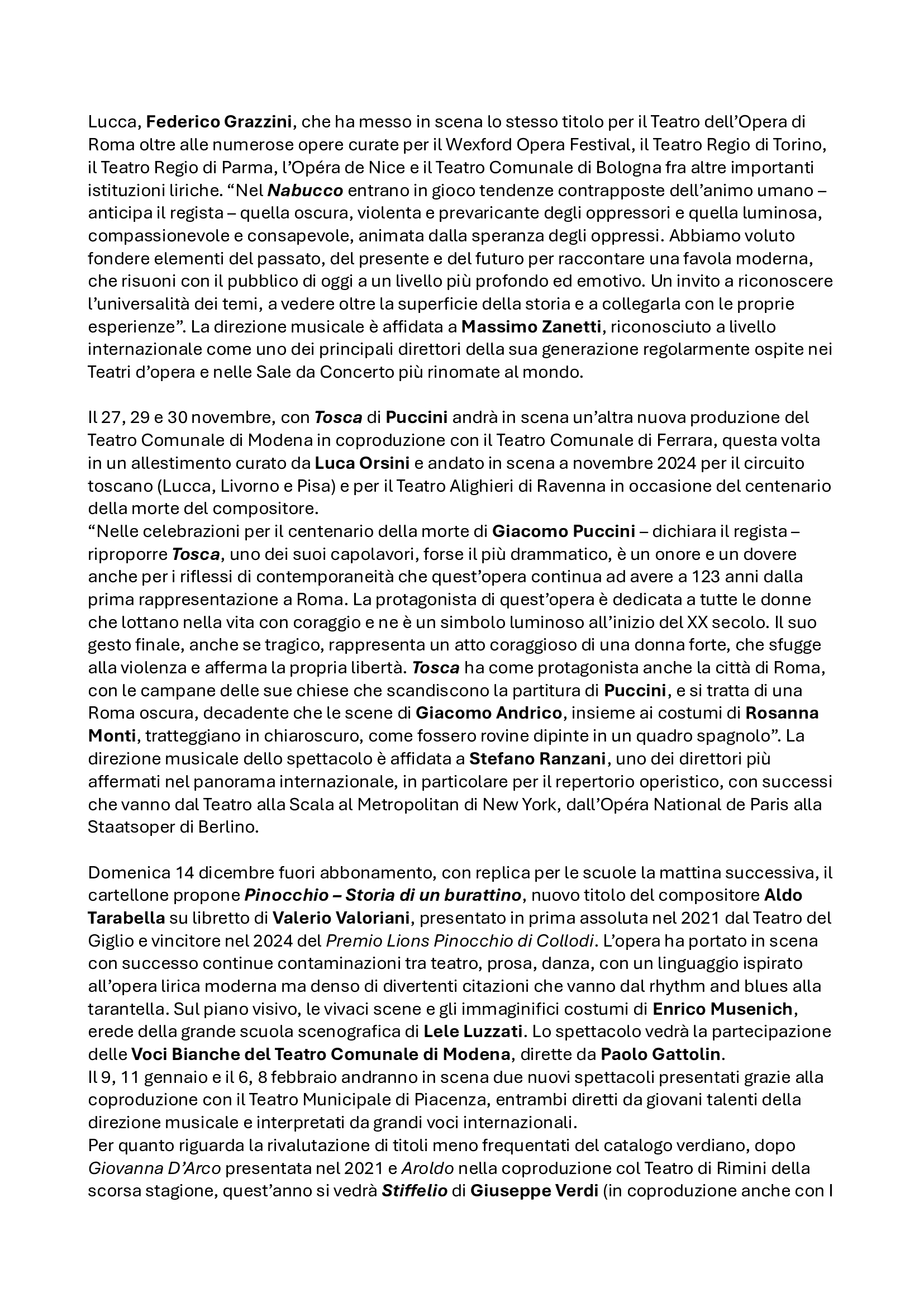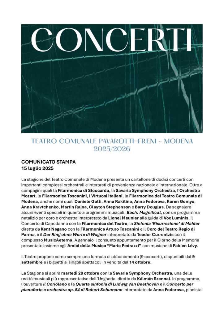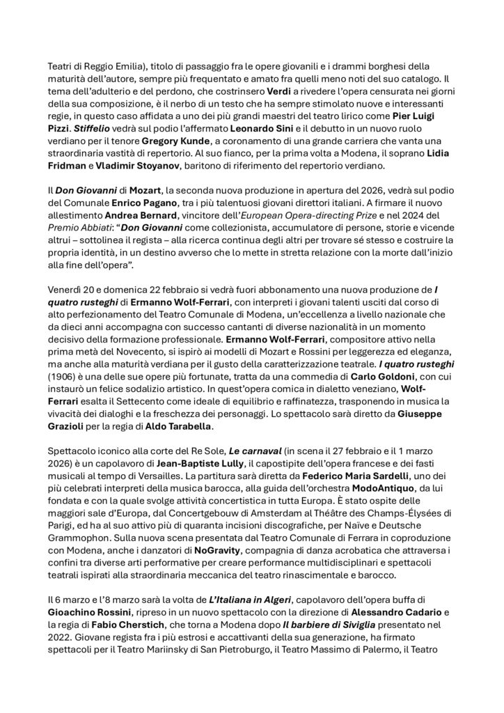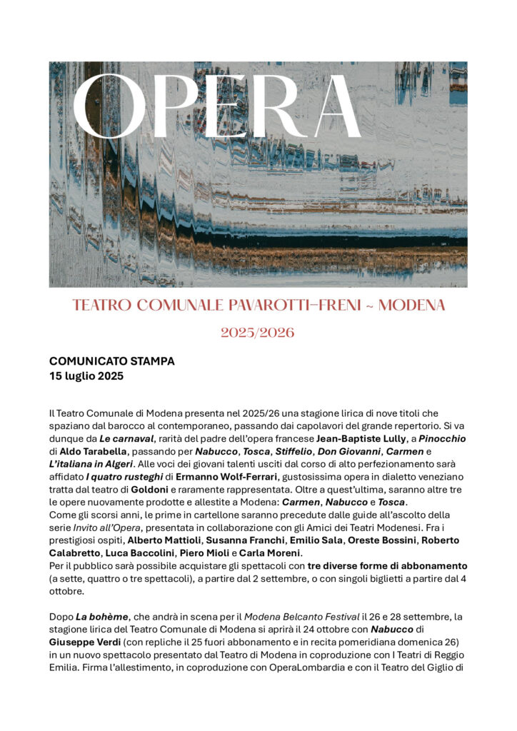 Martedì 15 luglio 2025 alle ore 11, presso il Teatro Comunale Pavarotti-Freni di Modena (Sala Pittori, ingresso via del Teatro 8), Andrea Bortolamasi – Assessore alla Cultura del Comune di Modena -, Eleonora De Marco – Vicepresidente della Fondazione di Modena – e Aldo Sisillo – Direttore della Fondazione Teatro Comunale di Modena -, hanno presentato i dettagli delle nuove stagioni 2025/2026.
