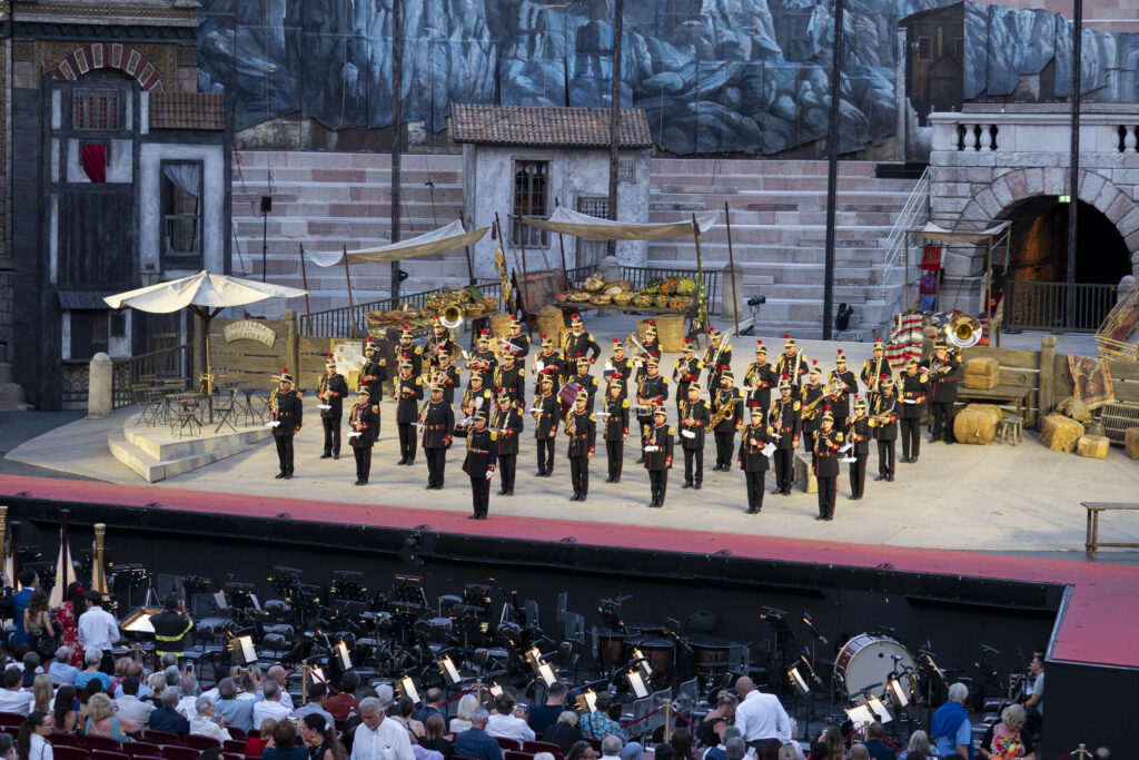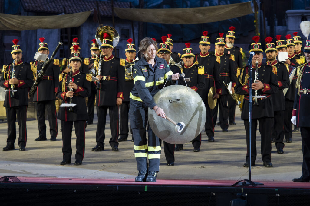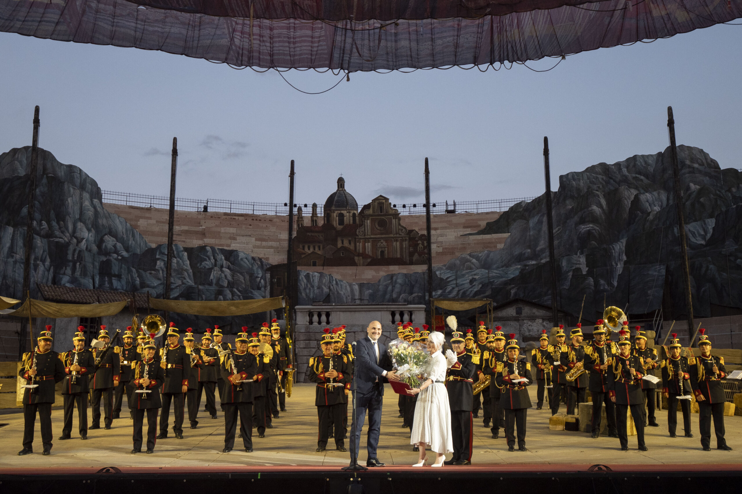 Venerdì 18 luglio, prima dell’inizio di Carmen, sull’immenso palcoscenico dell’Arena sono saliti quarantacinque esecutori della Banda del Corpo nazionale dei Vigili del fuoco per un momento musicale speciale diretto dal Maestro Donato Di Martile. Ad accoglierli il sovrintendente Cecilia Gasdia, assieme al sottosegretario agli Interni con delega ai Vigili del Fuoco Emanuele Prisco e al Capo del Corpo Nazionale dei Vigili del Fuoco Eros Mannino. In programma un medley dalla musica per il cinema di Ennio Morricone e un omaggio alla Spagna (in scena e reale) con España cañí, paso doble di Marquina Narro, coetaneo di Bizet, e la marcia La Gallega di Cantico. Un rappresentante dei Vigili del fuoco ha suonato il tradizionale gong che annuncia l’imminente inzio dell’opera.
