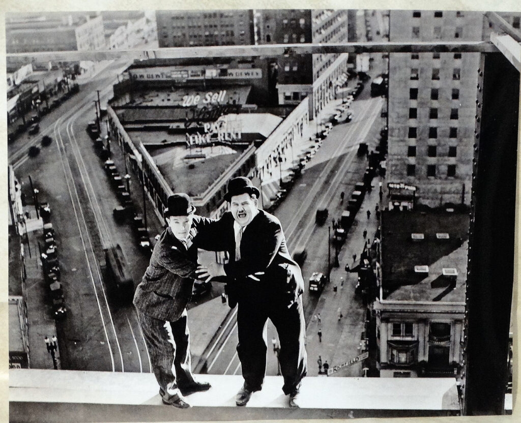Si prosegue con gli irresistibili Stanlio e Ollio, in Liberty (1929), una commedia slapstick basata su un equivoco esilarante. Dopo una fuga rocambolesca, i due protagonisti si ritrovano con i pantaloni scambiati e cercano di risolvere la situazione su un grattacielo in costruzione, dando vita a scene ad alta tensione comica che giocano magistralmente con le vertigini e l’equilibrio.