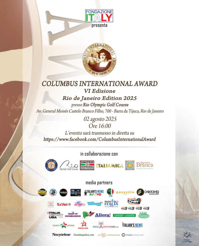 Il COLUMBUS INTERNATIONAL AWARD – Rio de Janeiro Edition 2025 potrà essere seguito in diretta streaming sulla pagina Facebook dedicata: https://www.facebook.com/ColumbusInternationalAward.