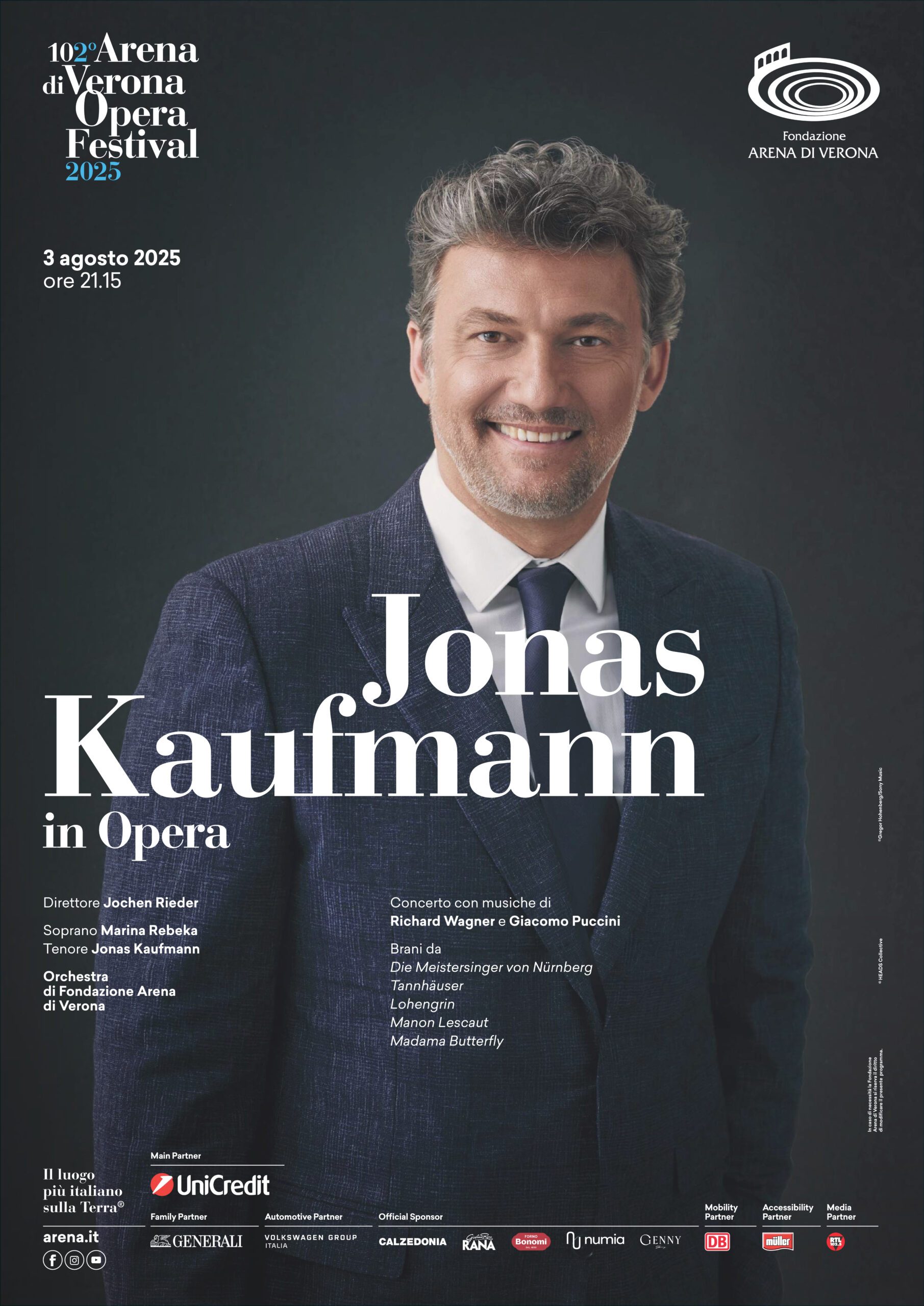 L’Arena di Verona Opera Festival 2025 conta sul sostegno di numerosi sponsor, in primis UniCredit, che vanta una longevità di collaborazione di oltre 25 anni, e poi Calzedonia, Pastificio Rana, Volkswagen Group Italia, DB Bahn, Forno Bonomi, Numia, RTL 102.5, Genny, che ha firmato le divise del personale adibito all’accoglienza del pubblico, e Müller, che sostiene i progetti di accessibilità dedicati alle persone con disabilità. Tra gli official partner marchi storici quali Veronafiere, Air Dolomiti, A4 Holding, Metinvest, SABA Italia, SDG Group, Sartori di Verona, Palazzo Maffei e Mantova Village. Così come Caviar service, ManPower Group e Consorzio di Tutela dell’Aceto Balsamico Tradizionale di Modena DOP e Ferroli. Oltre a imprese, privati, ordini professionali che compongono la schiera della Membership 67 Colonne per l’Arena di Verona, fondata da Gianluca Rana dell’omonimo pastificio e da Sandro Veronesi, patron del Gruppo Oniverse, con il Gruppo Editoriale Athesis, media partner.