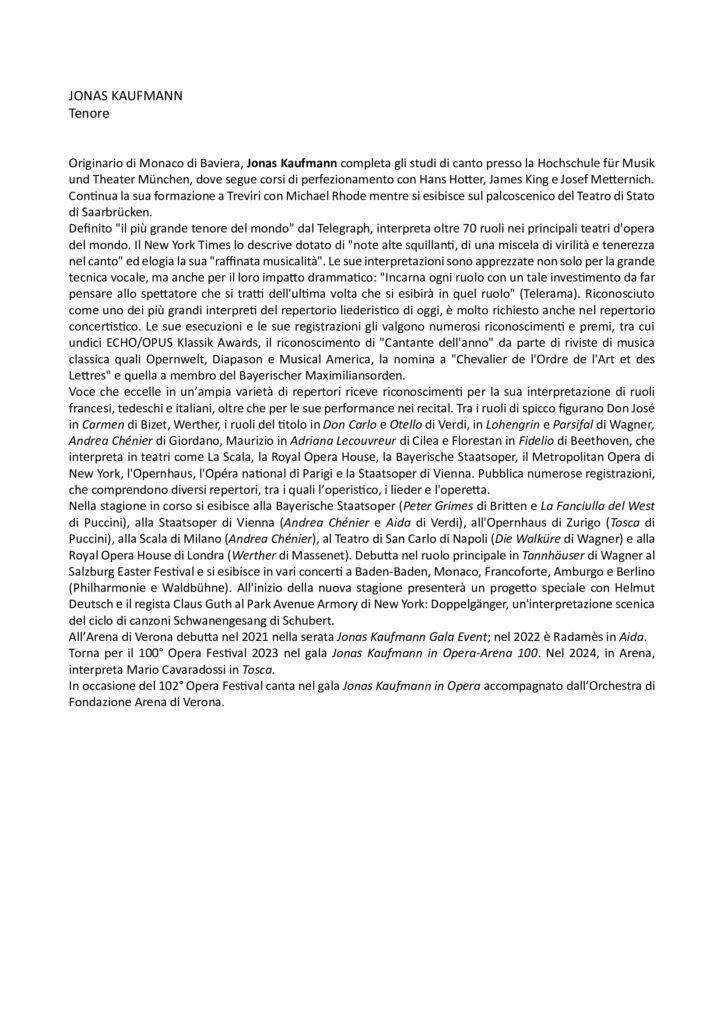 Ouverture, arie, intermezzi, scene e duetti: un concerto con alcune delle pagine più belle da opere di Richard Wagner e Giacomo Puccini che da decenni non risuonano fra le millenarie pietre dell’Arena. Domenica 3 agosto, alle 21.15, a dar voce agli eroi (e talvolta antieroi) dell’opera, un interprete d’eccezione, Jonas Kaufmann, tenore acclamato sui principali palcoscenici del mondo che dal 2021 non perde l’occasione di tornare in Arena, dove puntualmente lo attende un pubblico da sold-out.