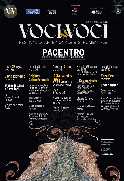 Lunedì 28 luglio e fino all’11 agosto torna con la seconda edizione VOCI&VOCI 2025, Festival di arte vocale e strumentale nel borgo medievale di Pacentro (AQ), annoverato tra i borghi più belli d’Italia. L’ iniziativa è nata nel 2023 sotto la direzione artistica di Guido Galterio, con il proposito di promuovere la cultura in tutte le sue “voci” e per promuovere il borgo ed il territorio con tutte le sue caratteristiche ed i suoi antichi valori.