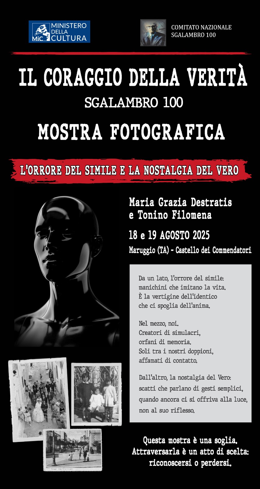Il Comitato Nazionale per le celebrazioni del centenario della nascita di Manlio Sgalambro, istituito dal Ministero della Cultura e presieduto dallo scrittore Pierfranco Bruni, ha organizzato per il 18 e 19 agosto 2025, presso il Castello dei Cavalieri di Malta a Maruggio (Ta), una suggestiva mostra fotografica dal titolo evocativo: “Il coraggio della verità – Sgalambro100”. L’ingresso è libero e gratuito.