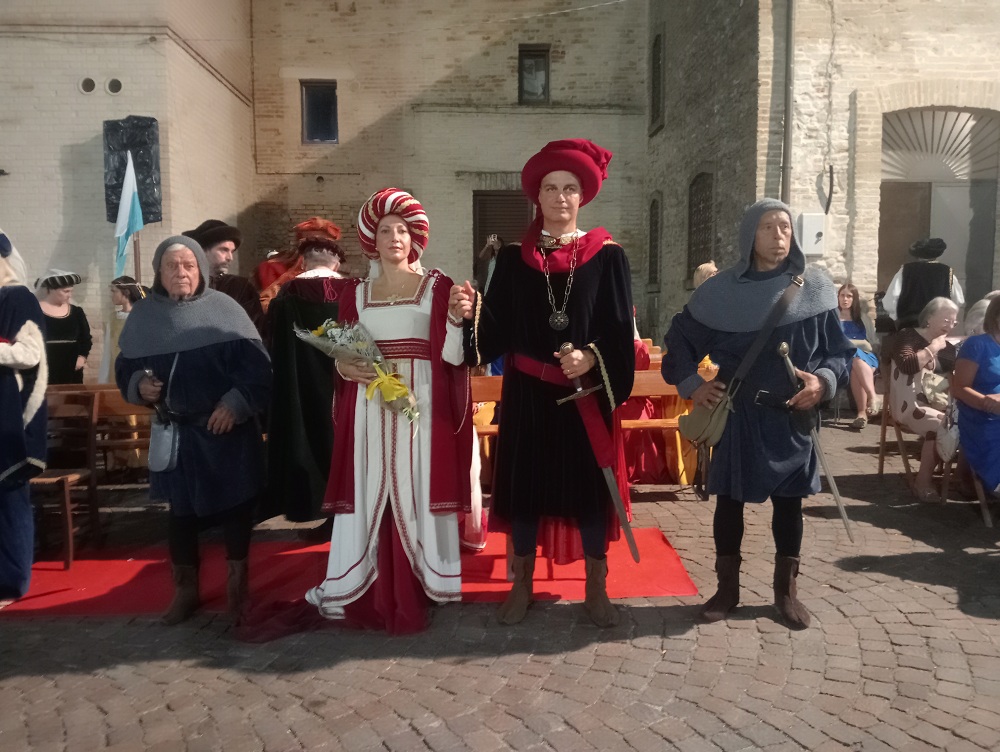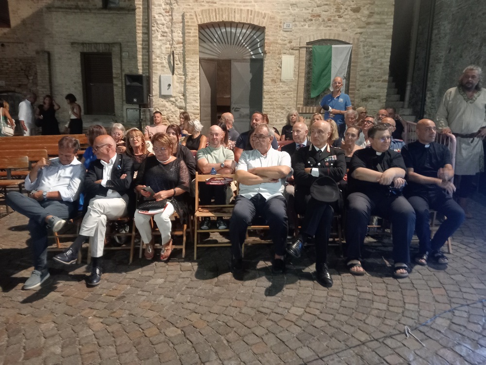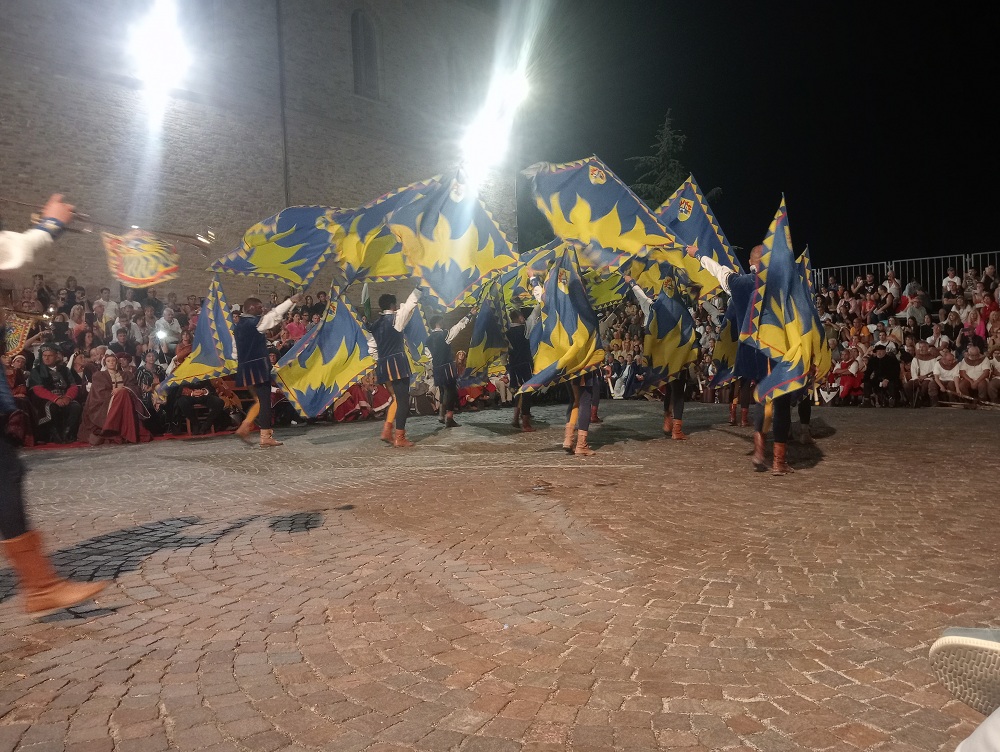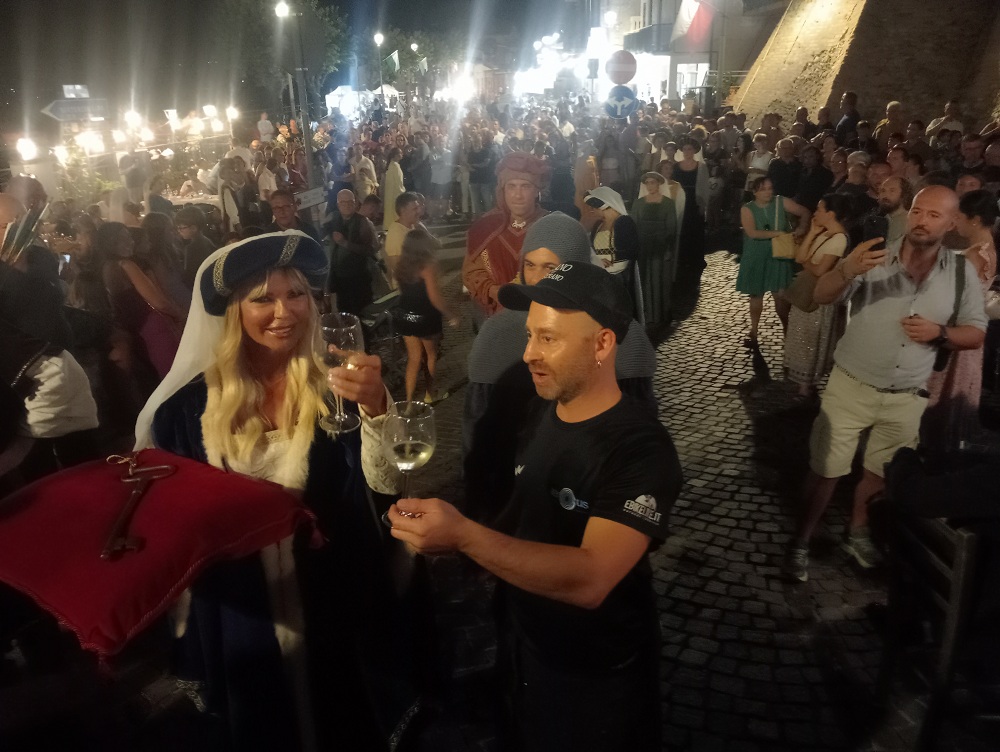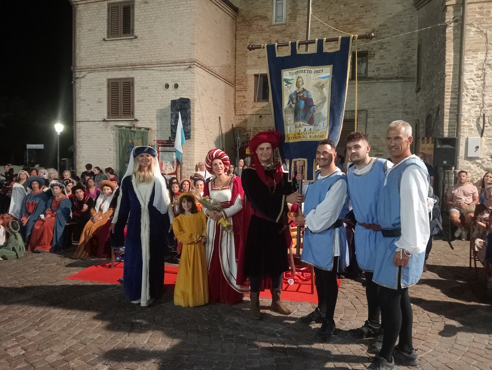 Tortoreto. Torna a vincere il rione Terravecchia, ristabilendo la parità dei drappi vinti e aggiudicandosi la XXII edizione del Palio del Barone. Con l’emblema della tortora e i colori bianco-azzurri, i ragazzi di Terravecchia, conquistano l’11° drappo contro gli storici rivali di Terranova. L’ambito premio, consegnato dal Barone di Tortoreto, è stato disegnato quest’anno dall’artista Carina Pieroni di San Benedetto del Tronto. La manifestazione ha registrato un bagno di folla, compreso i 400 figuranti, con tantissimi turisti e residenti che si sono accalcati tra la piazza principale dell’evento, lungo le stradine del centro storico e le attività di ristorazione. La manifestazione è stata aperta con il maestoso corteo storico con figuranti provenienti dalle Marche e Abruzzo. Il borgo è stato uno splendido palcoscenico medievale, in una cornice di bracieri, fiaccole e tripudio di bandiere. All’inizio del corteo c’era il gonfalone del Barone con al seguito il gruppo dei tamburi. Poi è stata la volta del Barone di Turturitus e la Baronessa, usciti dal palazzo storico della famiglia Liberati, interpretati quest’anno da Andrea Maroni e Gabriella Imperato (coppia anche nella vita), accompagnati dagli armigeri, che lungo il corteo hanno incontrato i titolari delle varie attività commerciali con cui hanno brindato in segno di buon auspicio per la città. Per la terza volta, l’associazione culturale “Due Torri” presieduta da Ennio Guercioni, ha voluto la presenza di una personaggio di caratura nazionale nei panni della Gran Dama e custode delle chiavi della città, la scelta è ricaduta su l’attrice e showgirl, Matilde Brandi che per la prima volta è uscita dalla sede comunale ricevendo le chiavi della città dal Sindaco. Seguivano i notabili con le ancelle, giullari di corte, damigelle, dame di corte con i cavalieri. A seguire le delegazioni ospiti con la partecipazione di gruppi storici provenienti dalle Marche e Abruzzo: da Acquaviva Picena, il Palio del Duca di Sponsalia; San Severino Marche, il Palio dei Castelli; Grottazzolina, il Palio di Azzolino; Jesi il Palio di Floriano e Mosciano Sant’Angelo, il Palio di Musiano. Hanno chiuso il corteo la Scuola Sbandieratori di Sestiere Porta Solestà di Ascoli Piceno e i figuranti di Tortoreto del Palio del Barone. Mercanti e mestieranti dell’epoca hanno allietato e animato fin dal primo pomeriggio il borgo e le vie del centro storico, provenienti da Falconara, Fermo e Ascoli Piceno. Soddisfatti il Sindaco, Domenico Piccioni e l’Assessore alla cultura e turismo, Giorgio Ripani (con il ruolo di Magistrato), entrambi hanno manifestato vivo apprezzamento verso tutti i partecipanti per aver dato lustro in questi due giorni di festa alla città di Tortoreto e al Palio. Anche il ruolo del Notaio è stato rinnovato con la presenza di Matteo Di Antonio. Tra le autorità presenti, oltre all’intera amministrazione comunale guidata da Piccioni, l’assessore della Regione Abruzzo, Umberto D’Annuntiis; il coordinatore dei drappi, Saverio Magno; il rettore del Santuario di San Gabriele, Padre Raffaele De Fulvio con padre Matteo e Don Lucio Coppa della Parrocchia di San Nicola; il direttore della filiale della Banca del Piceno e i comandanti della Compagnia dei Carabinieri di Alba Adriatica e il comandante della locale stazione. Momento toccante della manifestazione è stato il ricordo da parte dell’Associazione “Due Torri”, organizzatore dell’evento, della figura del compianto Gabriele Di Davide e l’istituzione del 5° premio speciale alla persona che ha dato lustro all’evento: quest’anno il premio (opera artistica) è stato assegnato al direttore artistico Fabio Di Cocco che ogni anno conduce brillantemente la serata finale. Tanti gli artisti e rievocatori tra i più gettonati in ambito nazionale e non solo che hanno animato la serata: da Massa Carrara gli spettacoli di falconeria con Alessandro Vinci, Gli acrobati del borgo con spettacoli burleschi, la comicità con Otto Panzer, i Mercenari d’Oriente con spettacoli di fuoco e Faisca de Luz di Roma. A conclusione della rievocazione il cielo si è colorato con “l’Incendio della Torre” eseguito da una prestigiosa ditta pirotecnica. Il servizio di sicurezza è stato garantito dalla locale caserma dei Carabinieri, Protezione Civile, Croce Bianca, Polizia Locale e Associazione Nazionale Carabinieri.