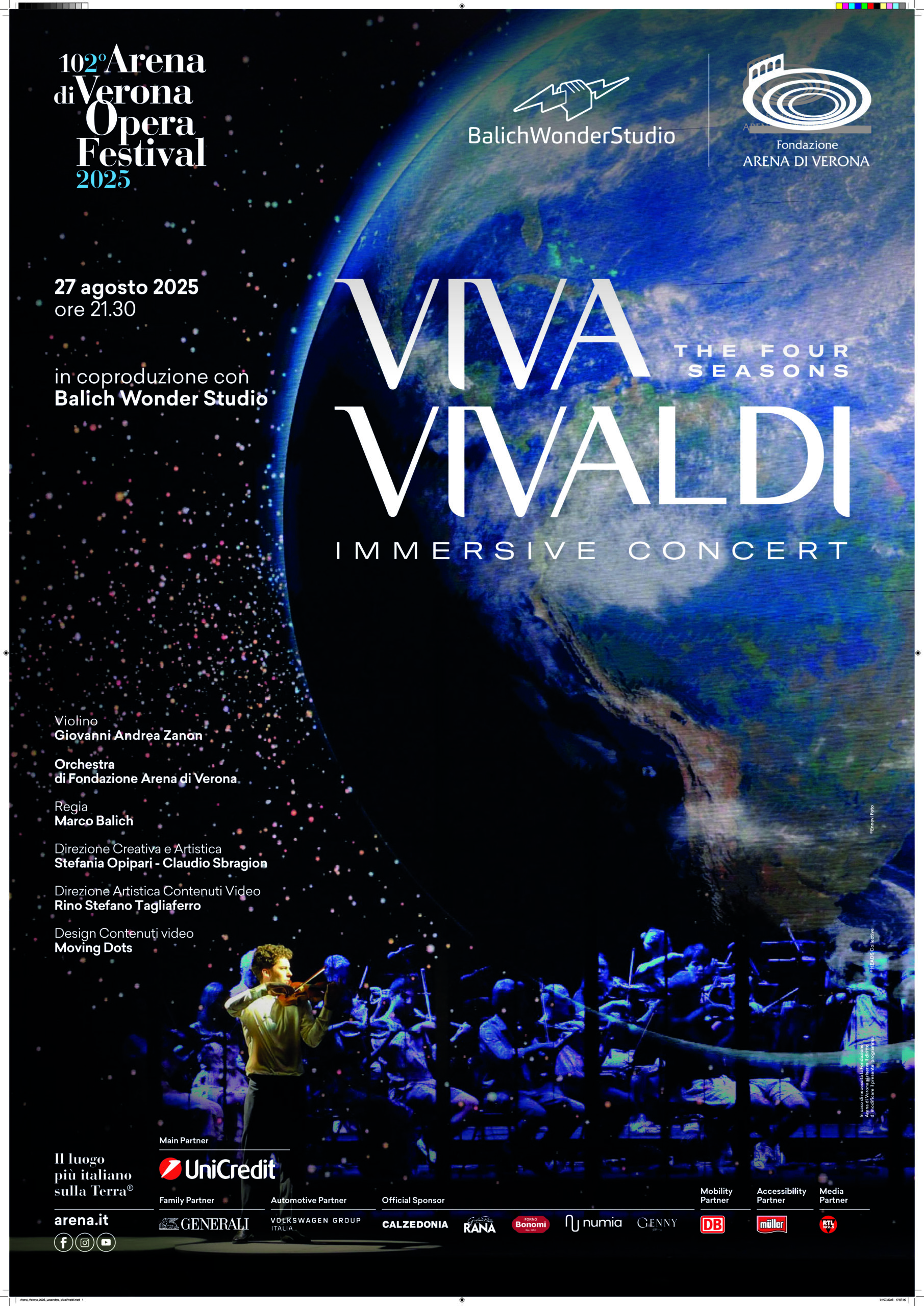 Da un format esclusivo ideato da Marco Balich e coprodotto da Fondazione Arena di Verona, lo spettacolo porta sulla scena la magica alchimia fra l’orchestra di 29 elementi, rigorosamente fedele alla partitura originale di Vivaldi, e il linguaggio contemporaneo della tecnologia immersiva applicata ai codici della musica classica. Lo show vedrà la presenza del maestro Giovanni Andrea Zanon, violinista e stella del panorama musicale, vincitore dei più prestigiosi concorsi internazionali, assieme ai professori d’Orchestra dell’Arena di Verona.