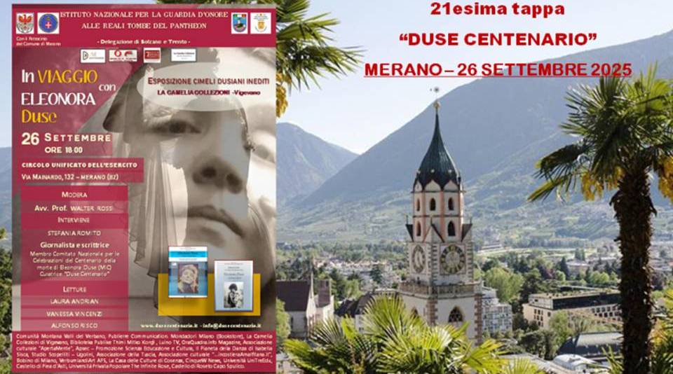 Un omaggio a una delle più grandi attrici di tutti i tempi, Eleonora Duse, approda a Merano con la ventunesima tappa del tour “In Viaggio con Eleonora Duse – Duse Centenario”, relativa al Progetto Scientifico Internazionale “Duse Centenario”. L’appuntamento è fissato per il 26 settembre alle ore 18:00, presso il Circolo Unificato dell’Esercito in Via Mainardo, 132.