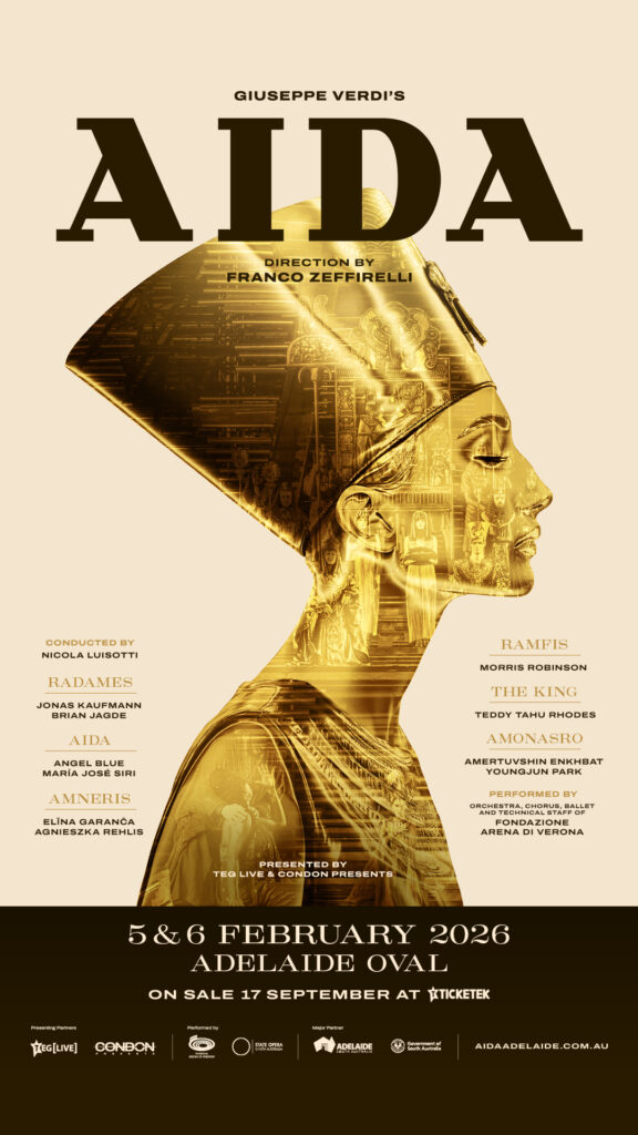 L’eccellenza italiana, il Canto Lirico patrimonio dell’Umanità protagonisti dall’altra parte del mondo con un allestimento sontuoso tra oro, pietre multicolori e tessuti preziosi. Nel 125° anniversario verdiano, Aida all’Adelaide Oval si preannuncia lo spettacolo lirico più grandioso nella storia del continente australiano.