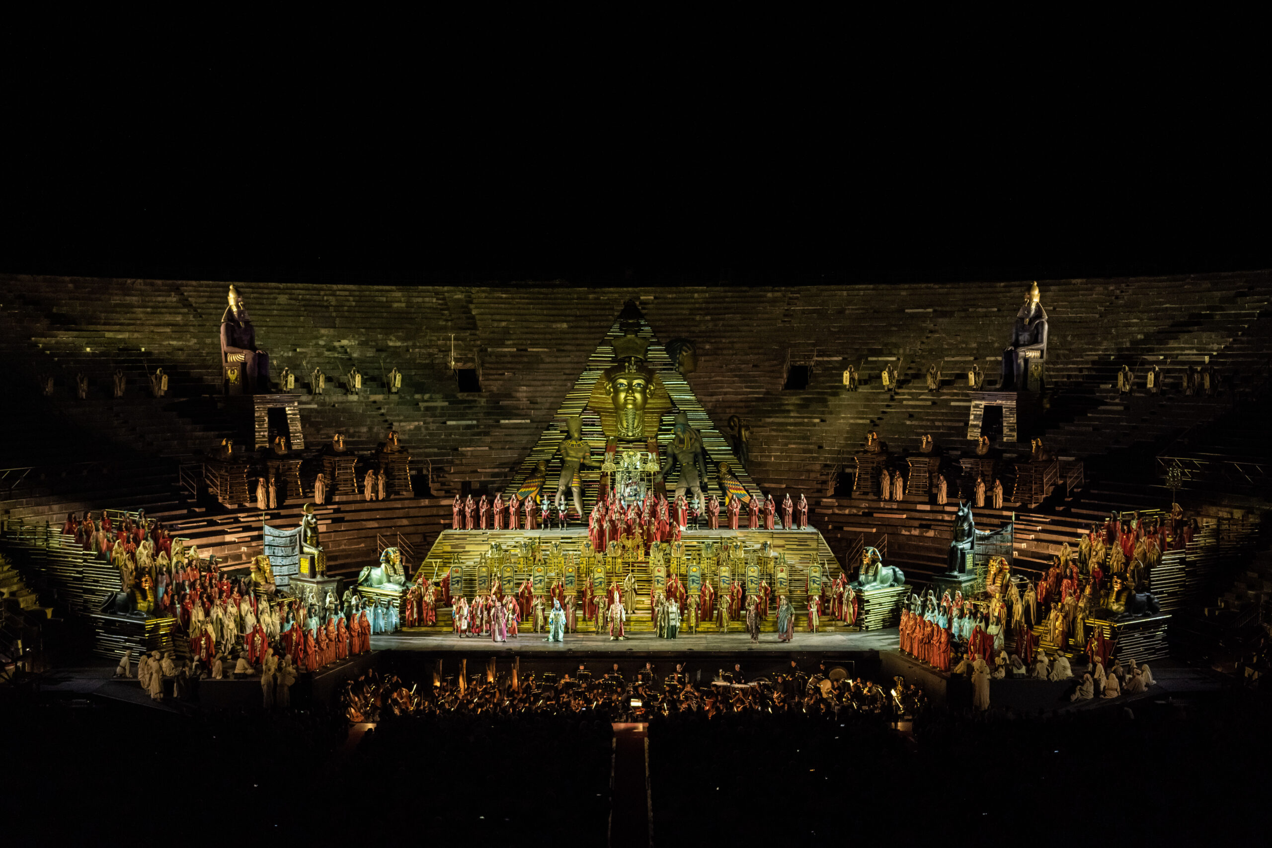 L’allestimento firmato da Franco Zeffirelli per l’Arena di Verona ripropone l’Egitto aureo grazie anche ai costumi di Anna Anni e alle coreografie originali di Vladimir Vasiliev.