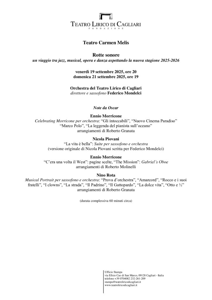 Venerdì 19 settembre alle 20 e domenica 21 settembre alle 19 al Teatro Carmen Melis si inaugura Rotte sonore, nuova rassegna musicale del Teatro Lirico di Cagliari, che prevede, per le due serate inaugurali, un imperdibile concerto dal titolo Note da Oscar, con Federico Mondelci, direttore e sassofonista marchigiano, da trent’anni uno dei più apprezzati interpreti del panorama musicale, che si esibisce, per la prima volta a Cagliari sia dal podio che come solista al sassofono, insieme all’Orchestra del Teatro Lirico.