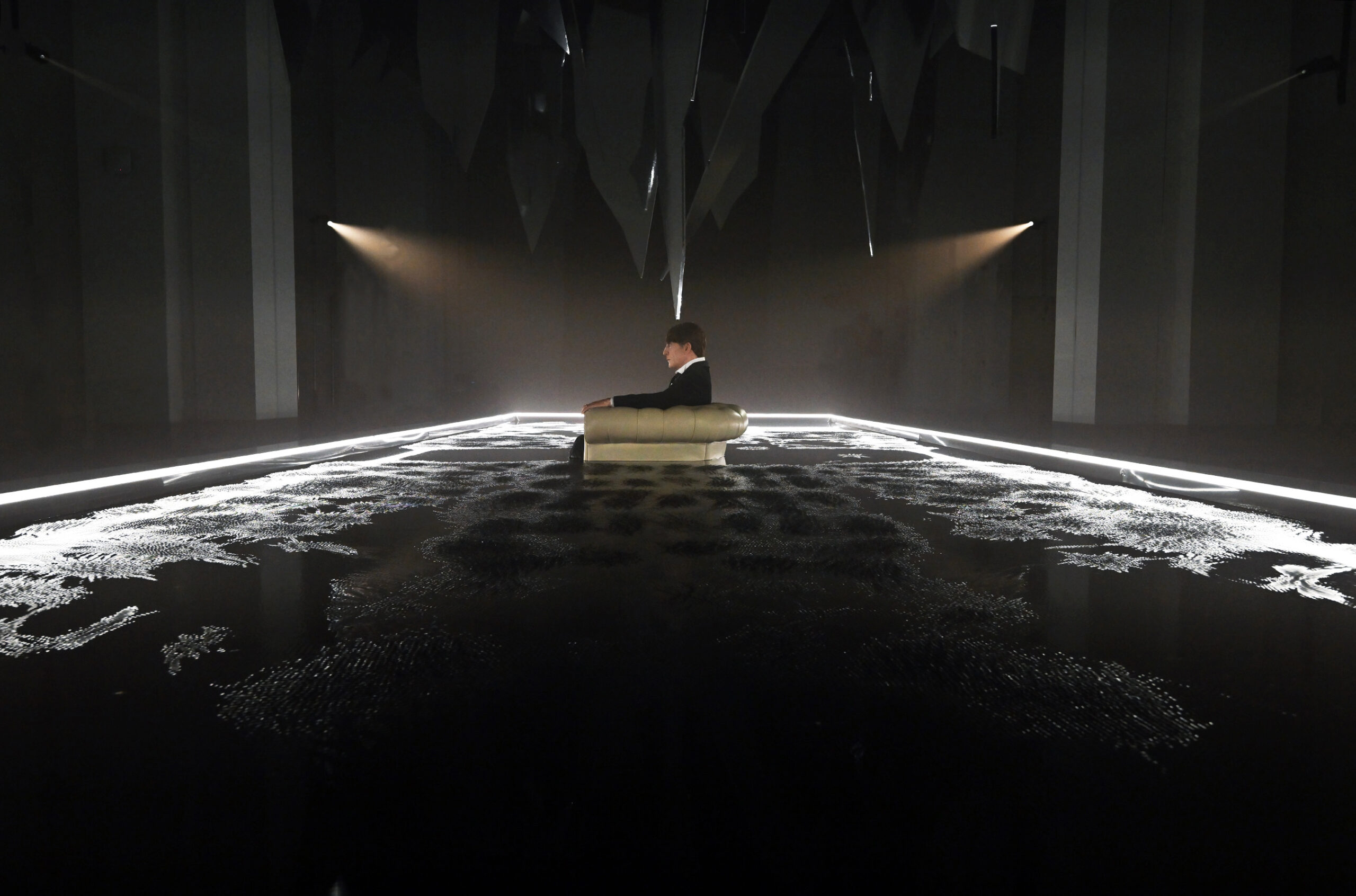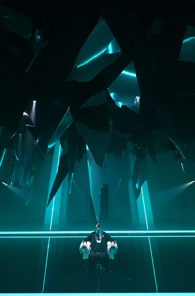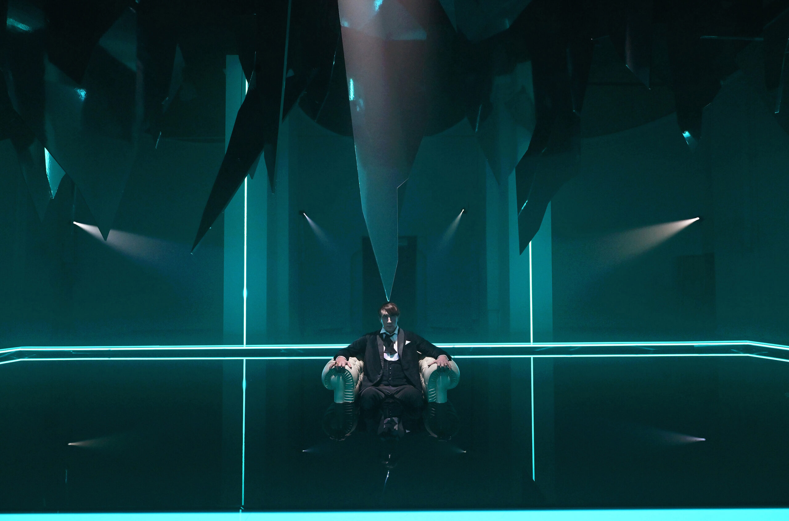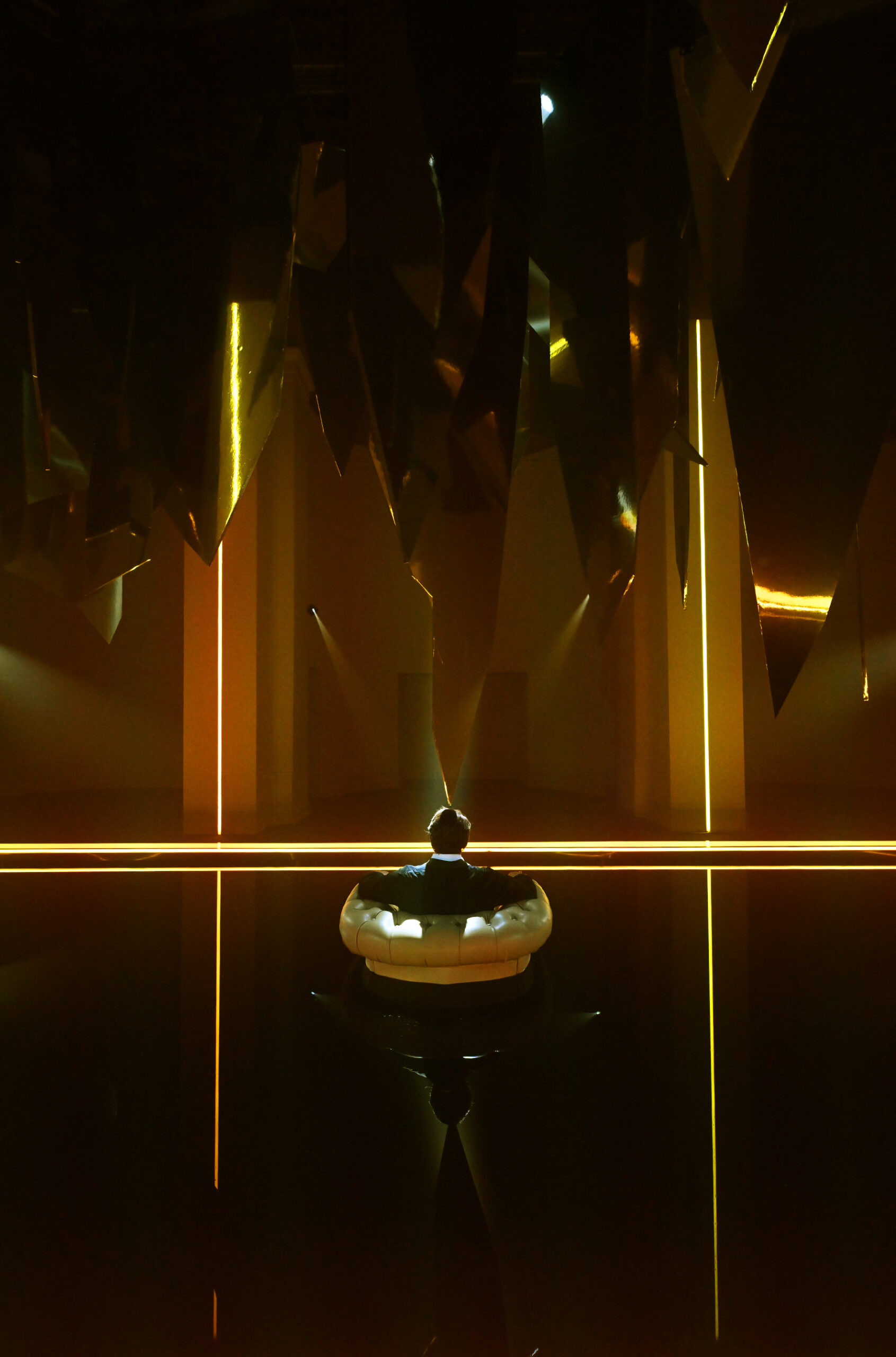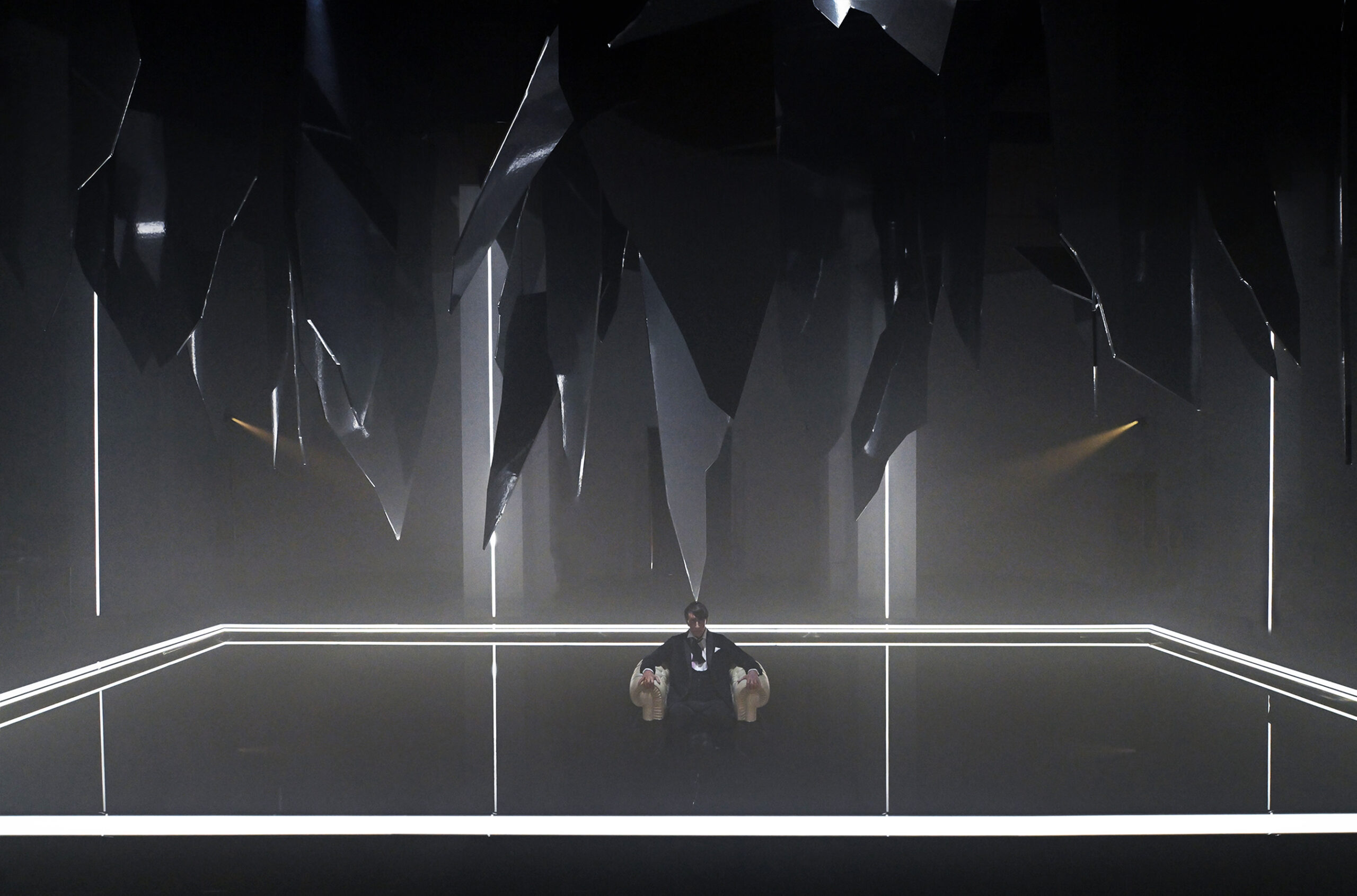 Al centro dello spazio una vasca nella quale sta Macbeth, figura umana iperrealistica che sembra sprofondare in un abisso di acqua nera seduto su una poltrona, simbolo per eccellenza del potere. Lo specchio d’acqua è agitato dalle vibrazioni della musica verdiana prodotta da speciali altoparlanti posti al di sotto della grande vasca. Sopra di lui, frammenti sospesi di specchi, che evocano il suo mondo esploso, un palazzo di cristallo andato in frantumi. «Abbiamo intitolato il progetto Il sonno uccidesti dal libretto verdiano perché sintetizza al meglio l’idea di ossessione – spiega Damiano Michieletto. Macbeth vive in una notte infinita, dove il tempo non scorre e non esiste tregua. L’acqua scura che lo inghiotte è un incubo in continuo movimento, alimentato dalla sua ambizione sconfinata. Sopra di lui, lame di specchi minacciano la caduta del mondo che aveva costruito: il suo peggior incubo che adesso guarda con i suoi stessi occhi».
