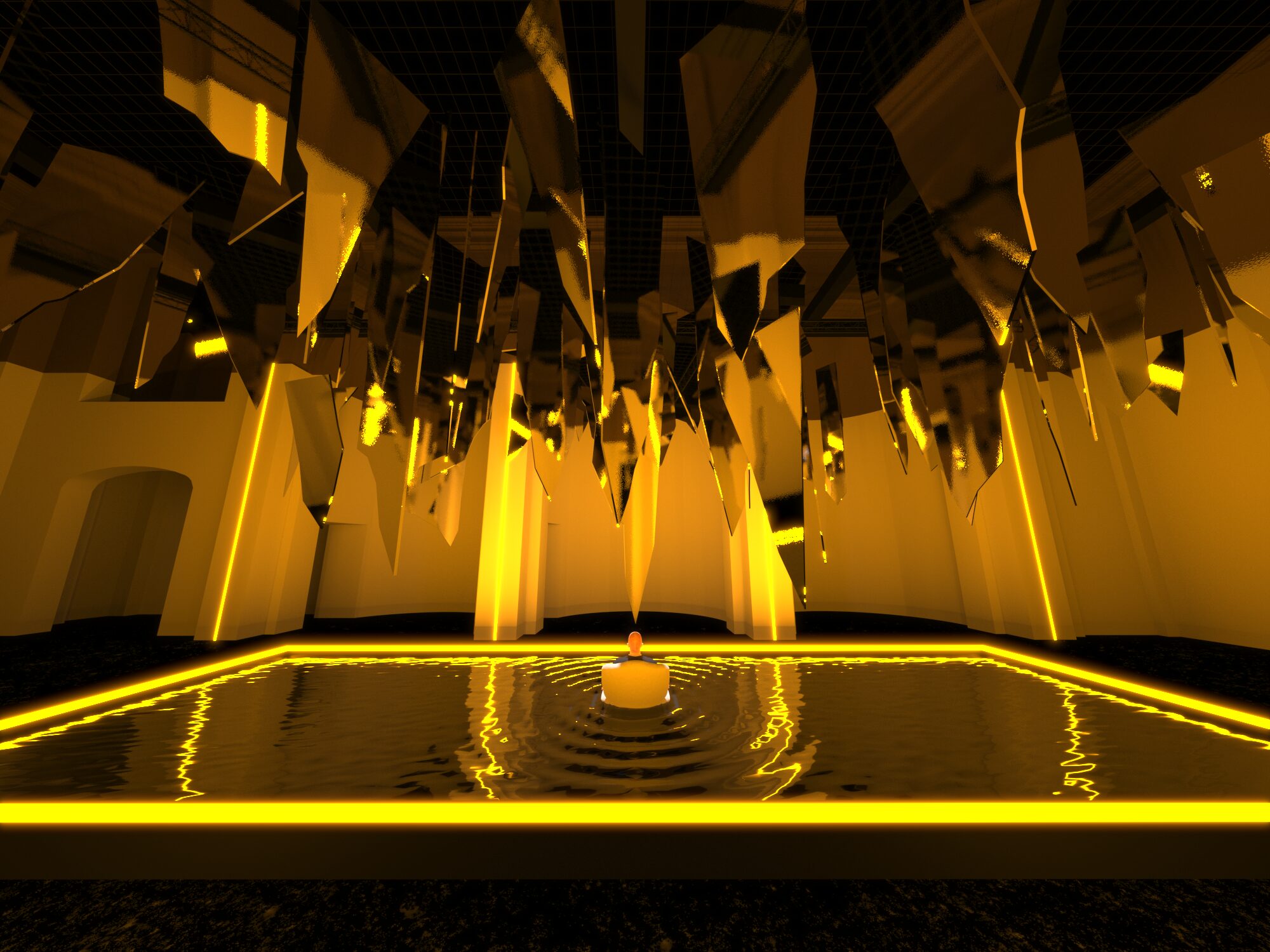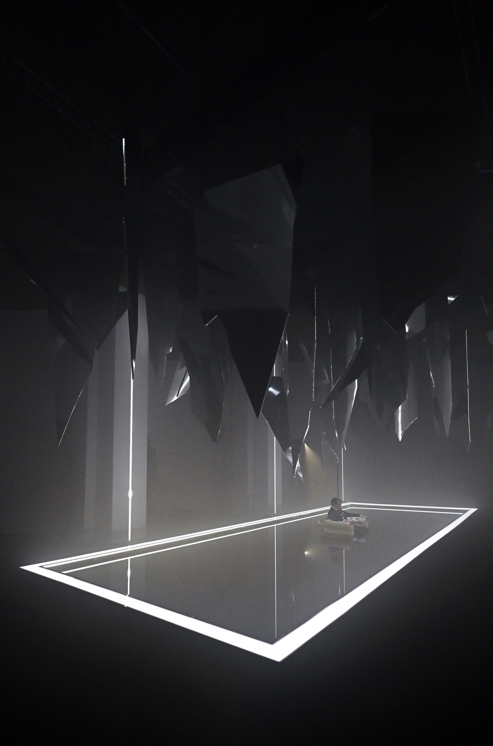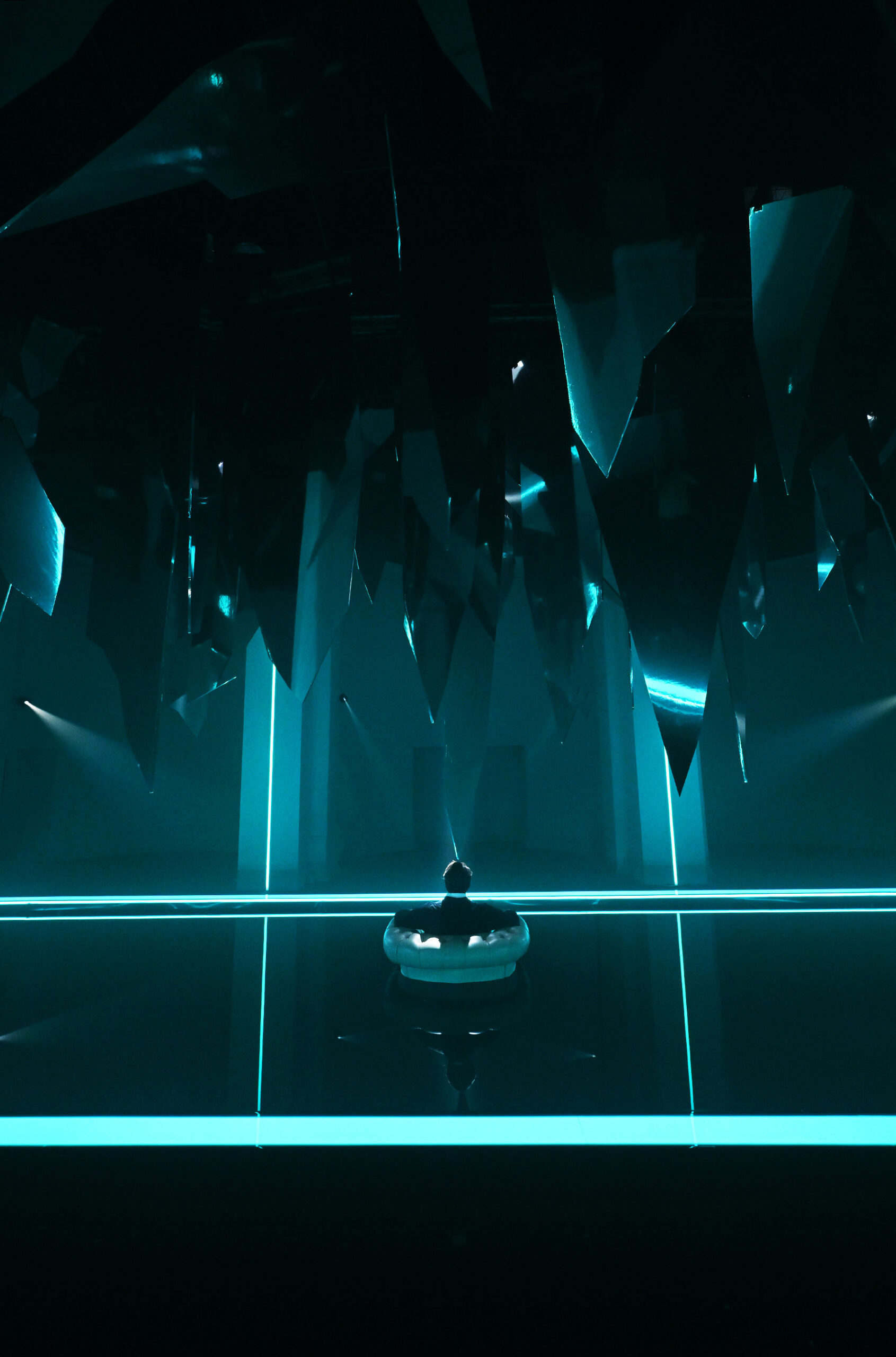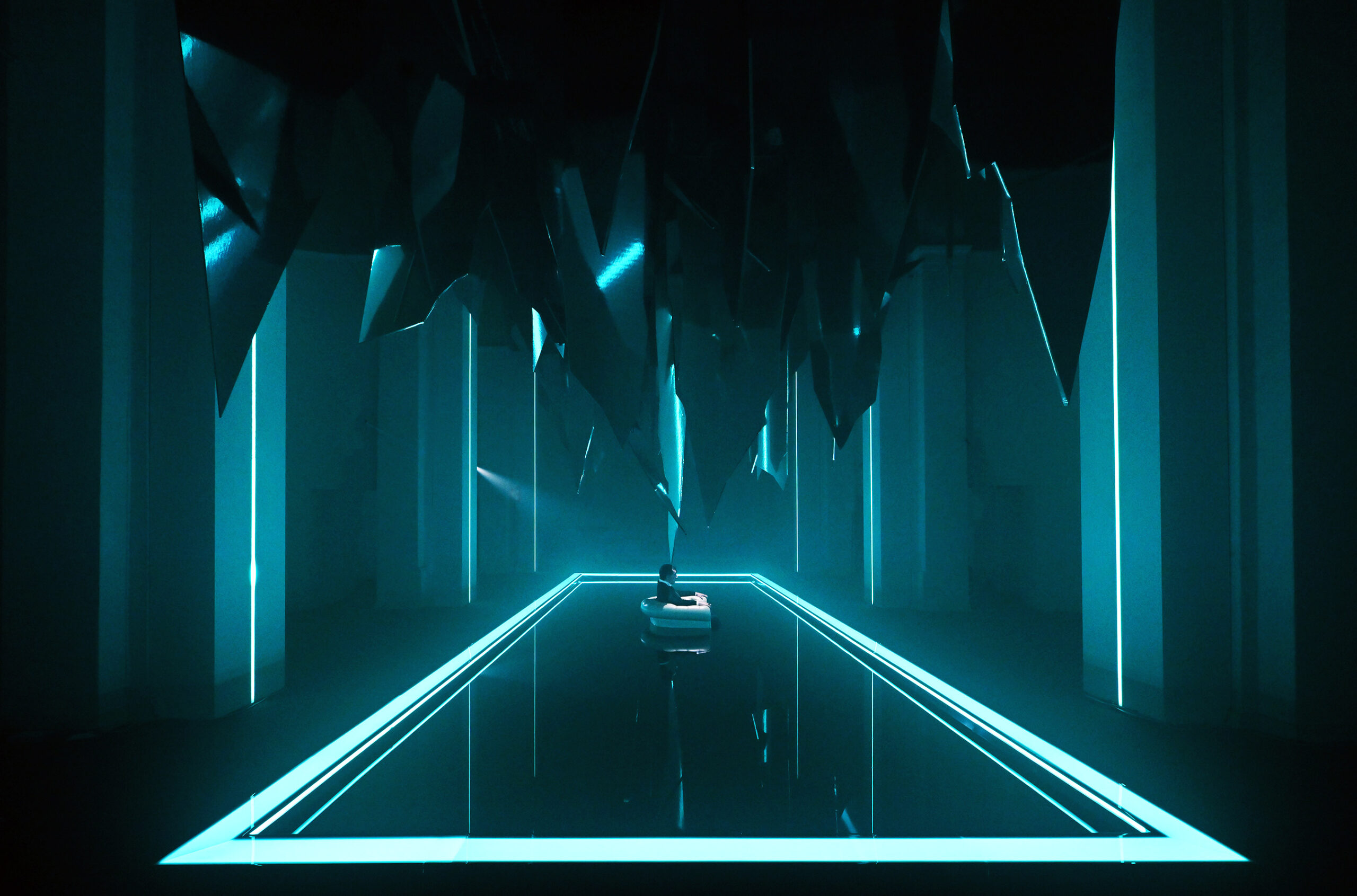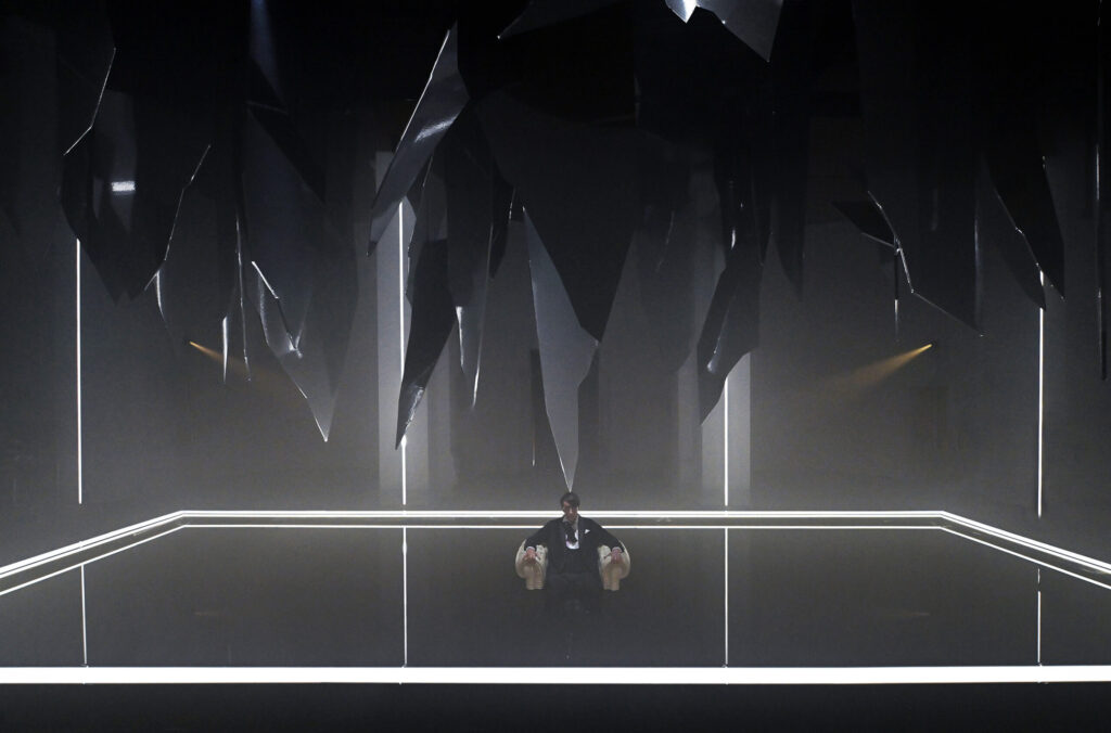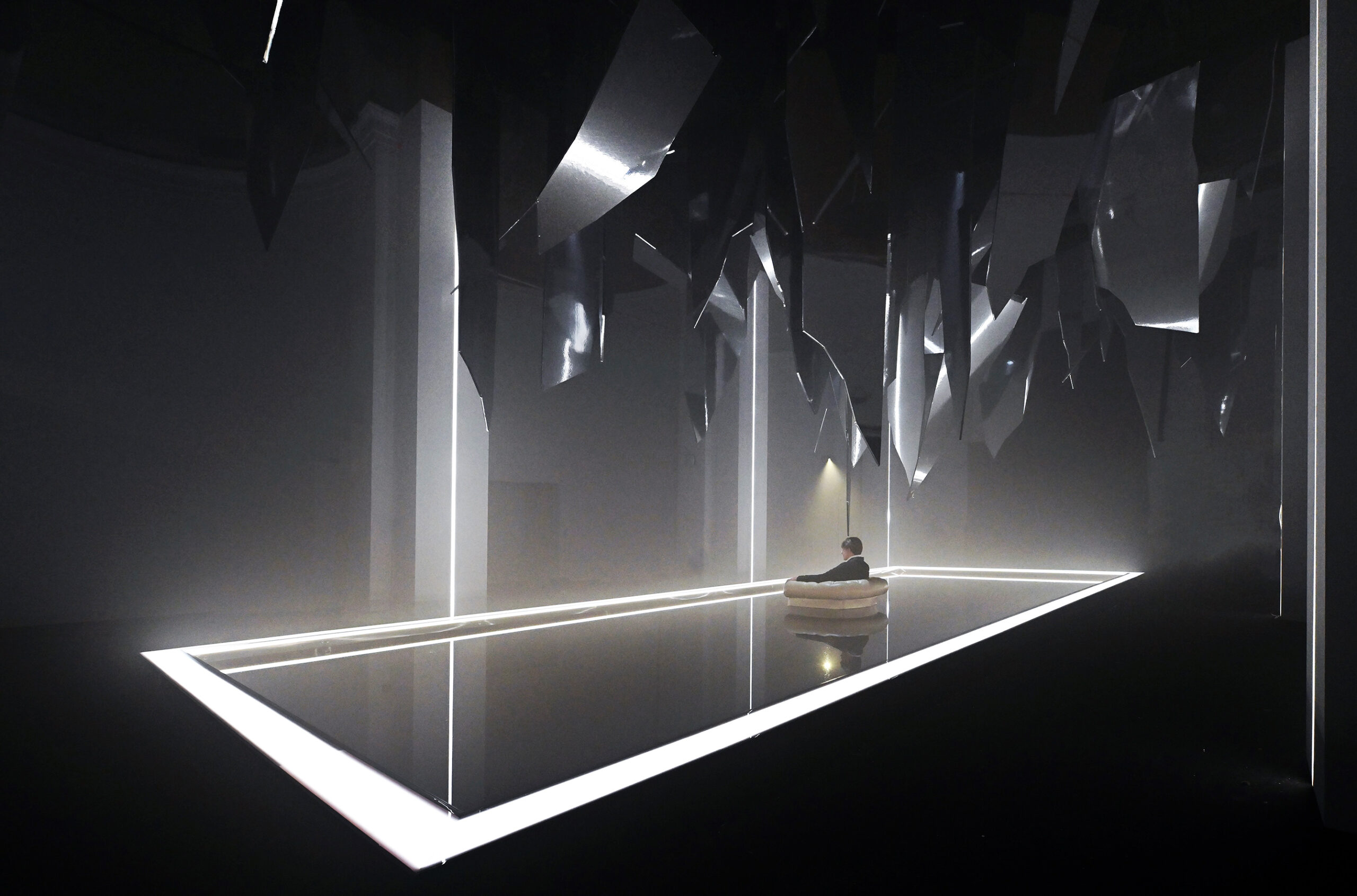 Al centro dello spazio una vasca nella quale sta Macbeth, figura umana iperrealistica che sembra sprofondare in un abisso di acqua nera seduto su una poltrona, simbolo per eccellenza del potere. Lo specchio d’acqua è agitato dalle vibrazioni della musica verdiana prodotta da speciali altoparlanti posti al di sotto della grande vasca. Sopra di lui, frammenti sospesi di specchi, che evocano il suo mondo esploso, un palazzo di cristallo andato in frantumi. «Abbiamo intitolato il progetto Il sonno uccidesti dal libretto verdiano perché sintetizza al meglio l’idea di ossessione – spiega Damiano Michieletto. Macbeth vive in una notte infinita, dove il tempo non scorre e non esiste tregua. L’acqua scura che lo inghiotte è un incubo in continuo movimento, alimentato dalla sua ambizione sconfinata. Sopra di lui, lame di specchi minacciano la caduta del mondo che aveva costruito: il suo peggior incubo che adesso guarda con i suoi stessi occhi».
