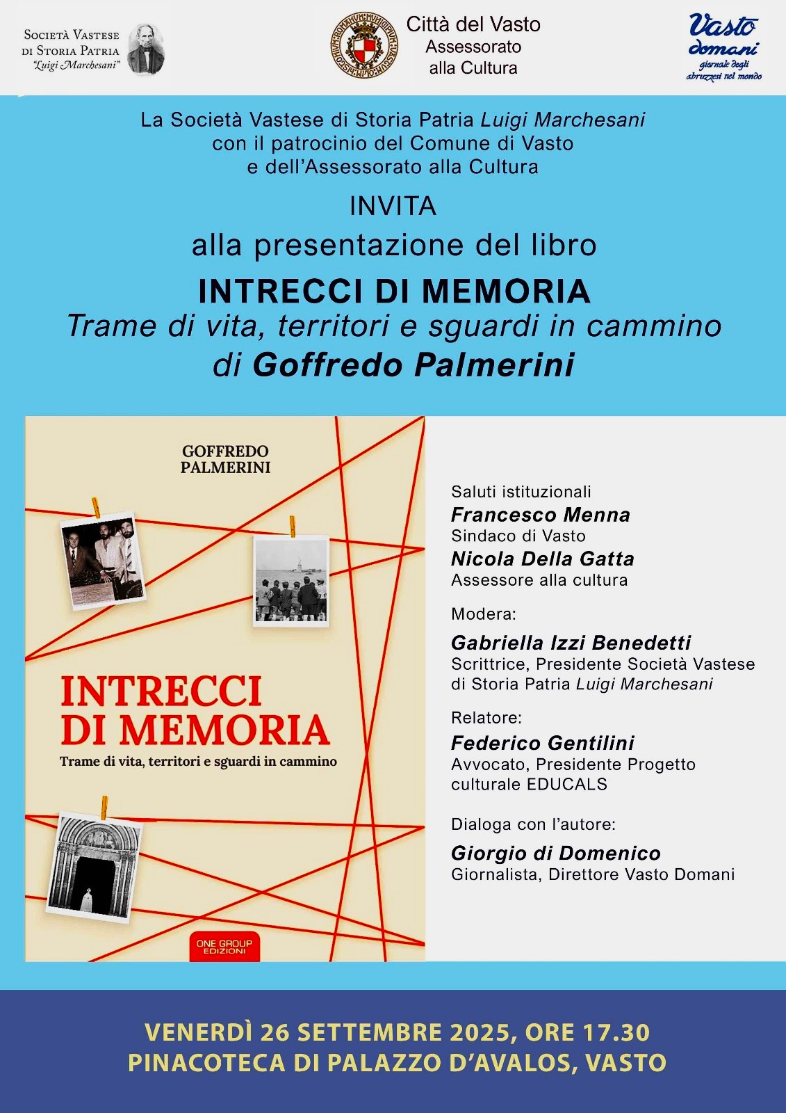 L’AQUILA – Intrecci di memoria, l’ultimo libro di Goffredo Palmerini uscito lo scorso luglio per le Edizioni One Group, sarà presentato il 26 settembre, ore 17:30, a Vasto presso la Pinacoteca dello splendido Palazzo d’Avalos. L’evento, promosso dalla Società Vastese di Storia Patria “Luigi Marchesani” con il patrocinio del Comune, vedrà la partecipazione del sindaco di Vasto, Francesco Menna, che porterà il saluto della Municipalità, e dell’assessore alla Cultura Nicola Della Gatta, con relatori Federico Gentilini, presidente del progetto culturale Educals, Gabriella Izzi Benedetti, presidente della Società Vastese di Storia Patria, e Giorgio Di Domenico, direttore della rivista Vasto domani – assai diffusa anche all’estero tra le comunità abruzzesi -, che dialogherà con l’autore. Il libro presente nelle librerie, è disponibile su tutte le agenzie di vendita online e ordinabile anche presso l’editore One Group (direzione@onegroup.it).