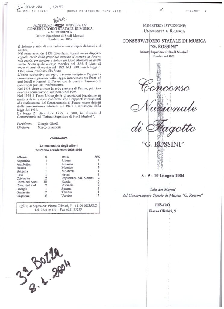 Anche la organizzazione del X° Concorso Internazionale di Fagotto promosso dal Conservatorio Statale Rossini è giunta a conclusione sotto la regia del professor Giuseppe Ciabocchi, attuale titolare della relativa cattedra, e del direttore dell’Istituto Fabio Masini. Vi hanno preso parte giovani interpreti provenienti da 12 diversi Paesi europei ed extraeuropei (anche Cina, Israele e Russia), a conferma della consolidata fama raggiunta da questa competizione pesarese. Sottolinea al riguardo il maestro Michele Mangani, vice direttore dell’Istituto, anch’egli attore attivo del concorso, e, tra l’altro, direttore di celebri concerti tra i quali quello, nel 2008, al Quirinale: il “Concerto di Primavera” volto a richiamare l’attenzione sulla “salvaguardia” del pianeta terra: “Il Concorso di Fagotto di Pesaro ha portato il nome del nostro Conservatorio in tutto il mondo ed è diventato un punto di riferimento per tutti i fagottisti, in quanto i vincitori di questo prestigioso premio sono diventati in seguito dei grandi concertisti che ricoprono ruoli in importanti istituzioni italiane ed estere”. Di rilievo anche le personalità artistiche convenute per l’evento nella città di Rossini quali componenti della giuria: a partire dal presidente, Diego Ceretta, direttore principale dell’ORT – Orchestra Regionale della Toscana – coadiuvato nella scelta dei premiandi da solisti di fama e prime parti delle più importanti orchestre italiane e straniere: Giuseppe Ciabocchi, Carlo Colombo, Francesco Di Rosa, Nadia Perathoner, Gabriele Screpis, Milan Turkovic. Questi è stato chiamato anche a dirigere l’orchestra del Conservatorio Statale Rossini per il concerto dedicato al vincitore. Ma il primo premio non è stato assegnato mentre seconde ex-equo sono state proclamate Lopes Bárbara (Portogallo) e Martina Miniussi (Italia) – esse quindi figure di primo piano del concerto – mentre terzo è risultato Li Tianyou (Cina).