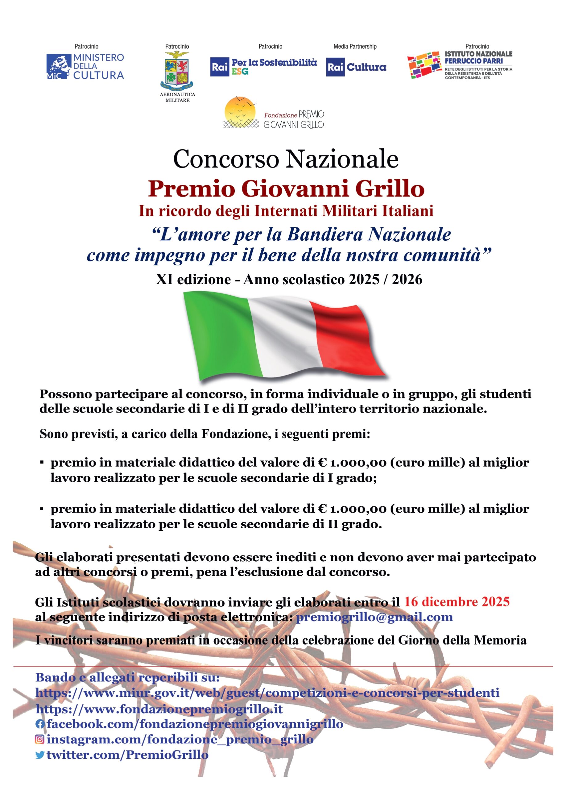 il bando di concorso dell’undicesima edizione del Premio Nazionale Giovanni Grillo, dedicato alle migliaia di Internati Militari Italiani della Seconda Guerra Mondiale, dal titolo: