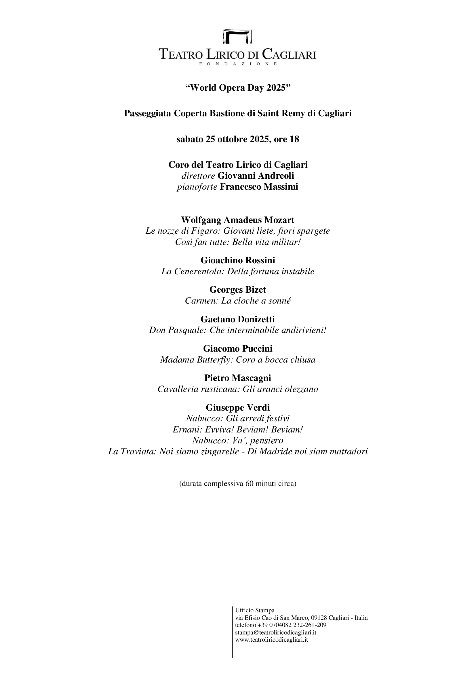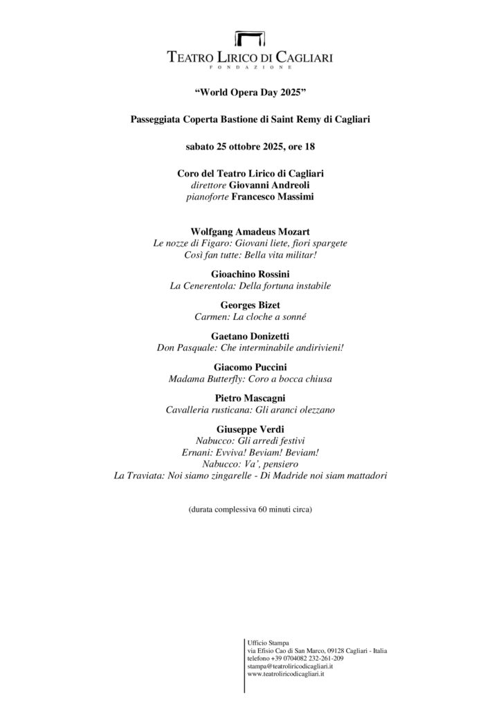 Sabato 25 ottobre alle 18 nella Passeggiata Coperta del Bastione di Saint Remy di Cagliari, il Coro del Teatro Lirico diretto da Giovanni Andreoli, propone un concerto straordinario, con un programma musicale che presenta una serie di celeberrime pagine corali tratte da altrettanto celebri e popolari opere liriche, in occasione del “World Opera Day 2025”, manifestazione promossa da Opera Europa, principale organizzazione di servizio per compagnie liriche professionali e festival lirici in tutta Europa, e con il patrocinio del Comune di Cagliari. L’accompagnamento musicale al pianoforte è di Francesco Massimi.