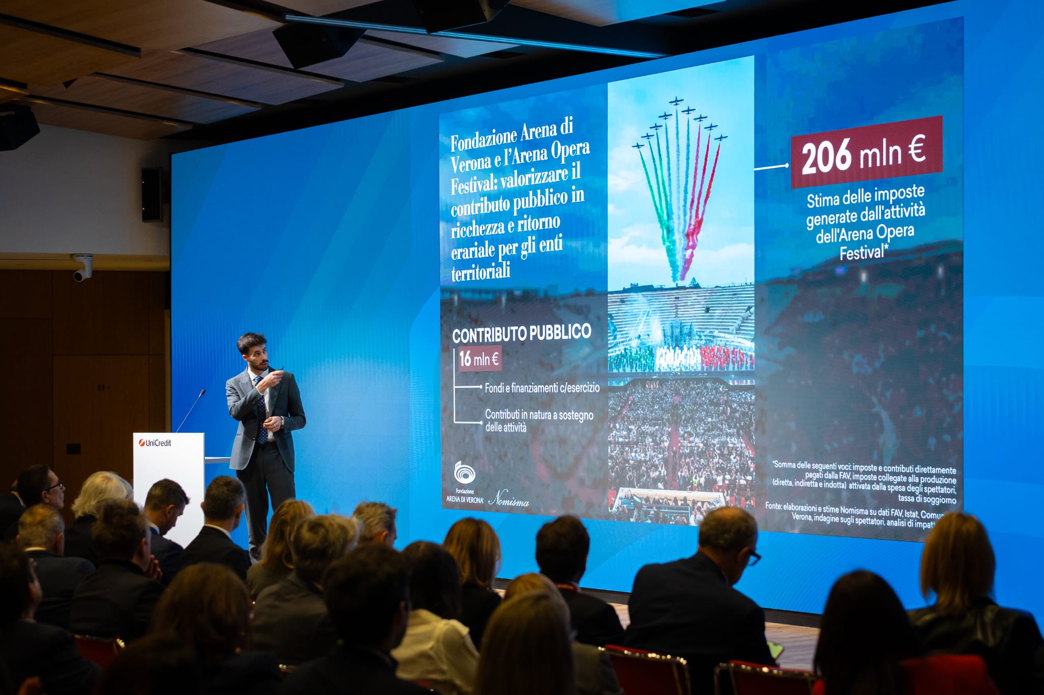 Presenti il Sottosegretario alla Cultura Gianmarco Mazzi, il Sovrintendente di Fondazione Arena Cecilia Gasdia, con il Vicedirettore artistico Stefano Trespidi, il Presidente Nomisma Paolo De Castro, per UniCredit Francesco Mario Iannella, Head of Regione North East, e Stefano Gallo, Head of Territorial Development, e il Presidente di Fondazione Cariverona Bruno Giordano. A moderare l’evento la giornalista Sarah Varetto.