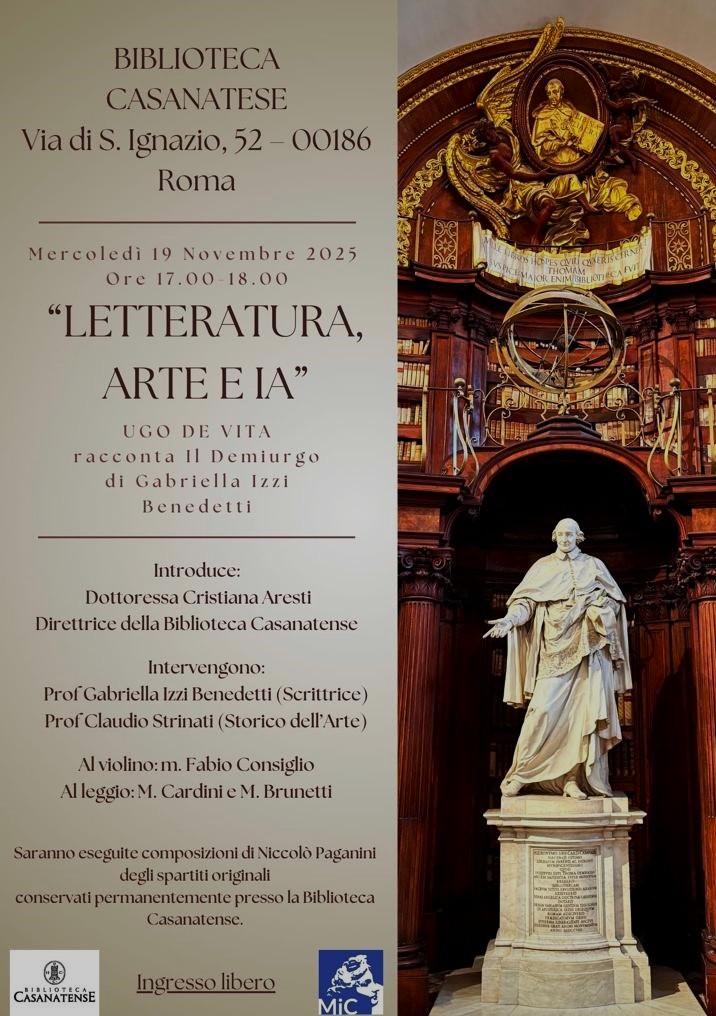 ROMA – Il Ministero dei Beni culturali ospita, nella prestigiosa Biblioteca Casanatense in Via di S. Ignazio 52a Roma, il recital di Ugo De Vita tratto dal romanzo Il Demiurgo di Gabriella Izzi Benedetti. L’evento si terrà mercoledì 19 novembre dalle ore 17:00. La messa in scena è alla sua terza realizzazione, dopo Firenze e Vasto, accolto con grande entusiasmo per la suggestione di un racconto che mette in guardia dai pericoli della scienza, quando essa oltrepassa i valichi dell’etica e crea nell’essere umano la tentazione di gestire la vita e le menti altrui.