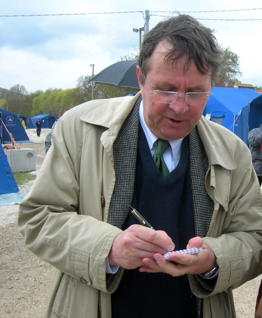 Alcuni giorni dopo il sisma Paul mi chiese di aiutarlo a ricostruire l’eccidio di Onna, nel quale furono assassinati 17 civili nel giugno 1944, con l’esercito tedesco ormai in ritirata. Il richiamo a quella tragedia era riecheggiato sulla stampa internazionale, ma Paul desiderava saperne di più di quella storia in quella frazione divenuta epicentro del terremoto. Anni prima avevo visto per caso, recandomi a L’Aquila, la locandina di una piccola mostra sul ritrovamento di alcune foto immediatamente successive alla strage. Non ricordo nemmeno come, ma riuscii a rintracciare Aldo Scimia che organizzò quella mostra insieme al giornalista Giustino Parisse. Con Paul ci demmo l’appuntamento alle porte di Onna, dove era stata allestita la tendopoli. Scimia era riuscito a tirar fuori dalla sua casa in macerie alcune foto custodite tra fogli di plastica infangati, che vedemmo insieme, sul cofano della sua auto. Ricordo ancora che in quei momenti sentimmo una lunga scossa superficiale sotto i nostri piedi. Facemmo poi un giro in silenzio tra le rovine del paese, mentre Paul annotava, accompagnata dall’inseparabile moglie Ellen, che parlava l’italiano meglio di lui, che invece era più a suo con l’inglese. Parlammo poco quel giorno. Paul era pensoso, osservava tutto con attenzione, raccoglieva appunti. Sentì profonda solidarietà per quella piccola comunità.
