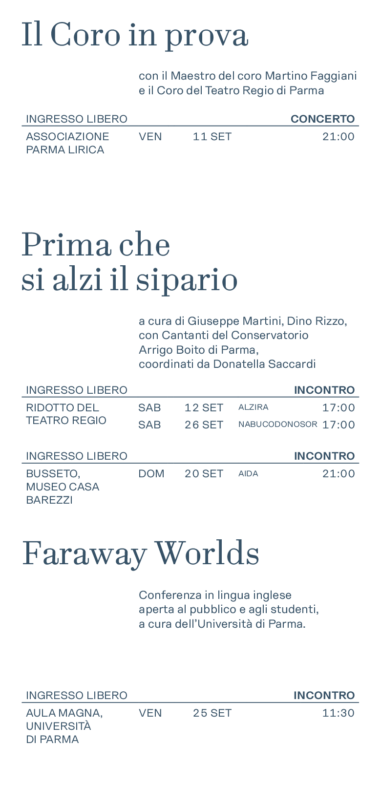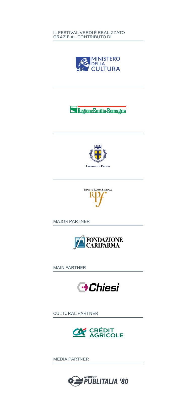 Il Festival Verdi è realizzato grazie al contributo di Ministero della Cultura, Regione Emilia-Romagna, Comune di Parma, Reggio Parma Festival. Major partner Fondazione Cariparma. Main partner Chiesi. Cultural partner Crédit Agricole. Media partner Mediaset Publitalia ’80. Main sponsor Iren, Barilla. Sponsor Unione Parmense degli Industriali, Opem, Dallara, Agugiaro e Figna, Mutti, Amoretti. Identity partner Parma Calcio. Educational partner Parmalat. Sostenitori La Giovane, Glove ICT, Grasselli, Cavalca, CePIM, Bstrò, Sicim, Colser, Delicius. Mobility partner Tep. Tour Operator Partner Parma Incoming. Radio Ufficiale Radio Monte Carlo. Fairplay Partner Zebre Parma. Wine partner Oinoe. Digital counselling Unsocials. Con il supporto di “Parma, io ci sto!”. Legal counselling Villa&Partners. Partner scientifico Istituto Nazionale di Studi Verdiani. Special thanks to International Friends of Festival Verdi. Con il contributo di Comune di Busseto, Ascom e Ascom Confcommercio Parma Fondazione, Camera di Commercio dell’Emilia, Fondazione Monte Parma. Sostenitori tecnici DS Solutions, Milosped, Teamwork, Graphital. Partner artistici e istituzionali Coro del Teatro Regio di Parma, Conservatorio “Arrigo Boito” di Parma, Società dei Concerti di Parma, La Toscanini, Teatro Comunale di Bologna. Il Teatro Regio aderisce a Parma Città Climate Neutral 2023, ATIT, AGIS, Comitato per la Salvaguardia dell’Arte del Canto Lirico Italiano, Fedora, Opera Europa, Opera Vision, Emilia taste, nature & culture.